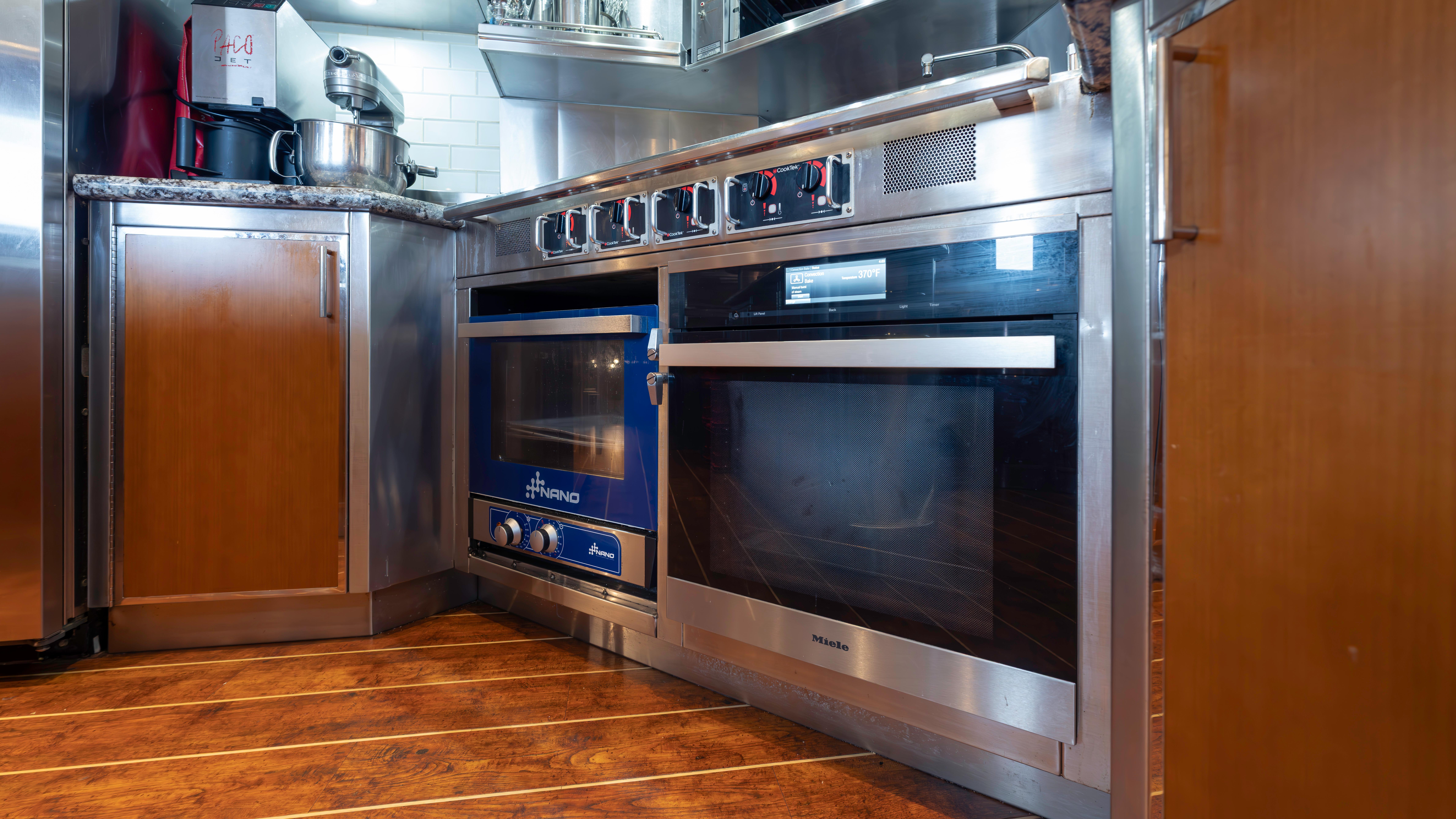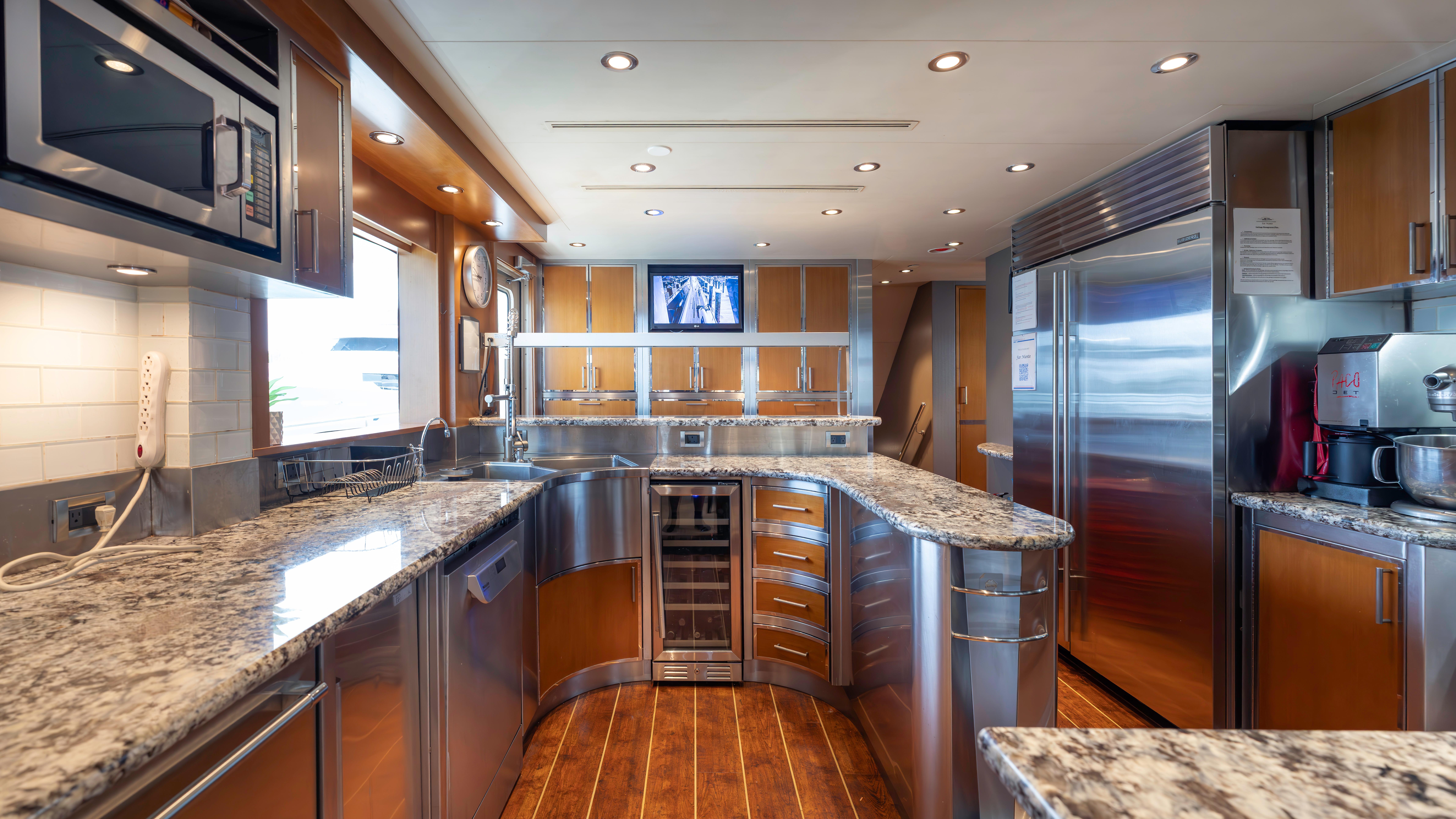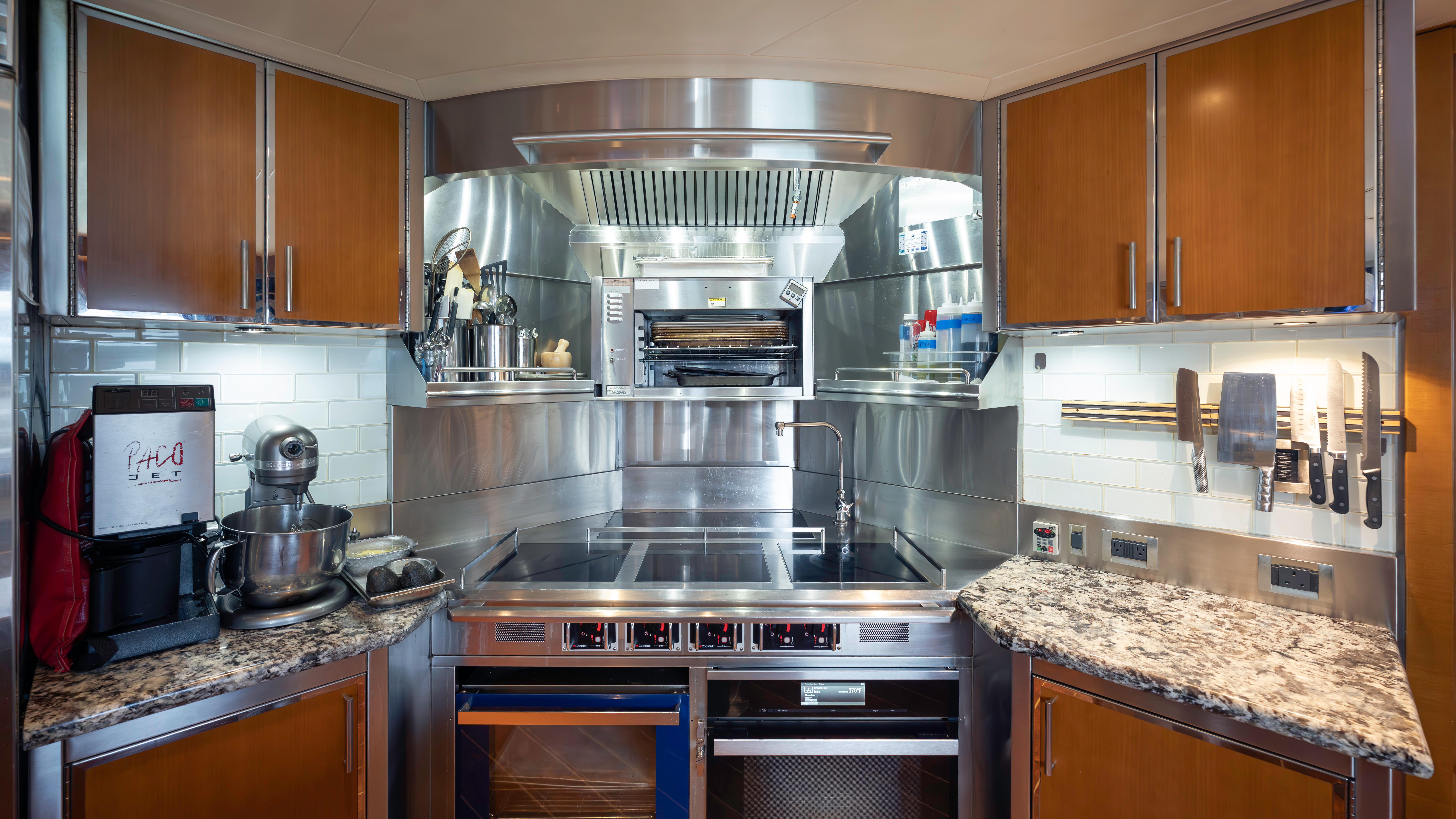 Профессиональный камбуз из нержавеющей стали полностью оборудован и включает большой остров с барной стойкой и табуретами для гостей или экипажа. Современная техника, отличные возможности хранения и обилие света делают этот камбуз идеальным для любого профессионального шеф-повара.