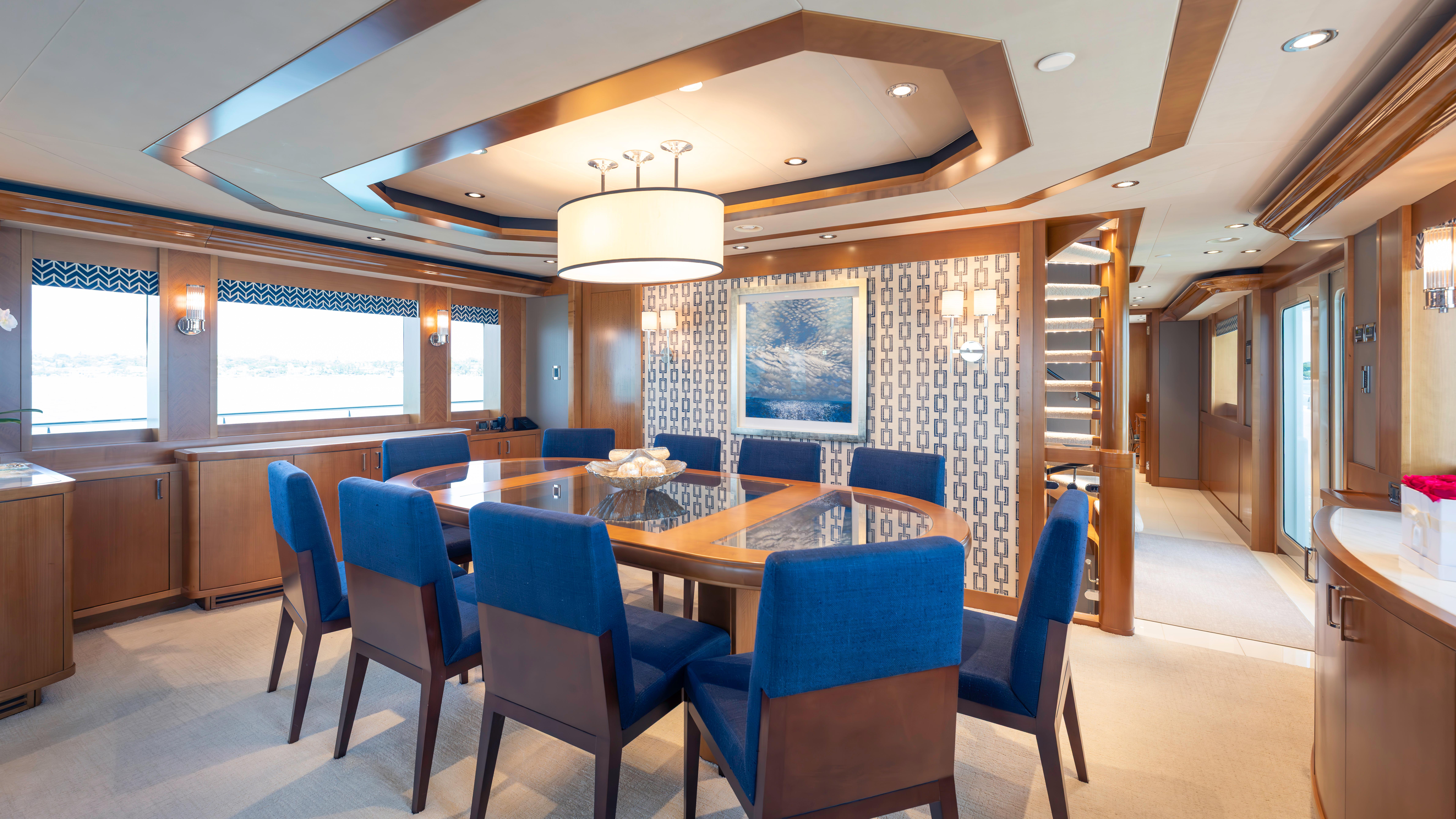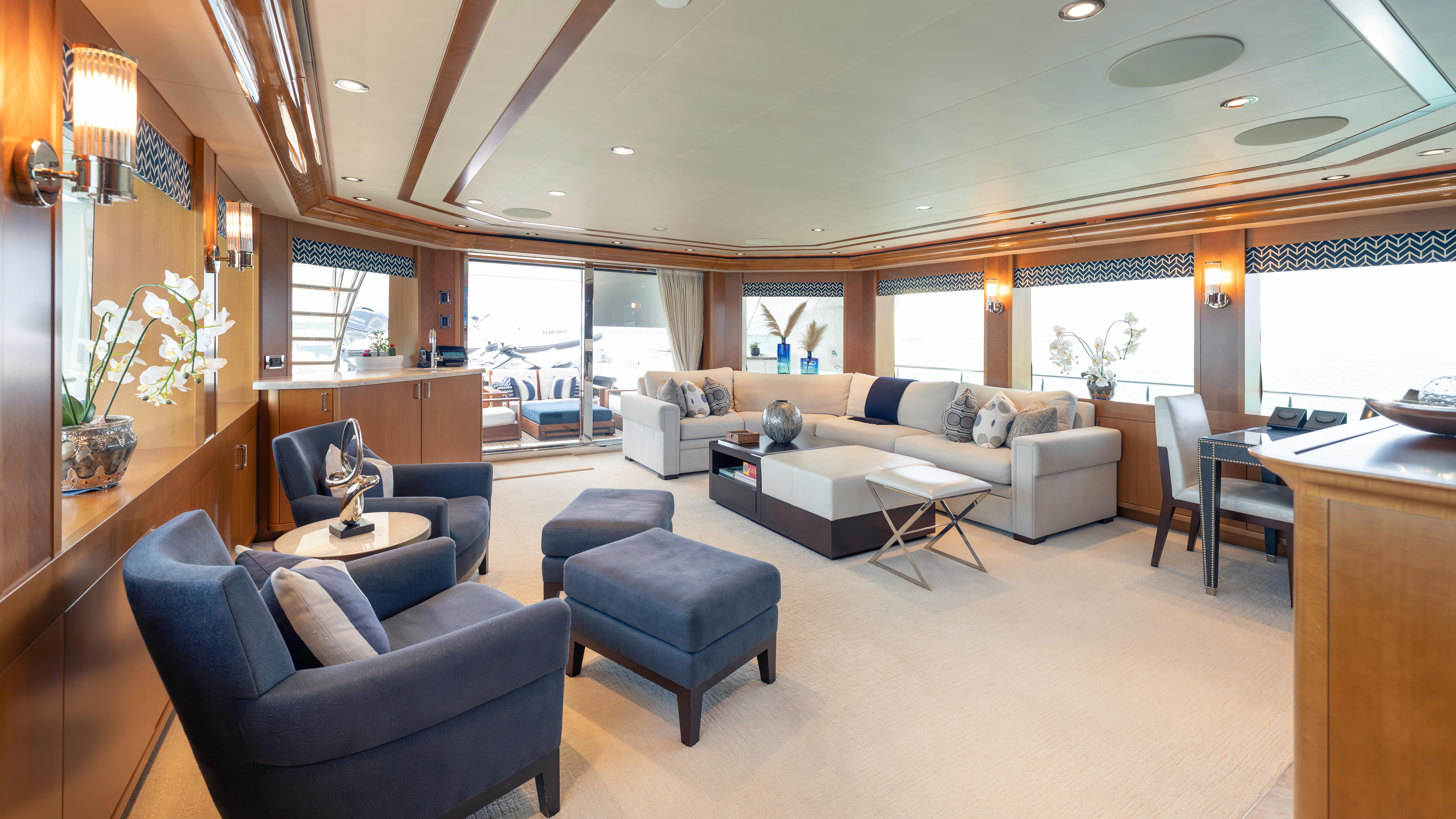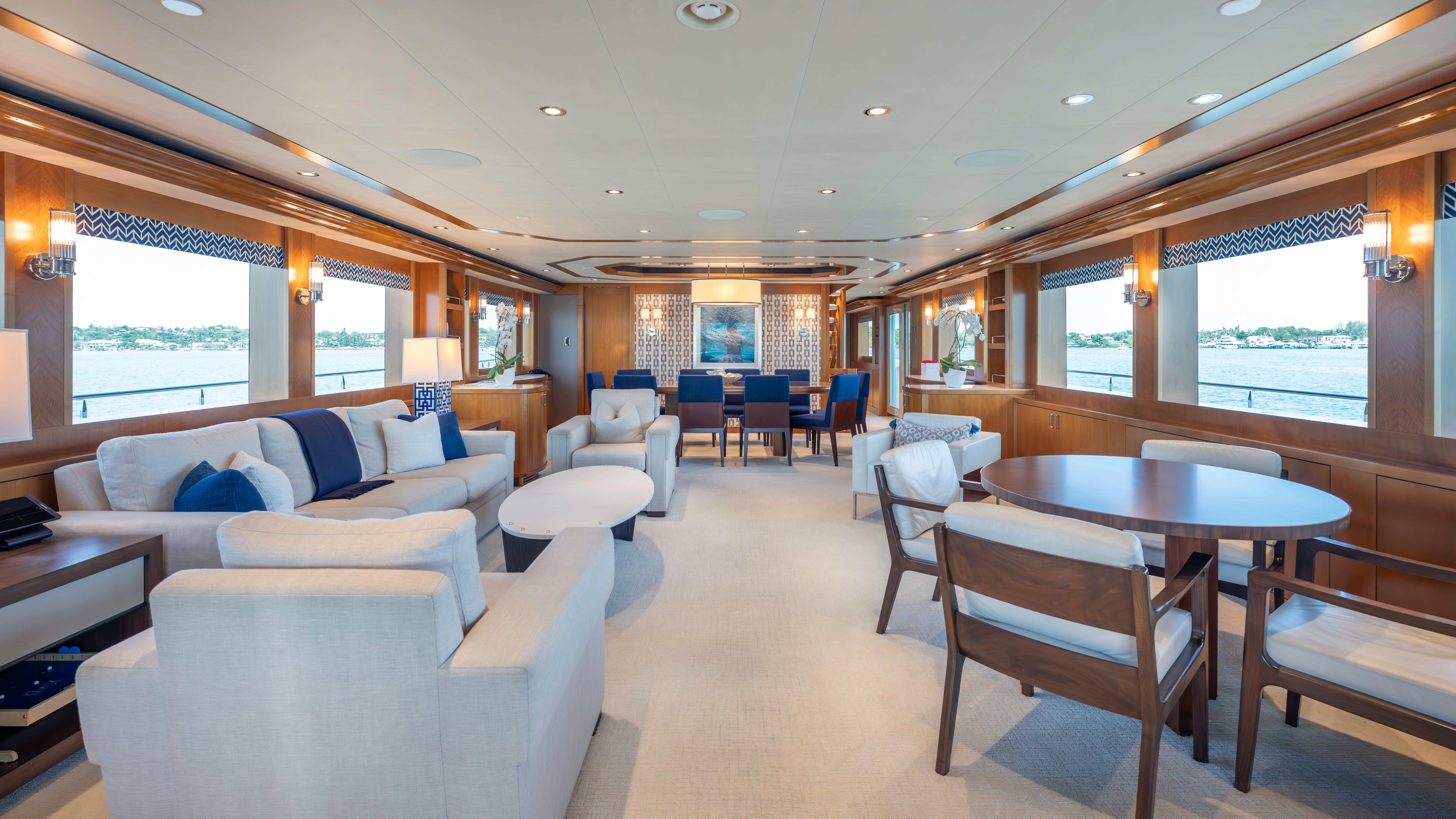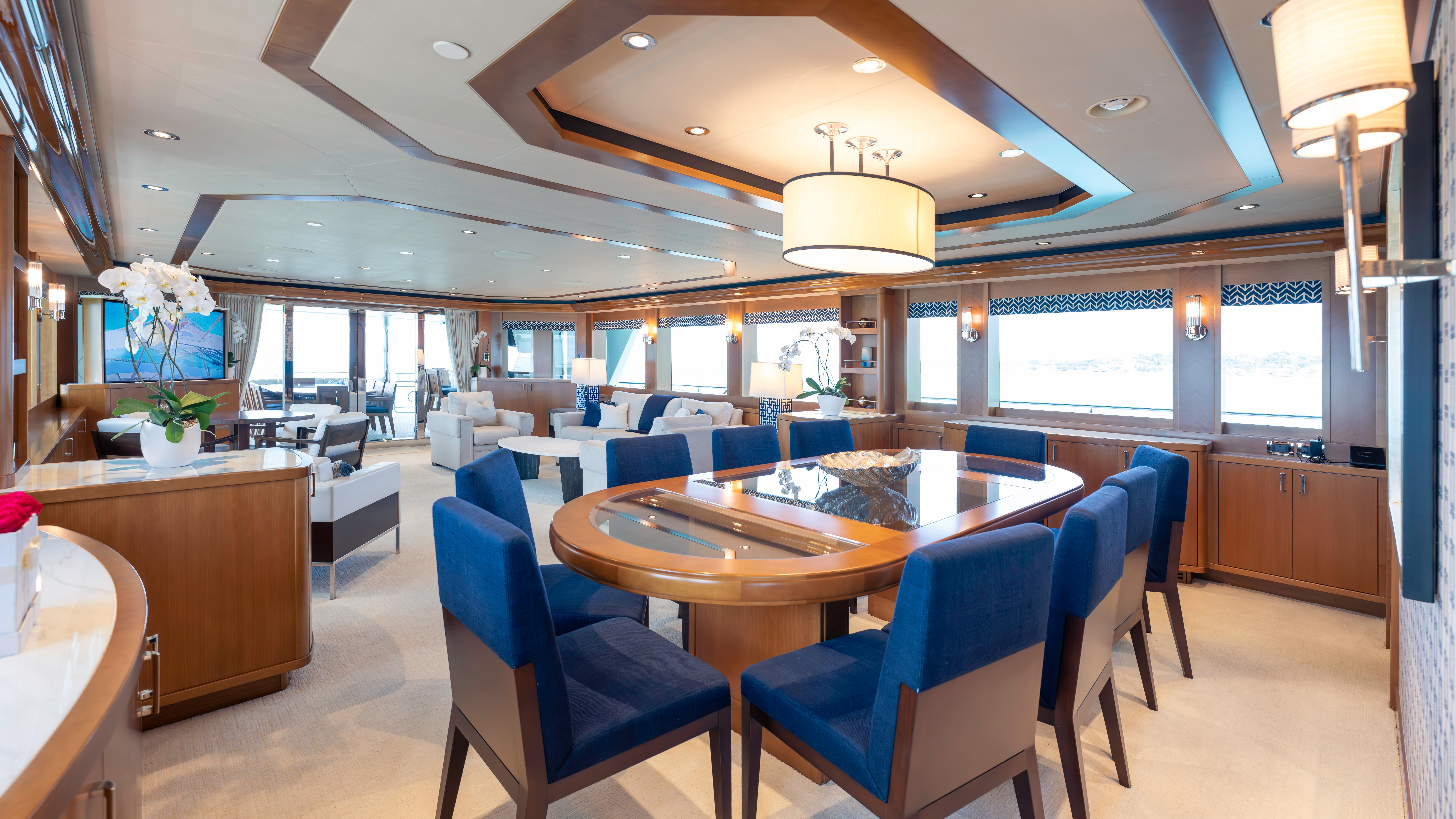 При входе в главный салон с кормы (через автоматические двойные стеклянные двери) открывается просторная зона отдыха с элегантными диванами, пуфами и креслами. Панорамные окна наполняют пространство естественным светом и подчёркивают великолепные виды. В носовой части расположен формальный обеденный салон на 10 гостей с буфетом из махагони с приподнятыми панелями и двумя винными холодильниками для удобного обслуживания.