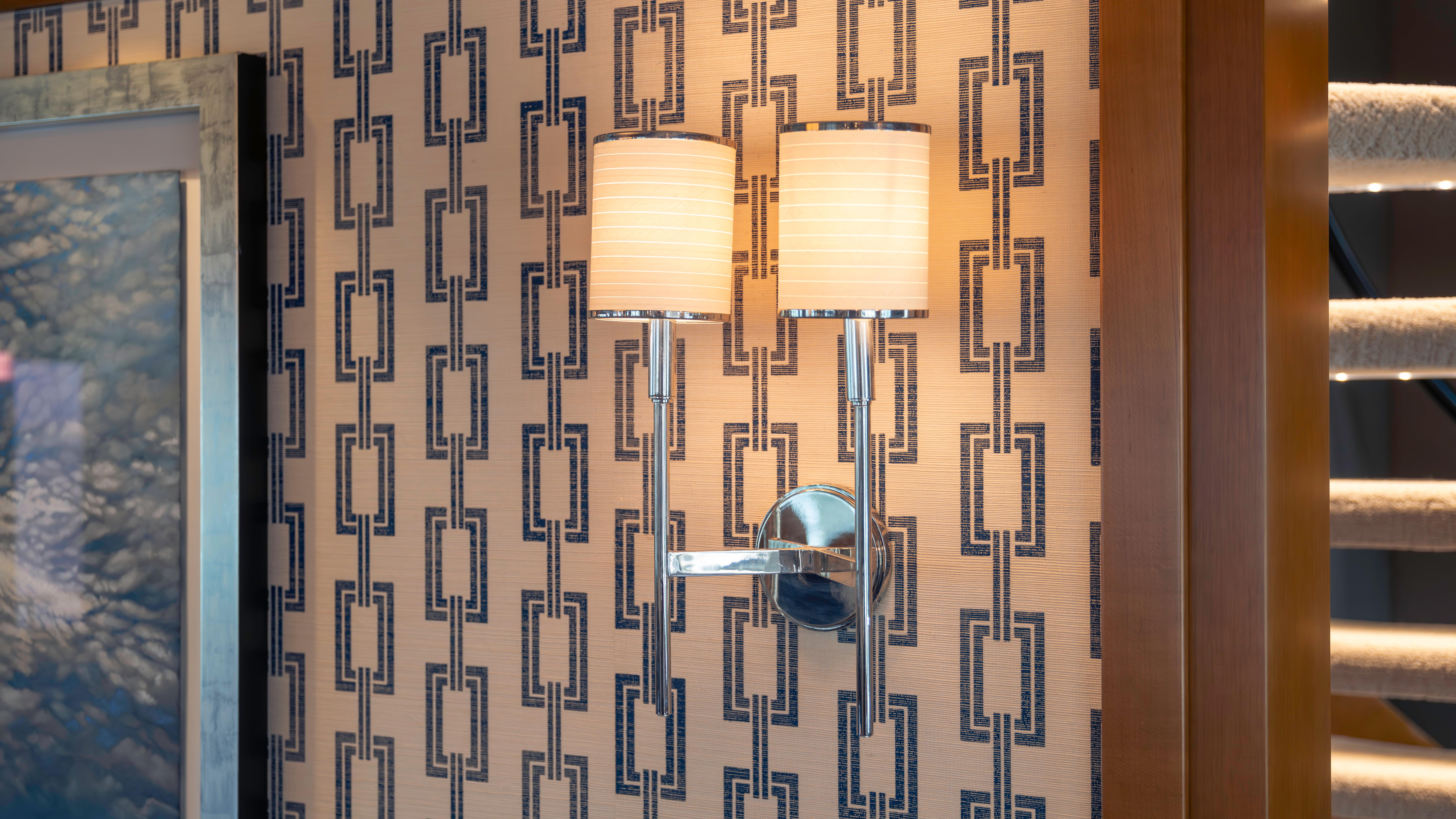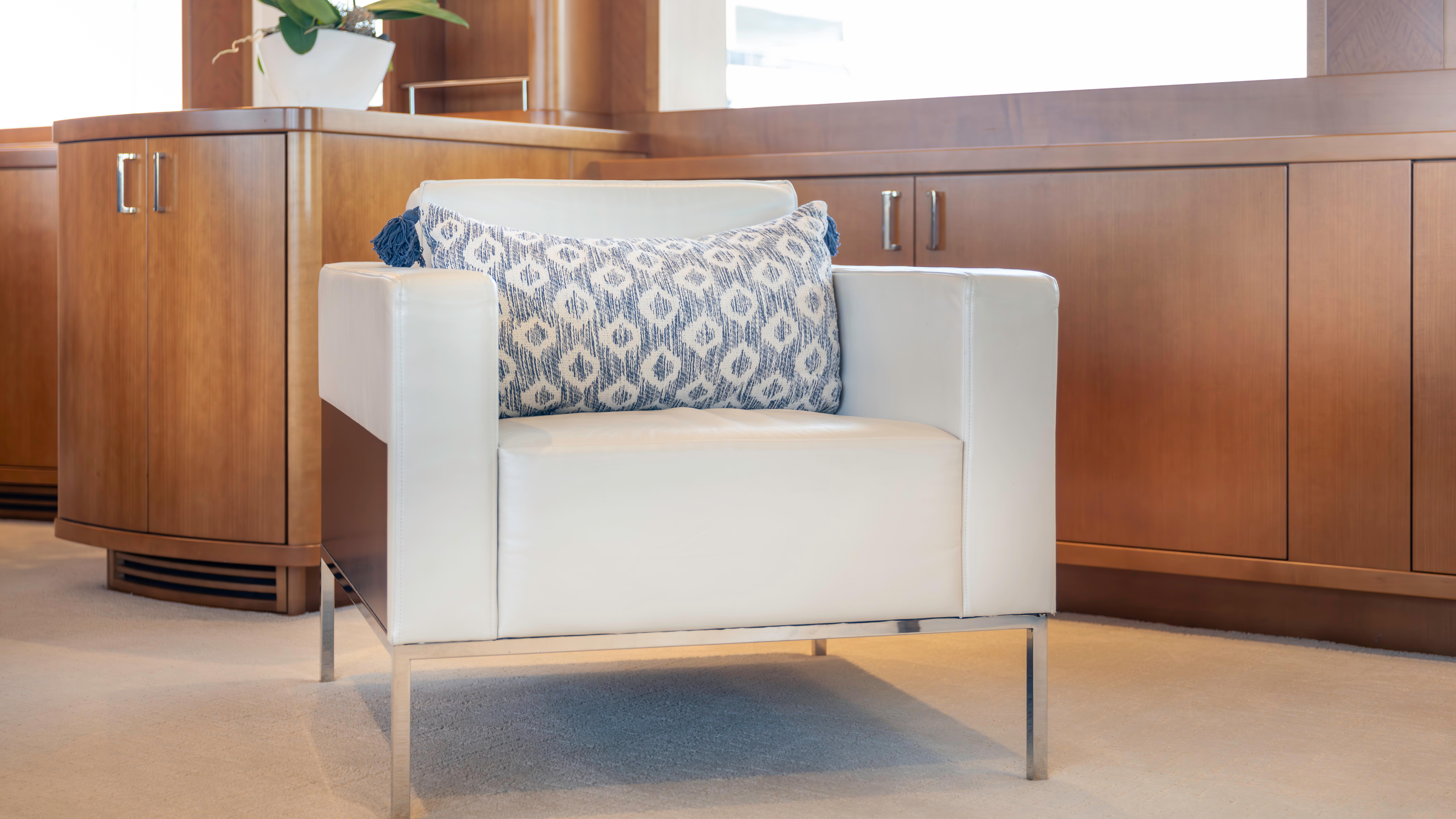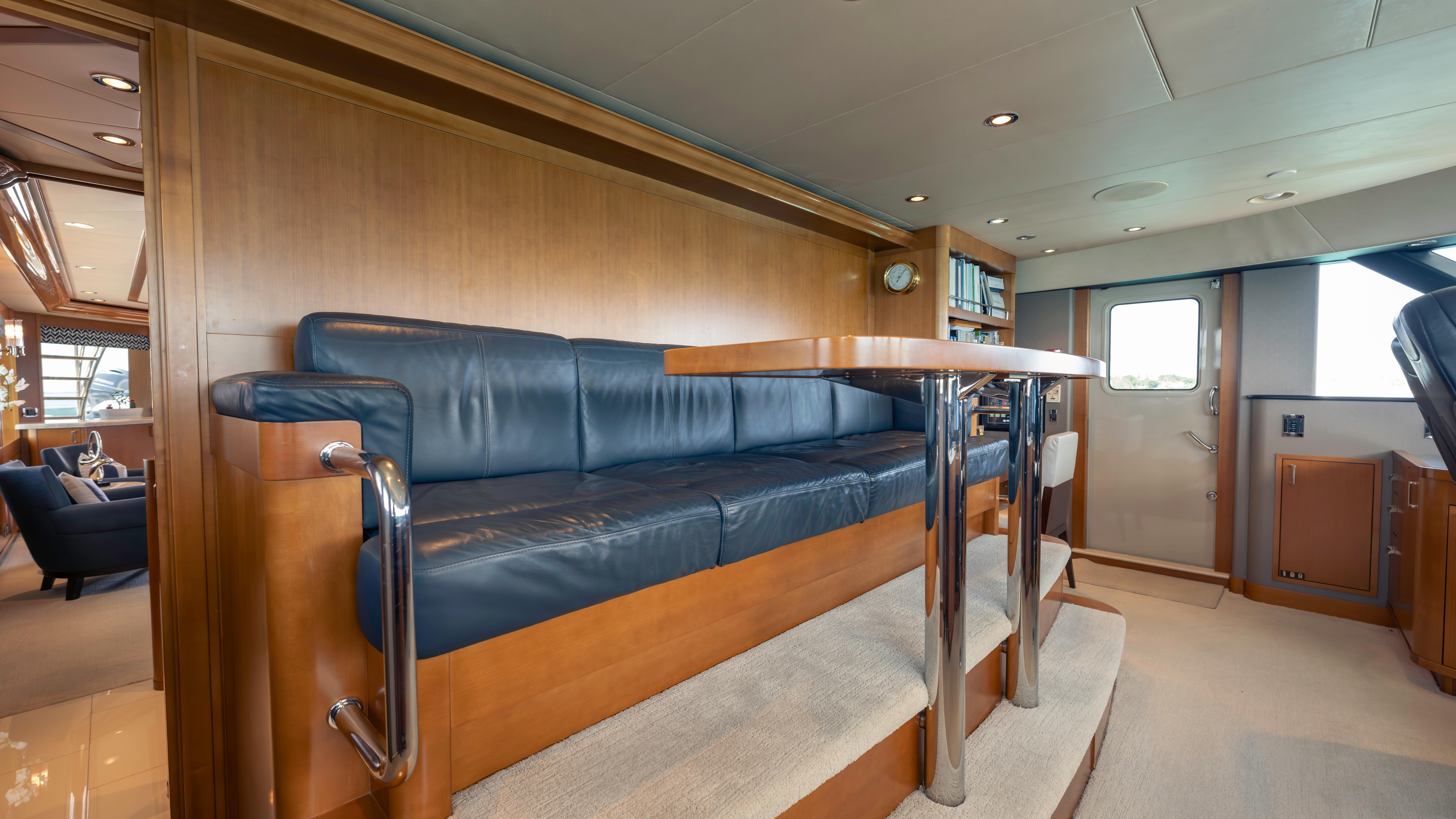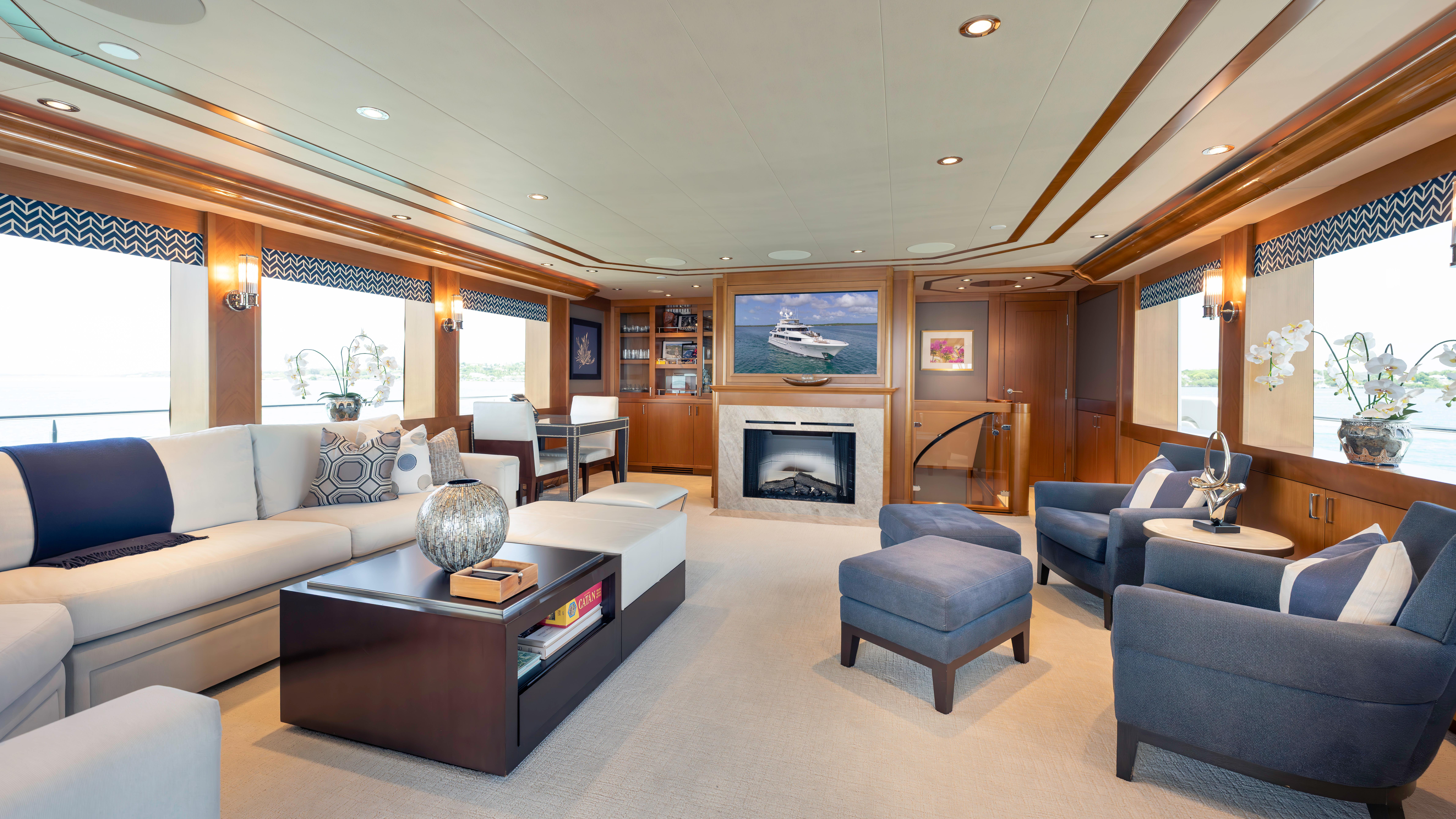 При входе в главный салон с кормы (через автоматические двойные стеклянные двери) открывается просторная зона отдыха с элегантными диванами, пуфами и креслами. Панорамные окна наполняют пространство естественным светом и подчёркивают великолепные виды. В носовой части расположен формальный обеденный салон на 10 гостей с буфетом из махагони с приподнятыми панелями и двумя винными холодильниками для удобного обслуживания.