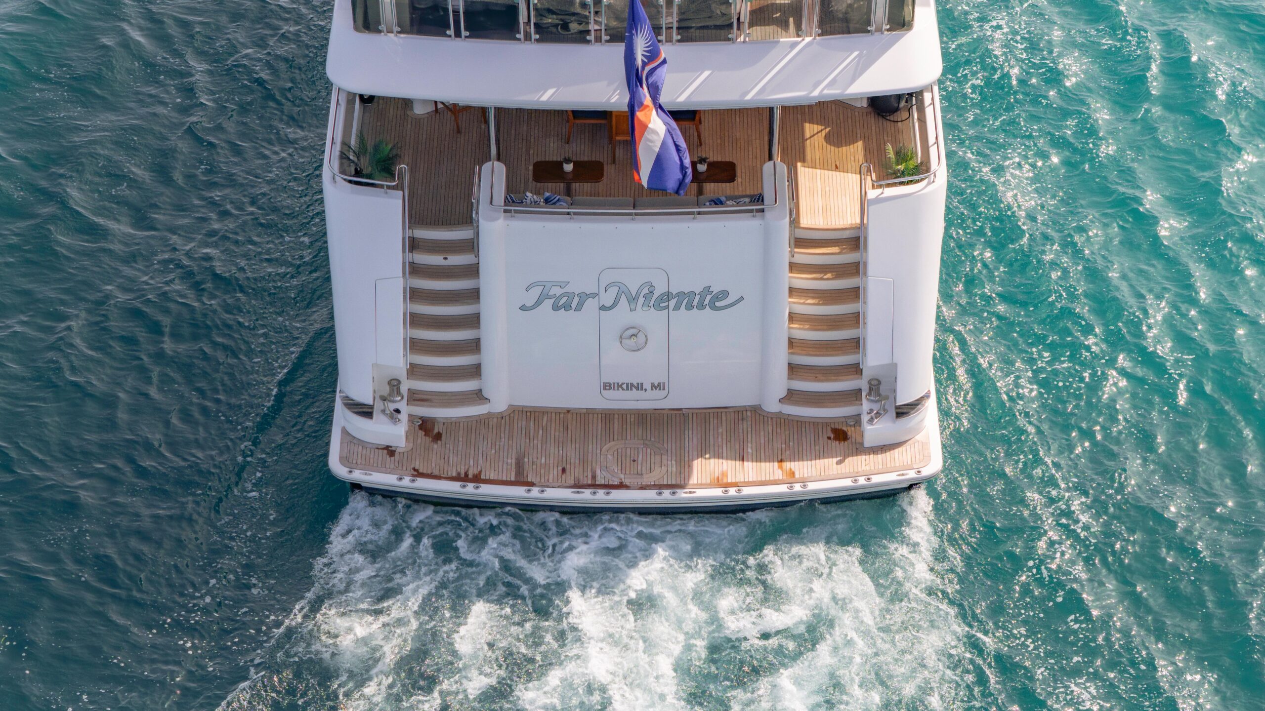 Поднявшись на корму главной палубы FAR NIENTE по гидравлической пассарели, вы попадаете в просторную крытую обеденную зону на открытом воздухе, рассчитанную до 10 гостей. Здесь также расположен полностью оборудованный мокрый бар с местами для сидения и большим телевизором с плоским экраном. Эта зона идеально подходит для коктейлей и приёмов пищи как на якоре, так и у причала, а во время мероприятий может комфортно вместить от 18 до 20 гостей. Несколько ступенек вниз — и купальная платформа обеспечивает удобный доступ к воде, тендеру и водным игрушкам.