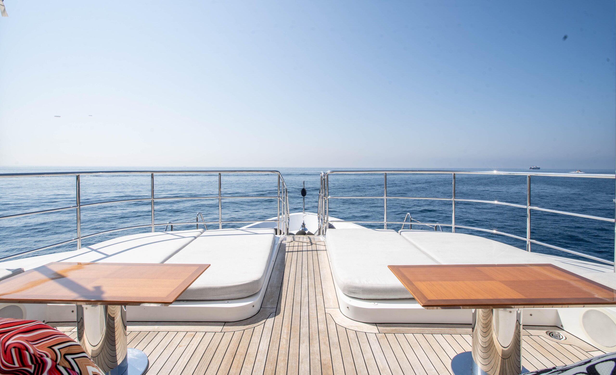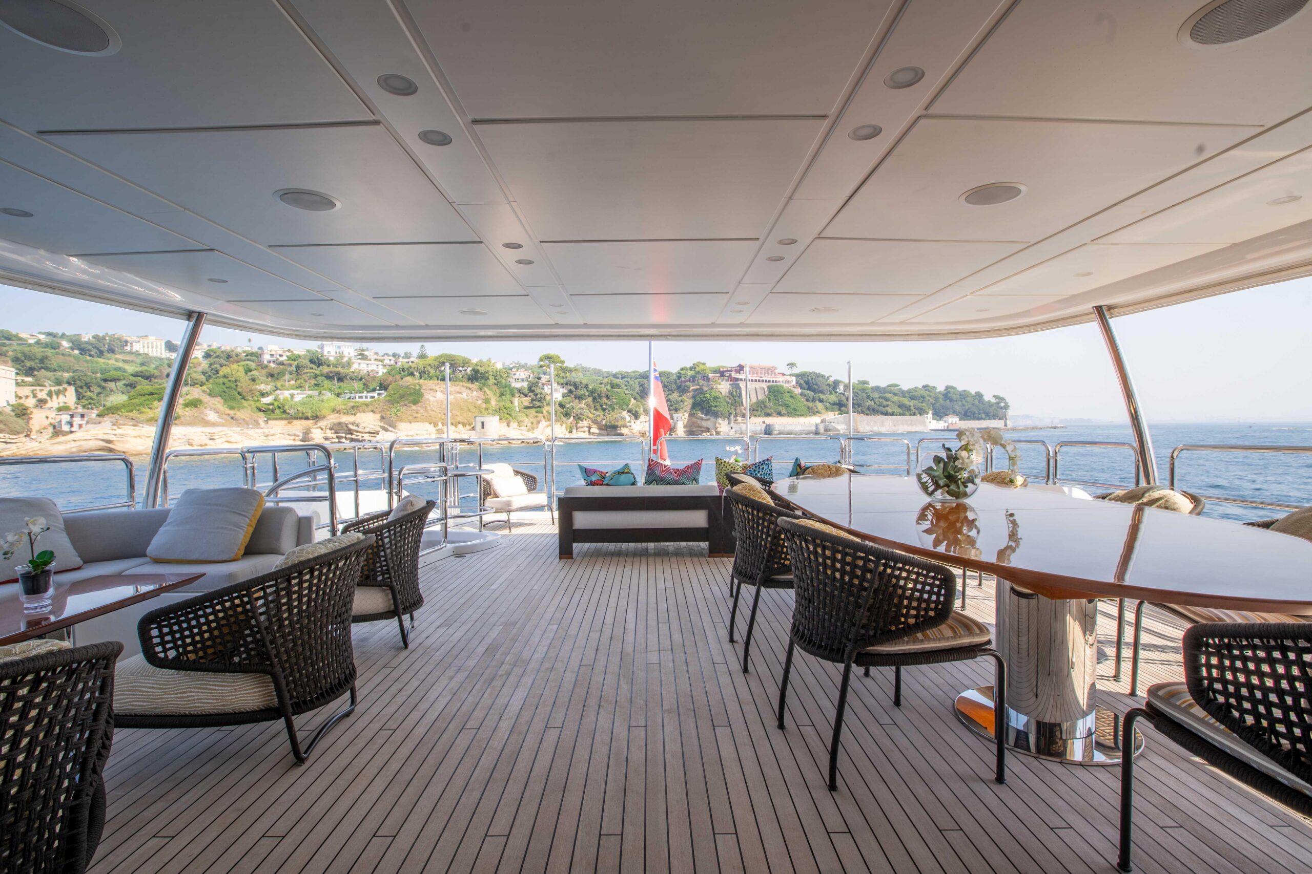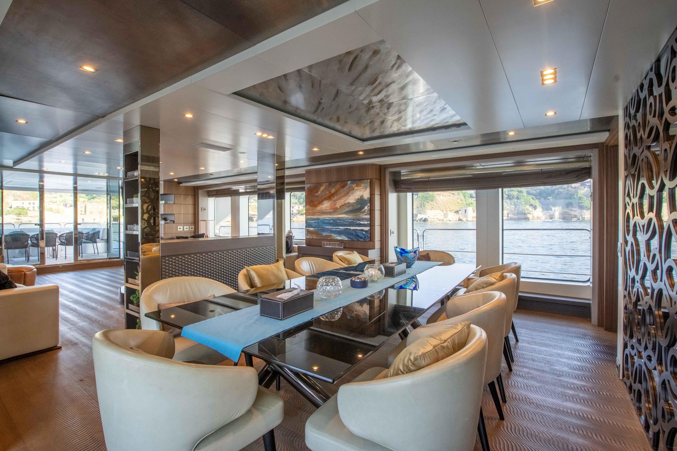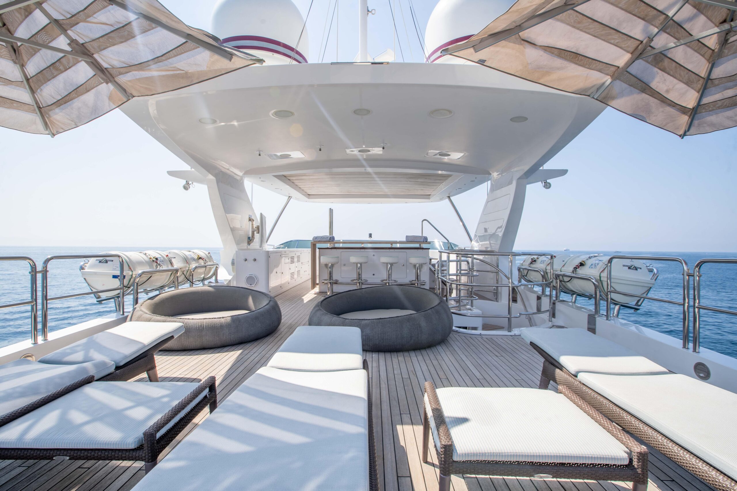 Главный салон наполнен естественным светом, создавая просторную и комфортную атмосферу, а скай-лаунж, идеально подходящий для просмотра на большом экране, выходит на впечатляющую кормовую палубу. Сандек прекрасно подходит для отдыха и совместного времяпрепровождения и оснащён большим джакузи, окружающими его лежаками и индивидуальными шезлонгами в кормовой части. Для максимального комфорта гостей на сандеке также предусмотрены большая раздвижная крыша и система орошения.