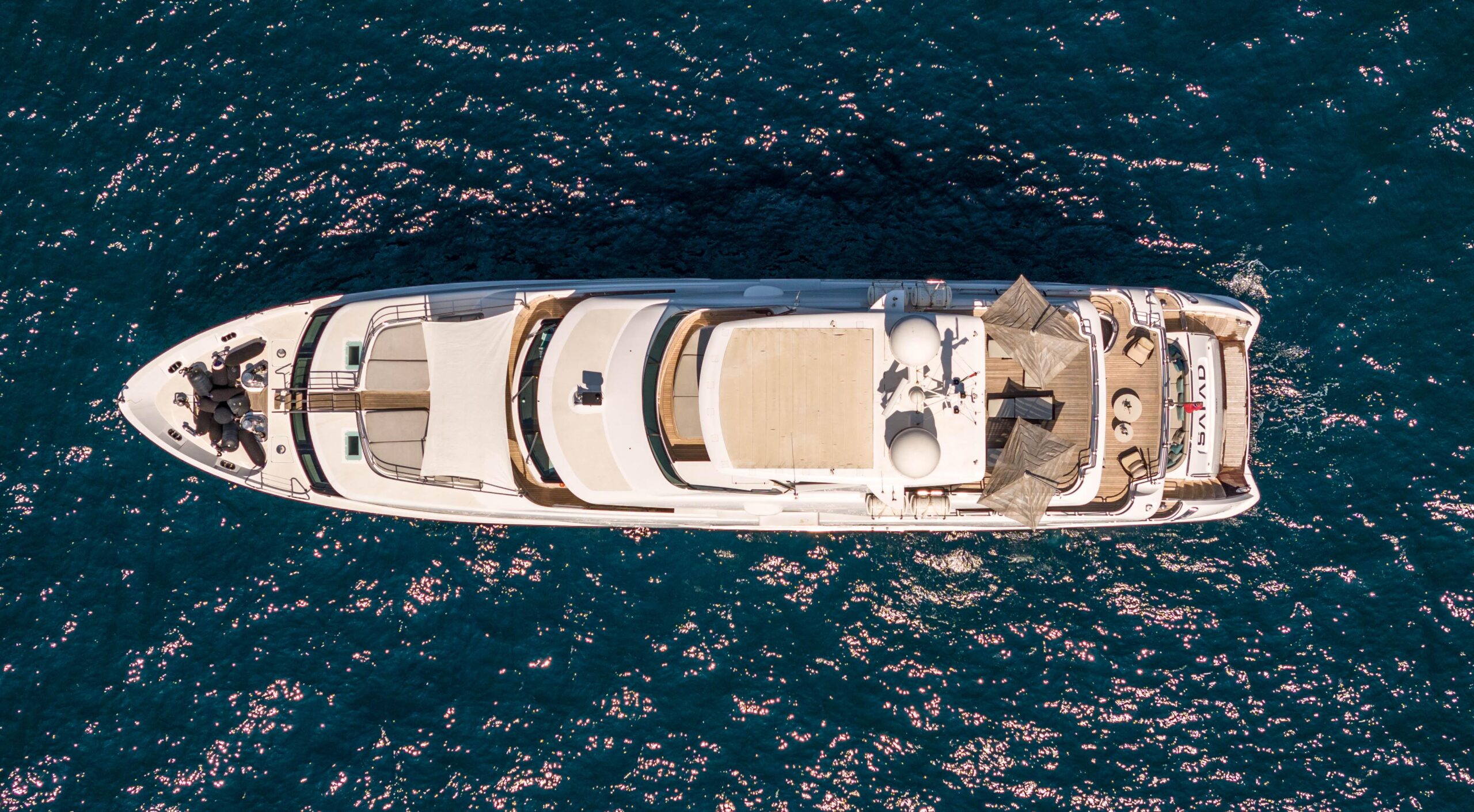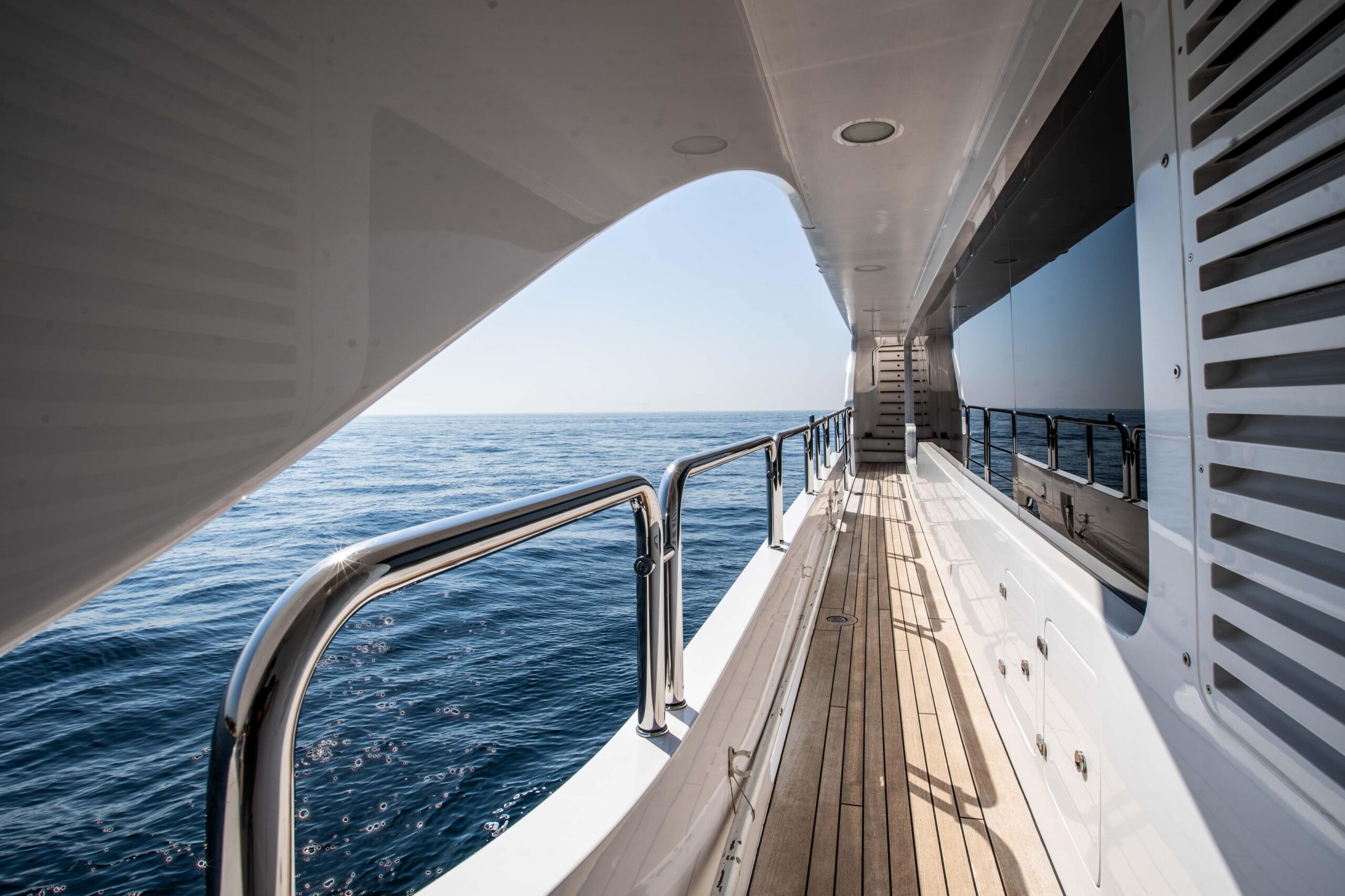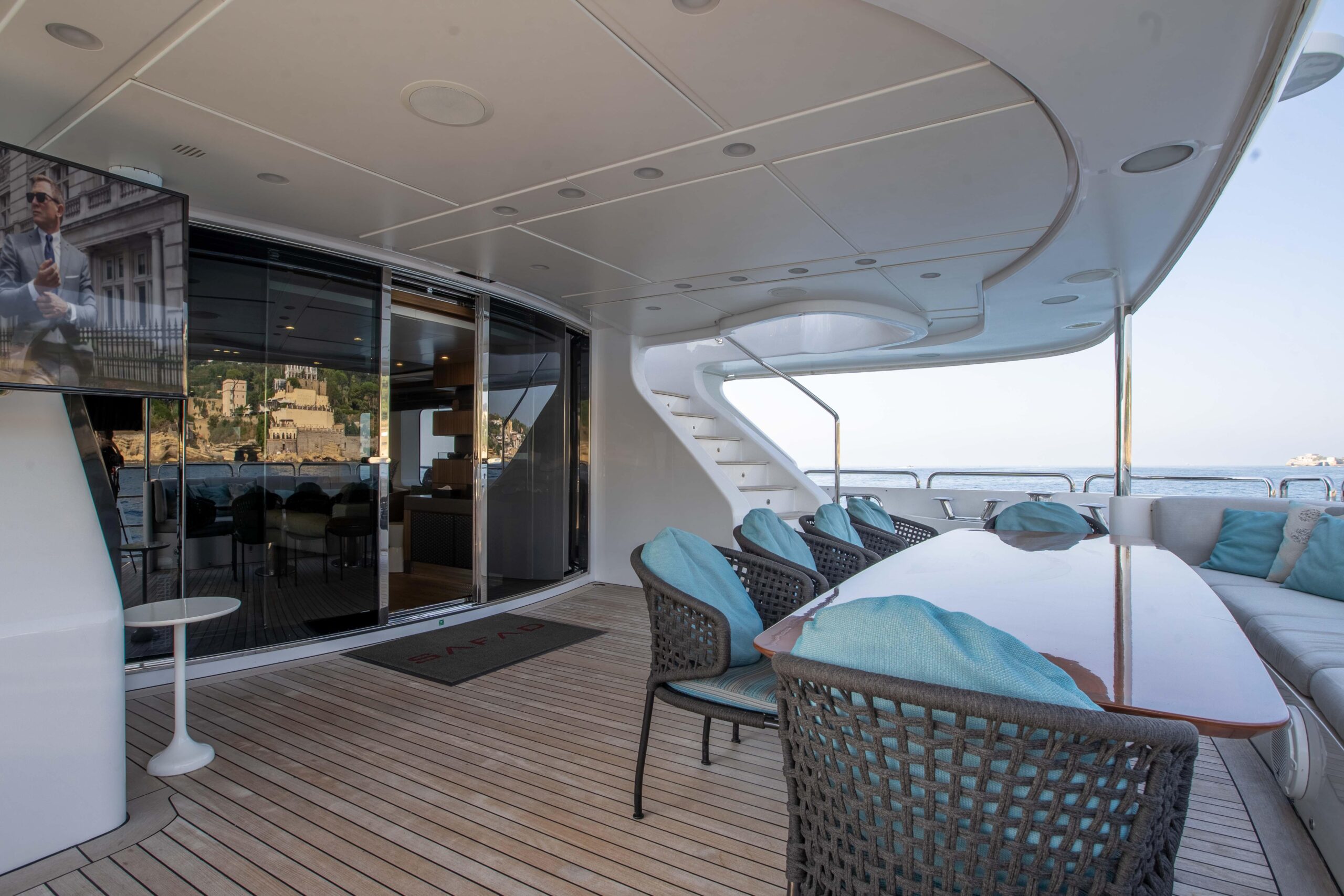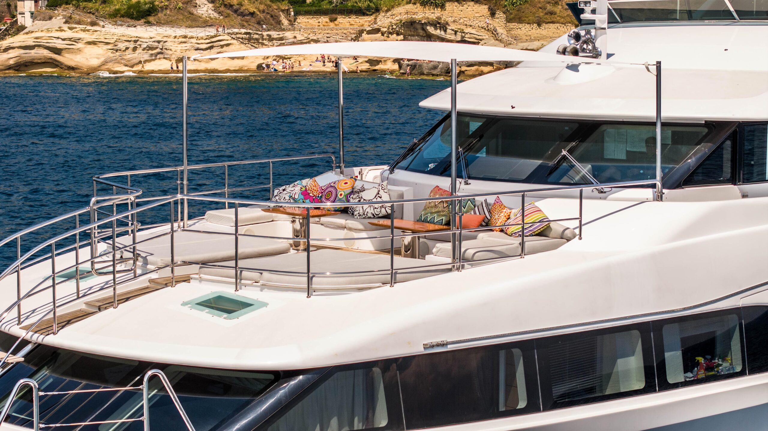 Главный салон наполнен естественным светом, создавая просторную и комфортную атмосферу, а скай-лаунж, идеально подходящий для просмотра на большом экране, выходит на впечатляющую кормовую палубу. Сандек прекрасно подходит для отдыха и совместного времяпрепровождения и оснащён большим джакузи, окружающими его лежаками и индивидуальными шезлонгами в кормовой части. Для максимального комфорта гостей на сандеке также предусмотрены большая раздвижная крыша и система орошения.