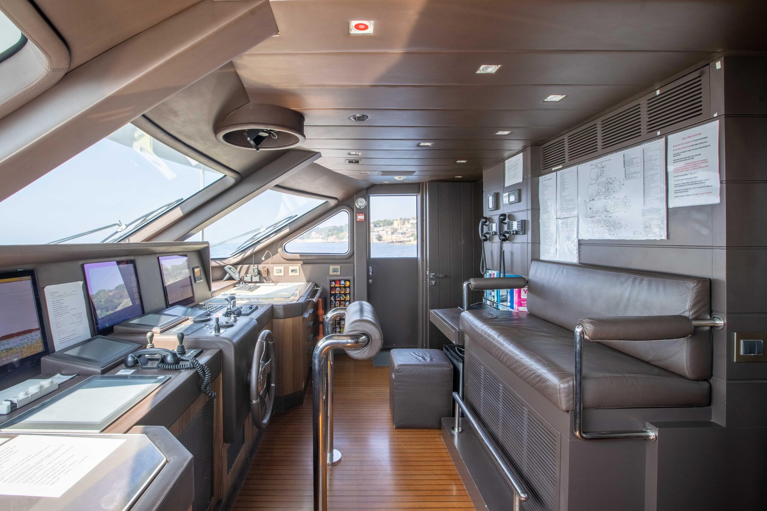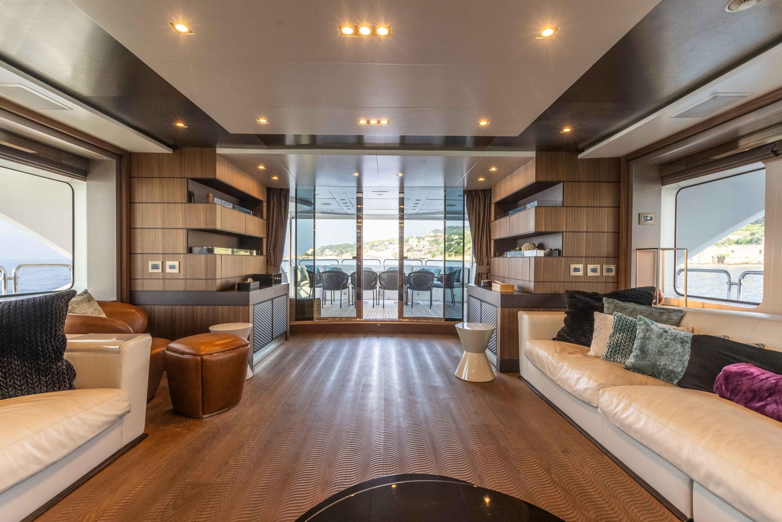 Главный салон наполнен естественным светом, создавая ощущение простора и уюта, а скай-лаунж, отлично подходящий для развлечений на большом экране, выходит на впечатляющую кормовую палубу. Сан-дек идеален для отдыха: большой джакузи, окружающие лежаки и отдельные шезлонги в кормовой части. Для комфорта гостей на сан-деке также предусмотрены большая сдвижная крыша и система водяного распыления (misting).