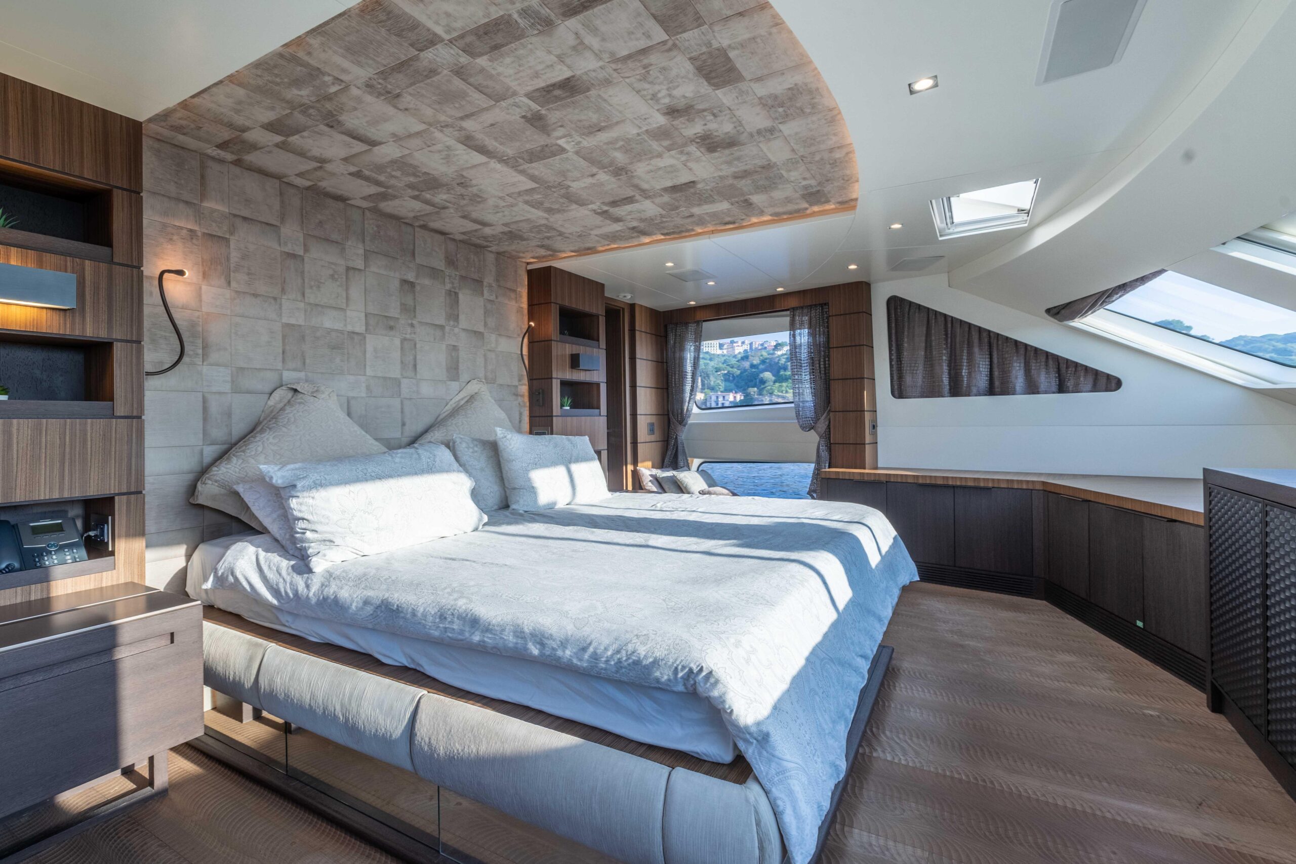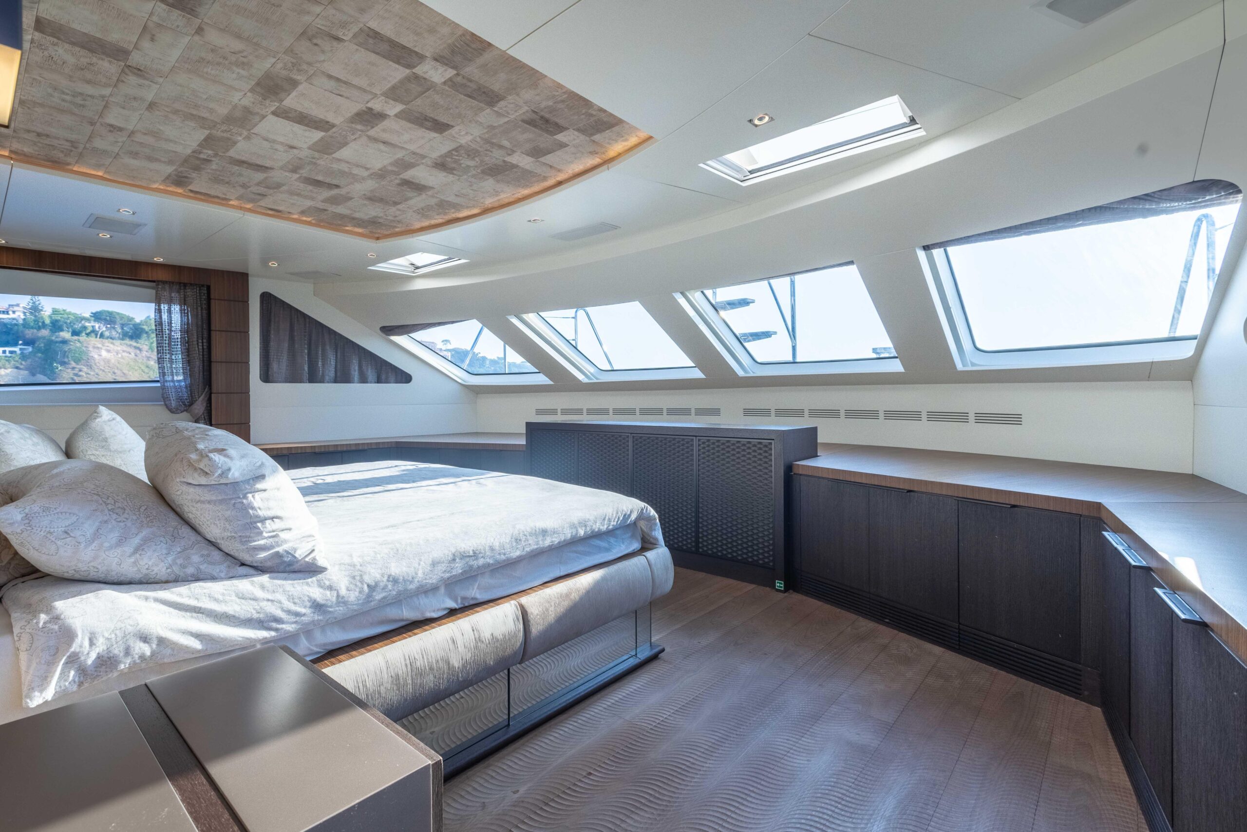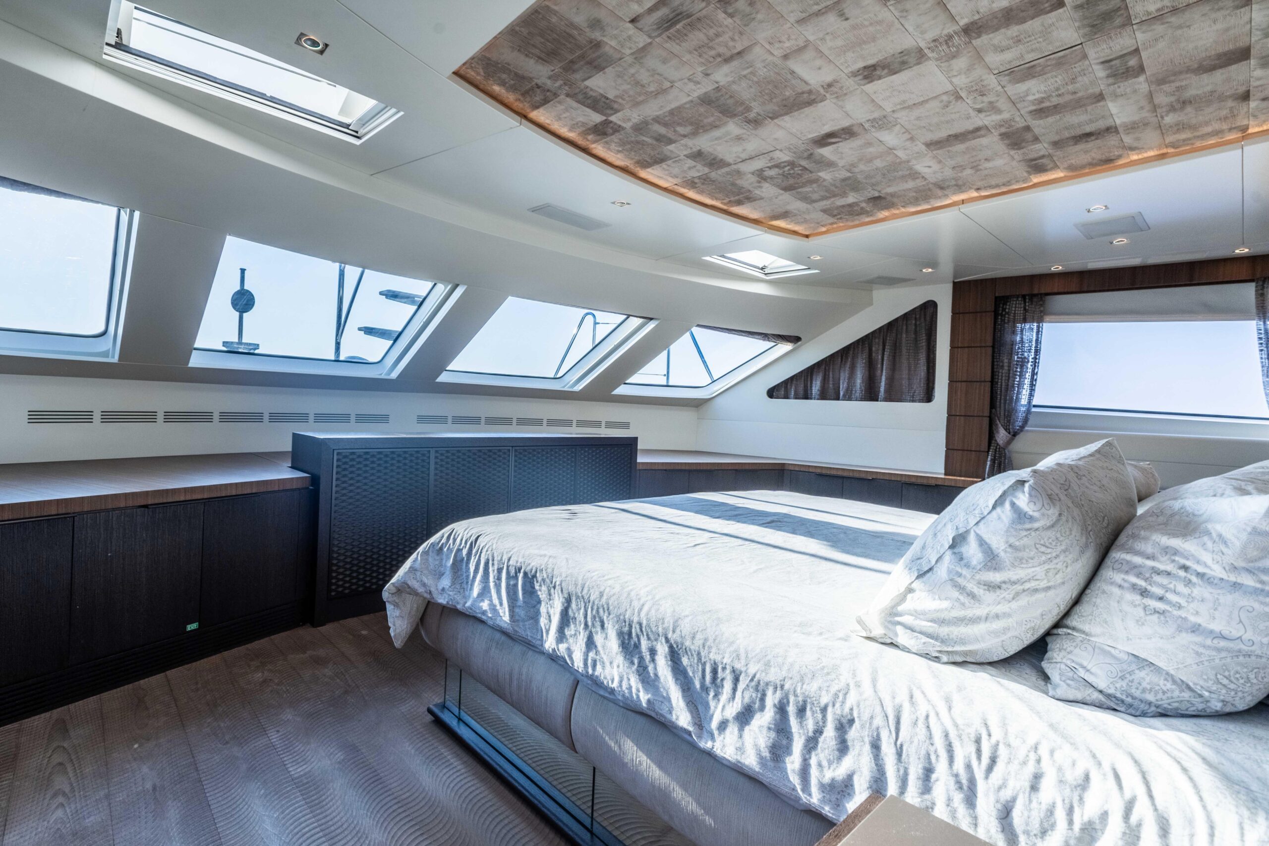 Мастер-каюта владельца, расположенная на главной палубе, предлагает великолепные виды на море, кровать king-size, отдельные ванные комнаты «his & hers» и обширные зоны хранения. Две VIP-каюты и две каюты с раздельными кроватями, все с собственными ванными комнатами, расположены на нижней палубе.