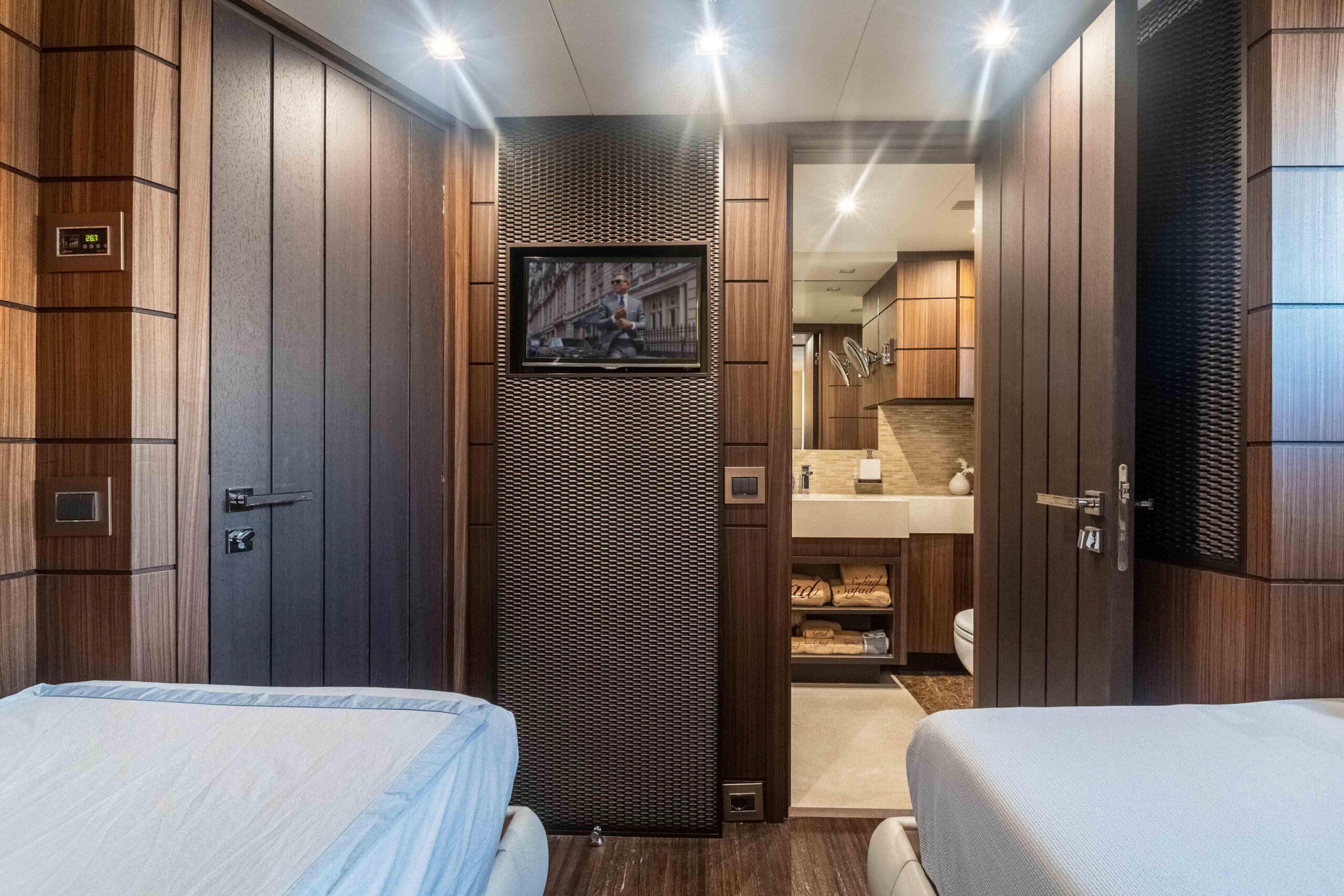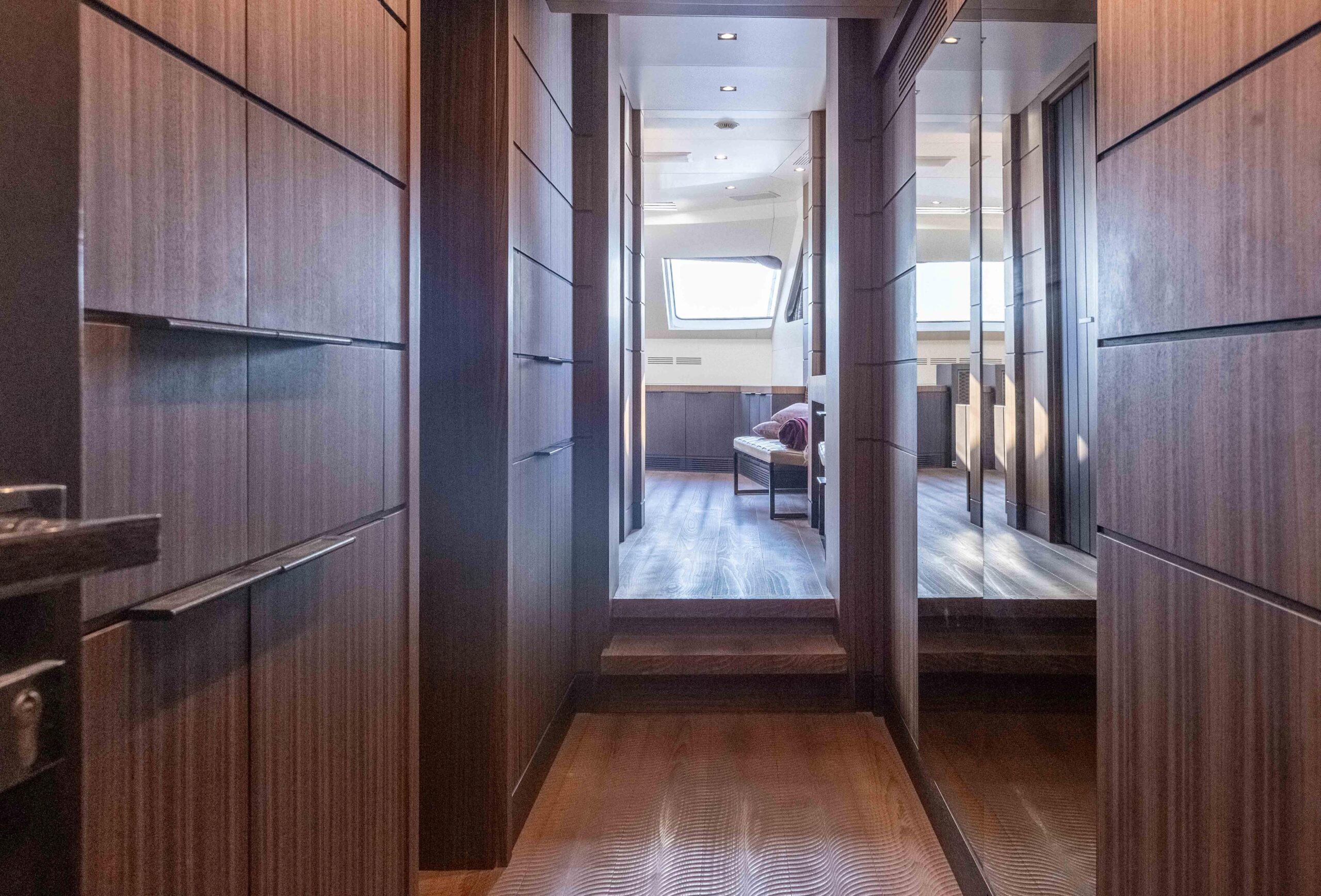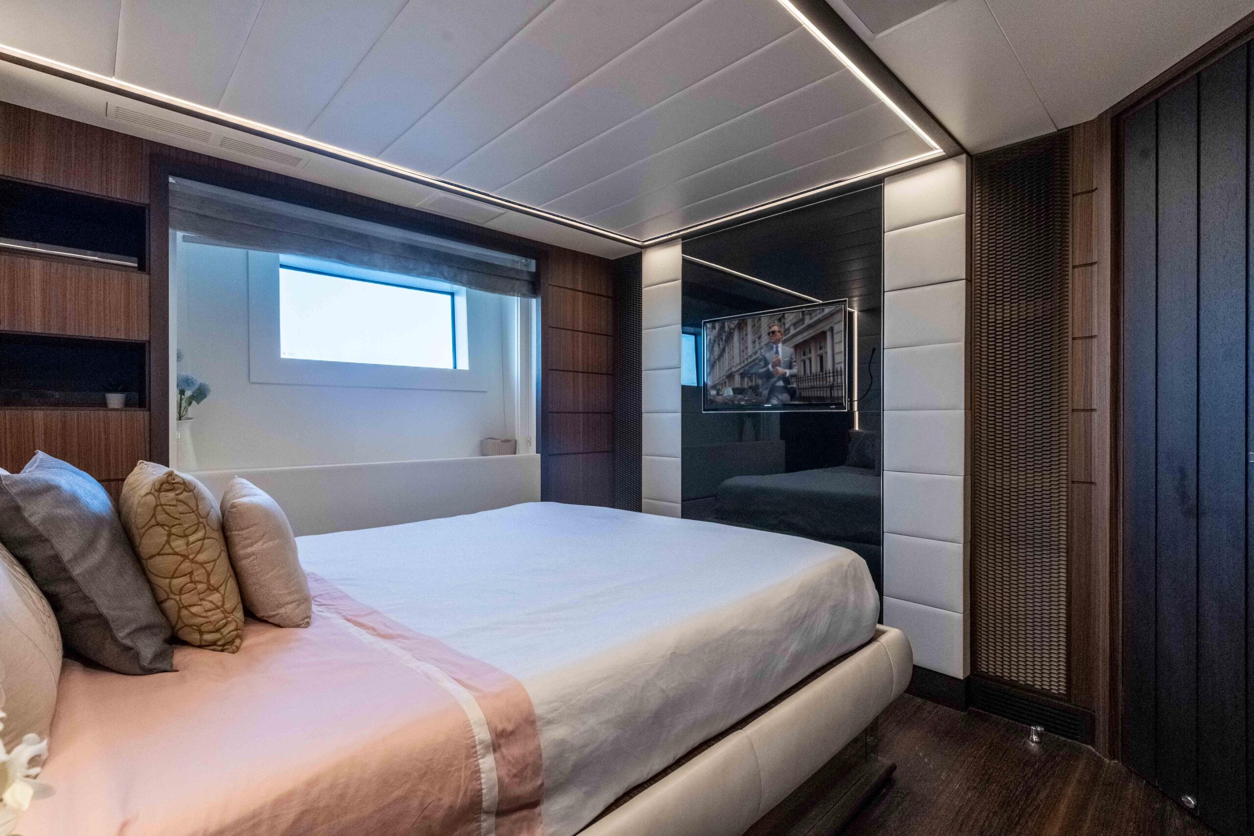 Мастер-каюта владельца, расположенная на главной палубе, предлагает великолепные виды на море, кровать king-size, отдельные ванные комнаты «his & hers» и обширные зоны хранения. Две VIP-каюты и две каюты с раздельными кроватями, все с собственными ванными комнатами, расположены на нижней палубе.