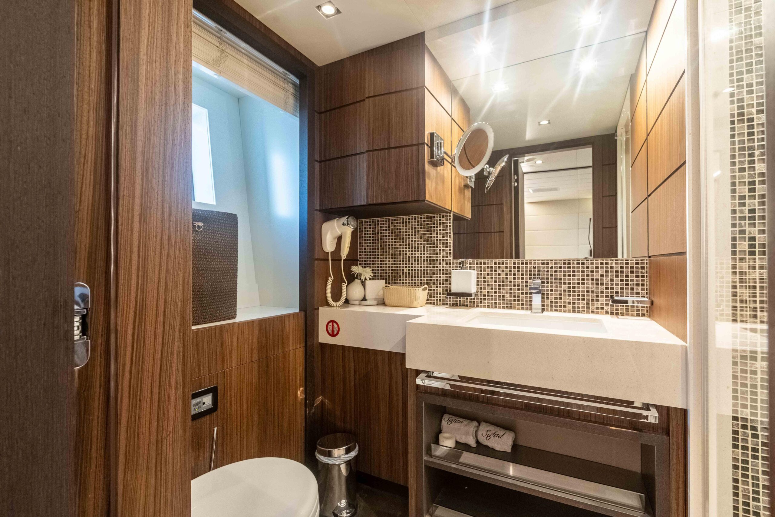 Каюта владельца, расположенная на главной палубе, предлагает прекрасные виды на море, кровать king-size, отдельные санузлы «для него и для неё» и большие зоны хранения. На нижней палубе расположены две VIP-каюты и две каюты с раздельными кроватями, каждая — с собственным санузлом.