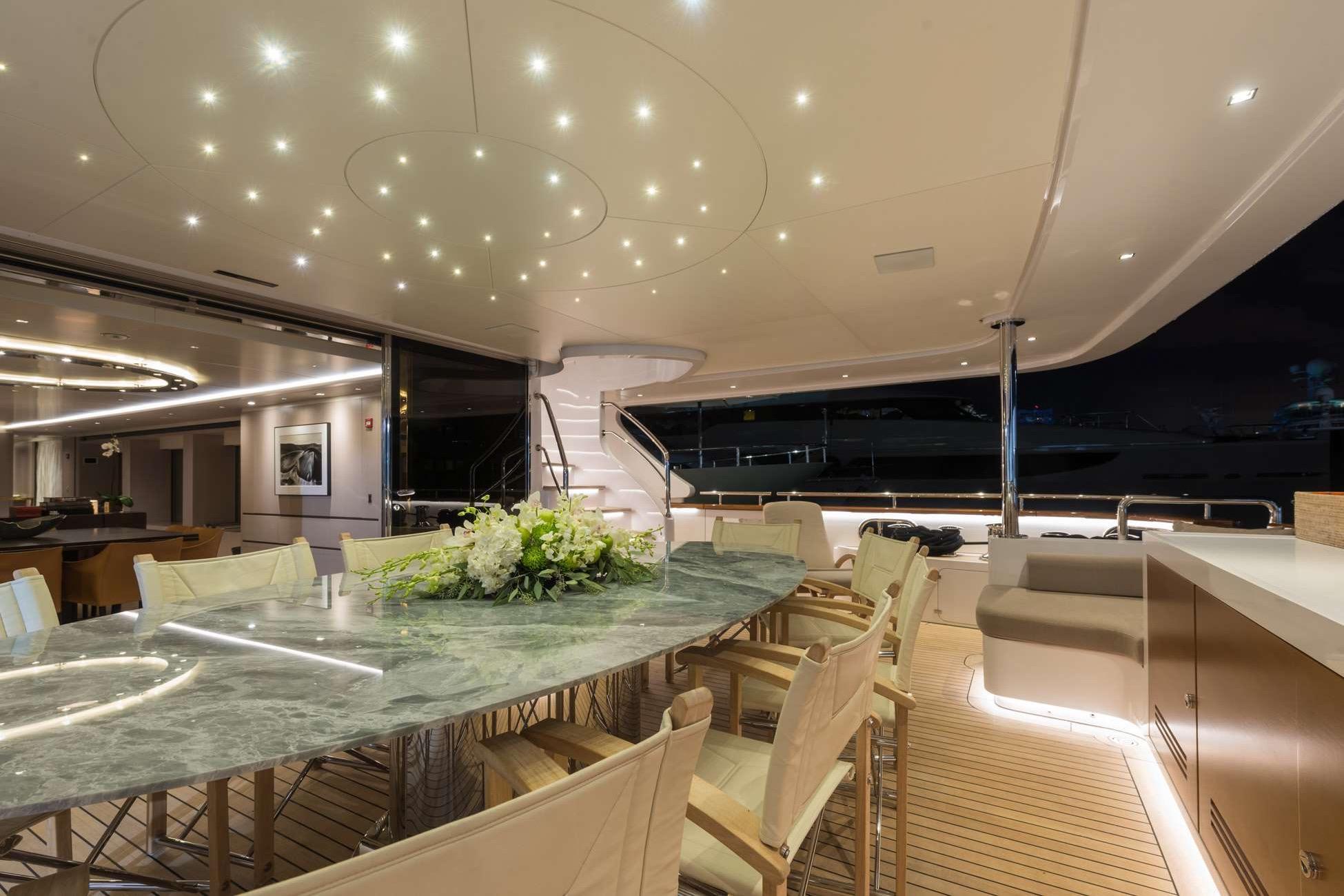 Жёсткая крыша с раздвижным люком обеспечивает достаточную защиту от солнца в обеденной зоне, одновременно позволяя гостям наслаждаться морским бризом и солнечным светом в зоне отдыха ближе к корме.