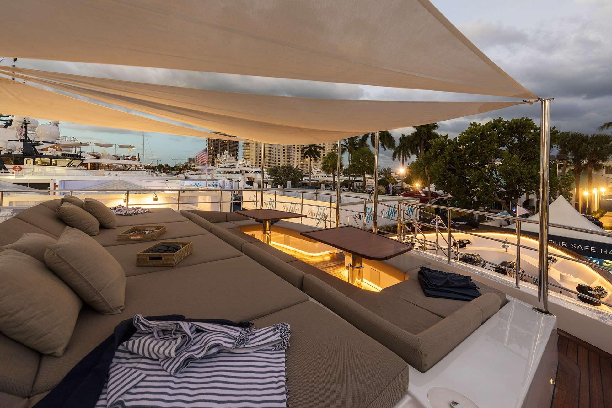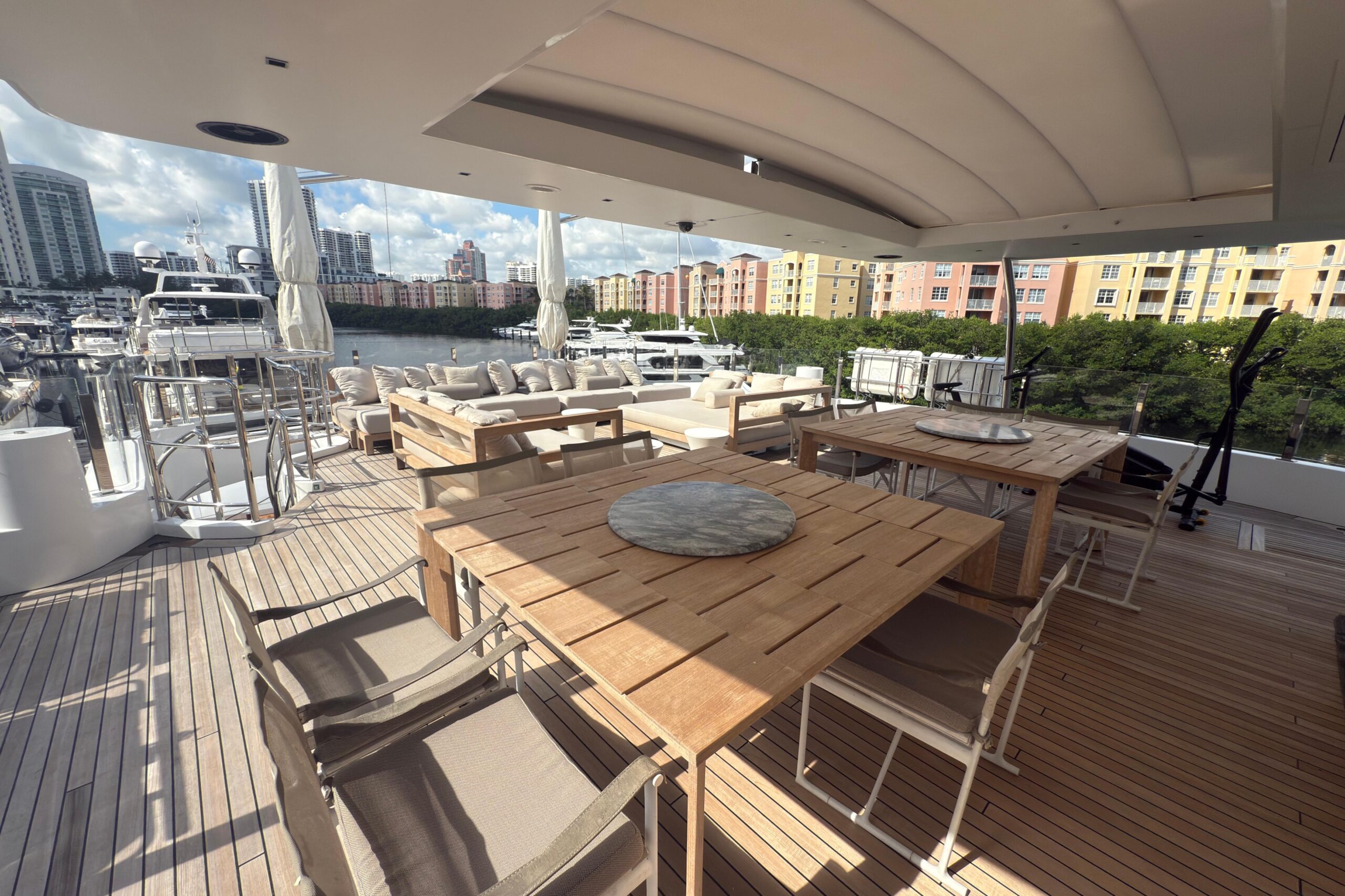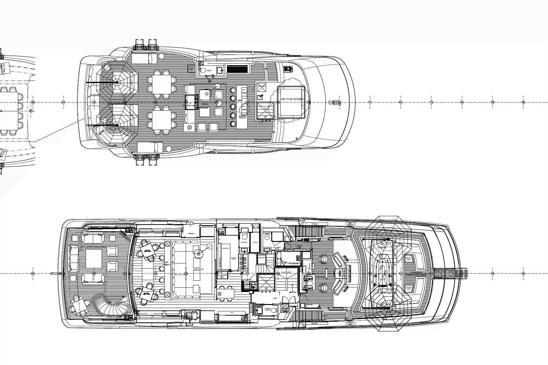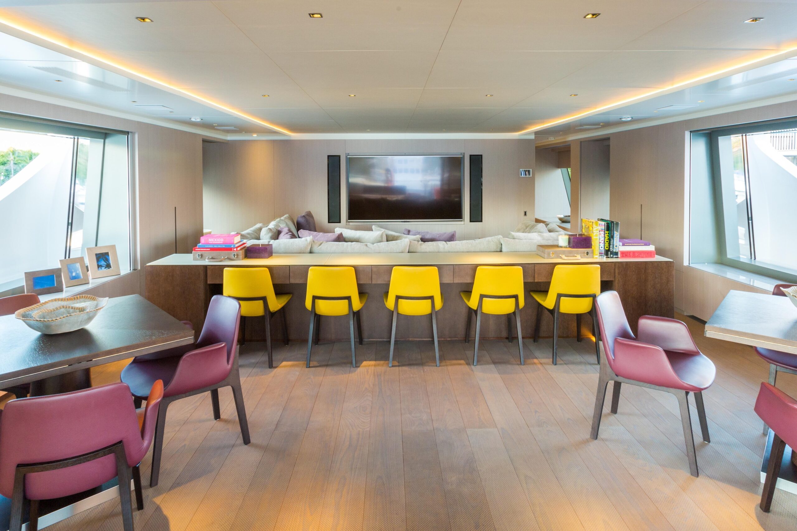 Верхняя палуба полностью посвящена зоне отдыха: в кормовой части расположены два игровых стола, окружённые раздвижными стеклянными дверями, которые при закрытии образуют полукруг с впечатляющим видом на горизонт. Закрыв стеклянные двери, зону можно изолировать от внешней среды и обеспечить климат-контроль. В носовой части находятся рулевая рубка и каюта капитана, а снаружи — просторная зона с диванами под открытым небом.
