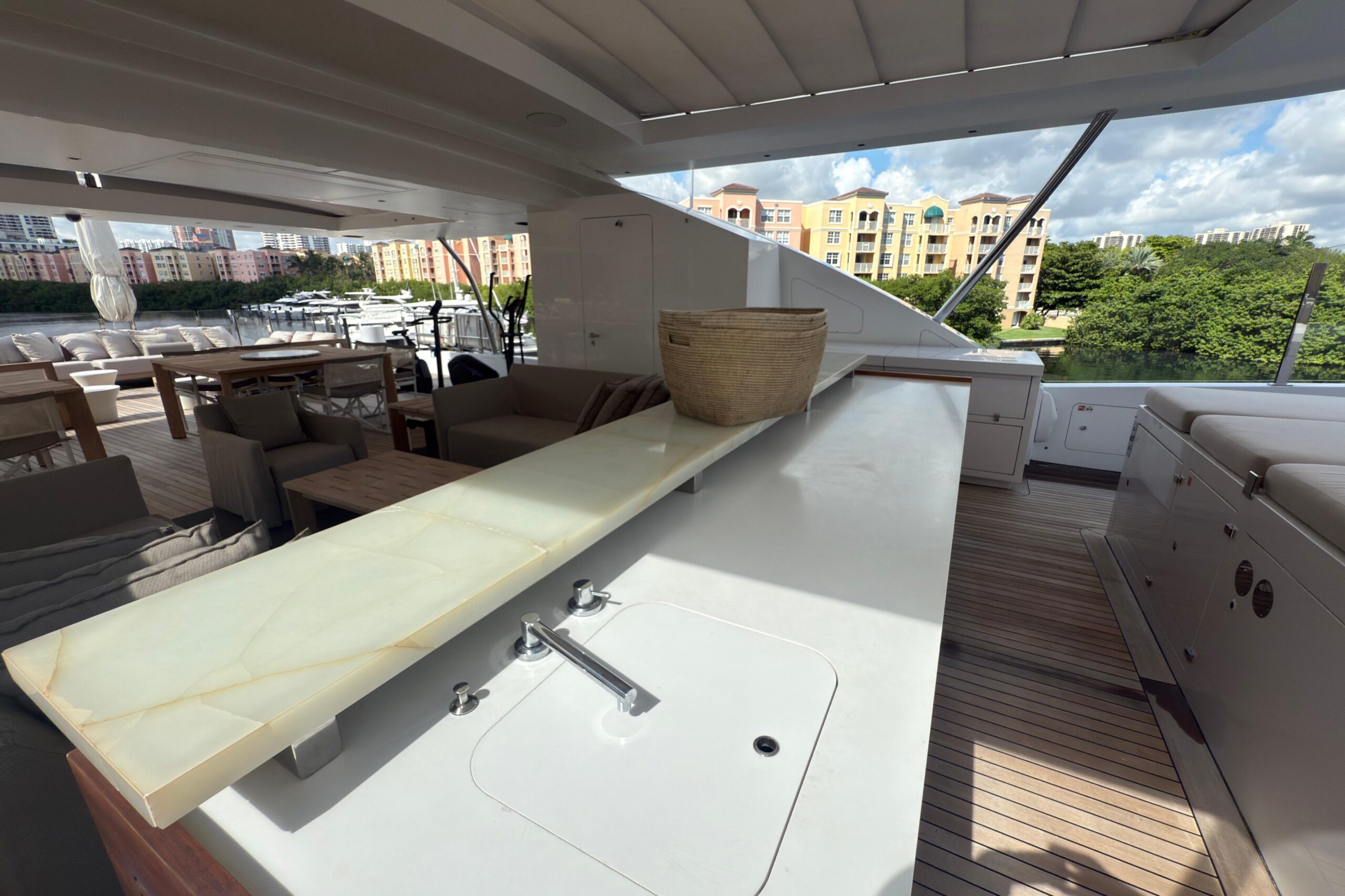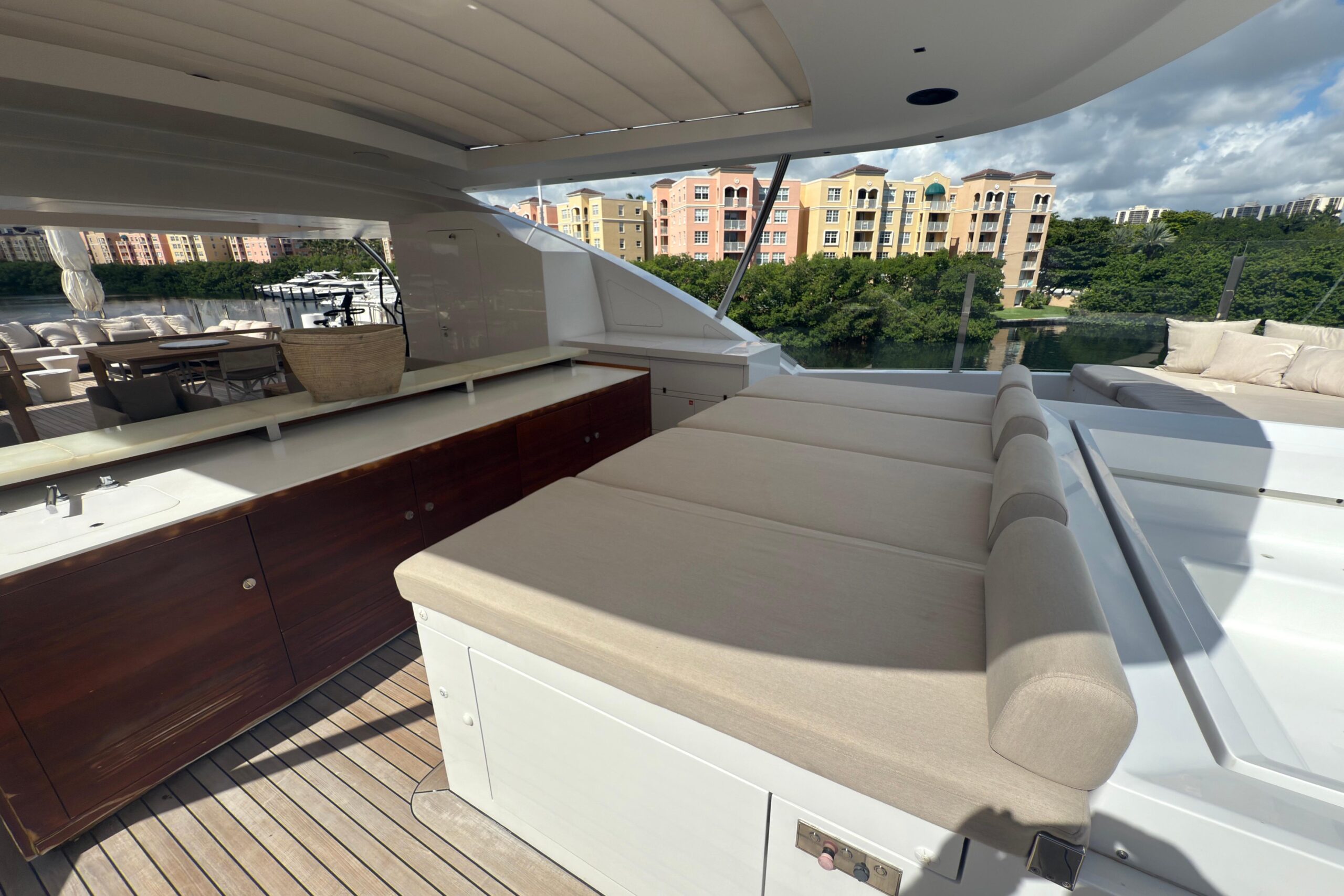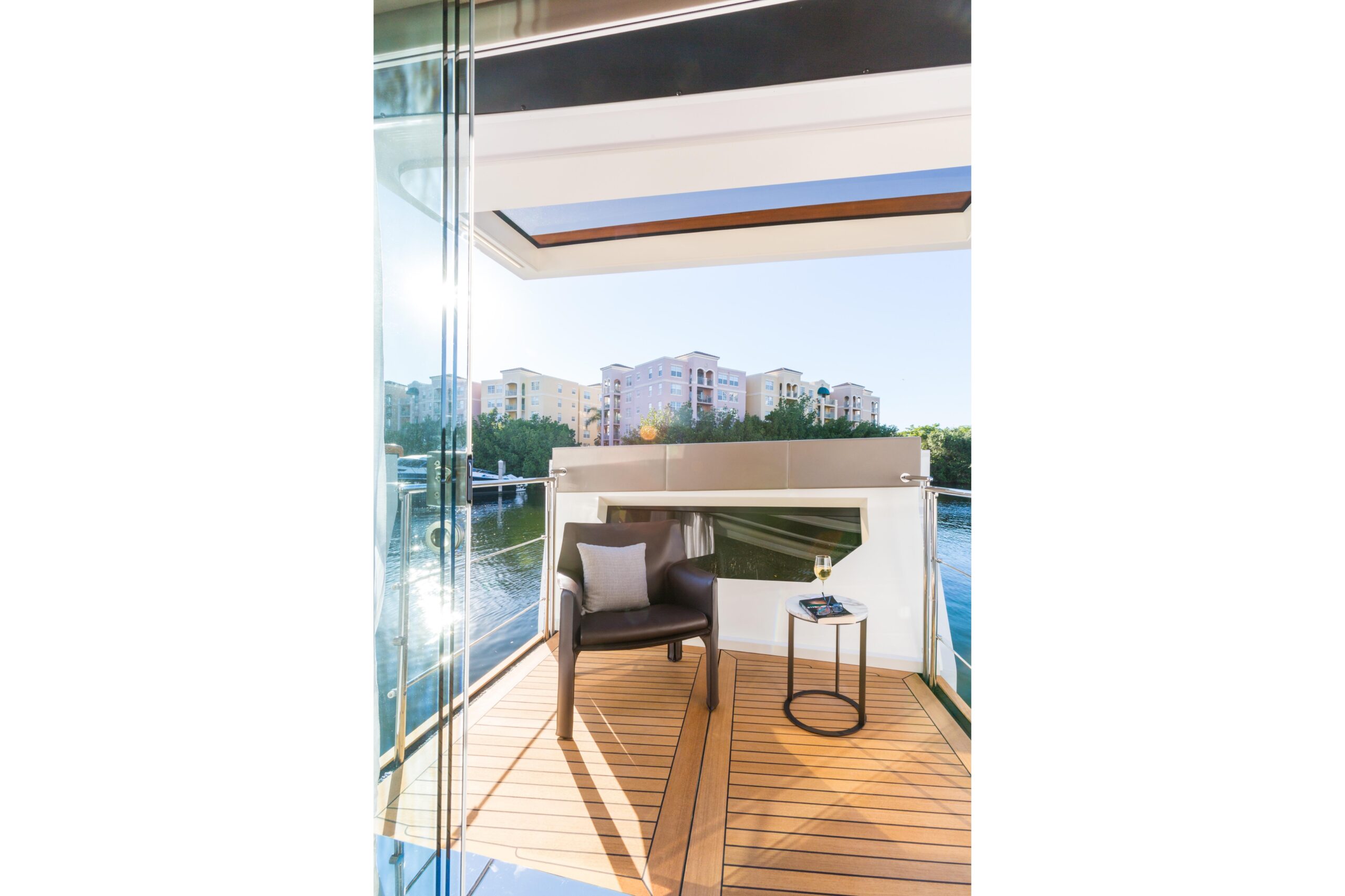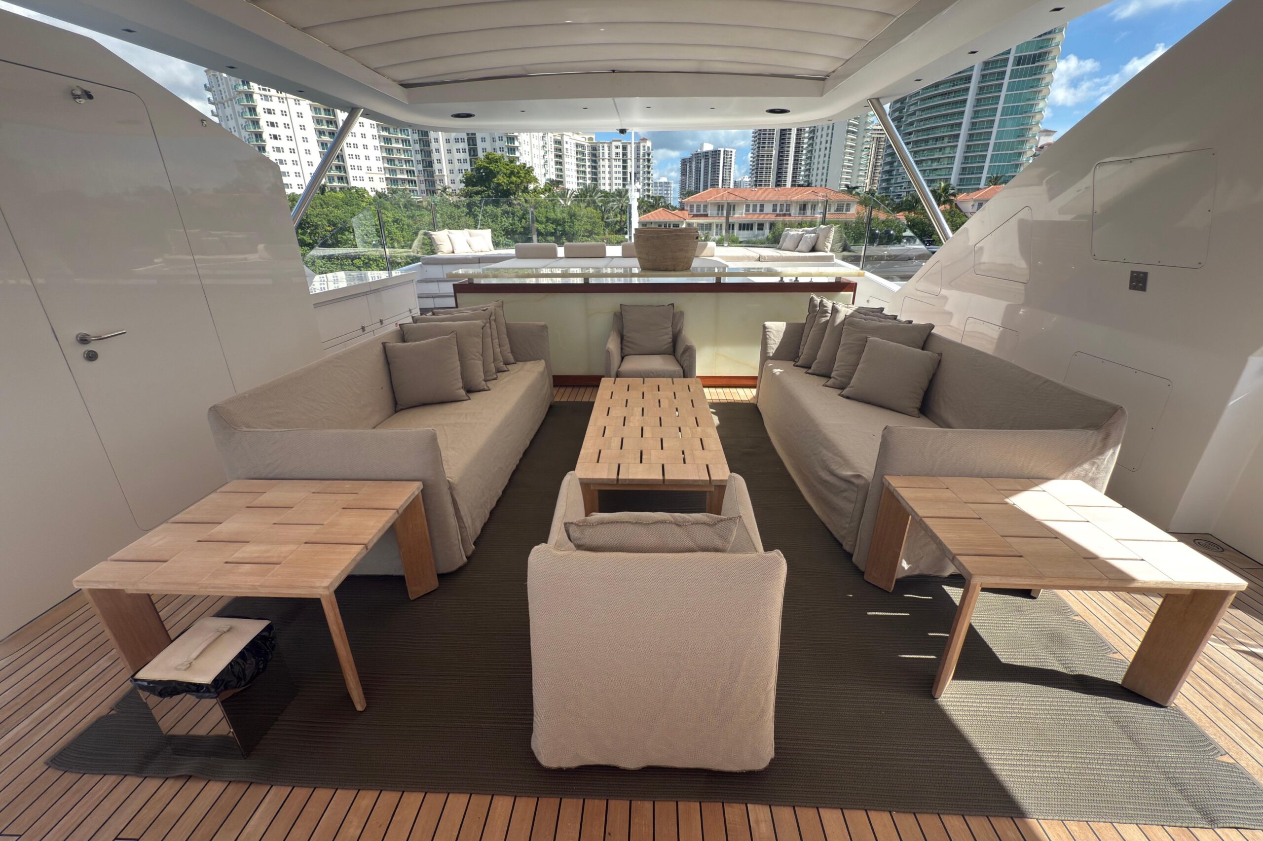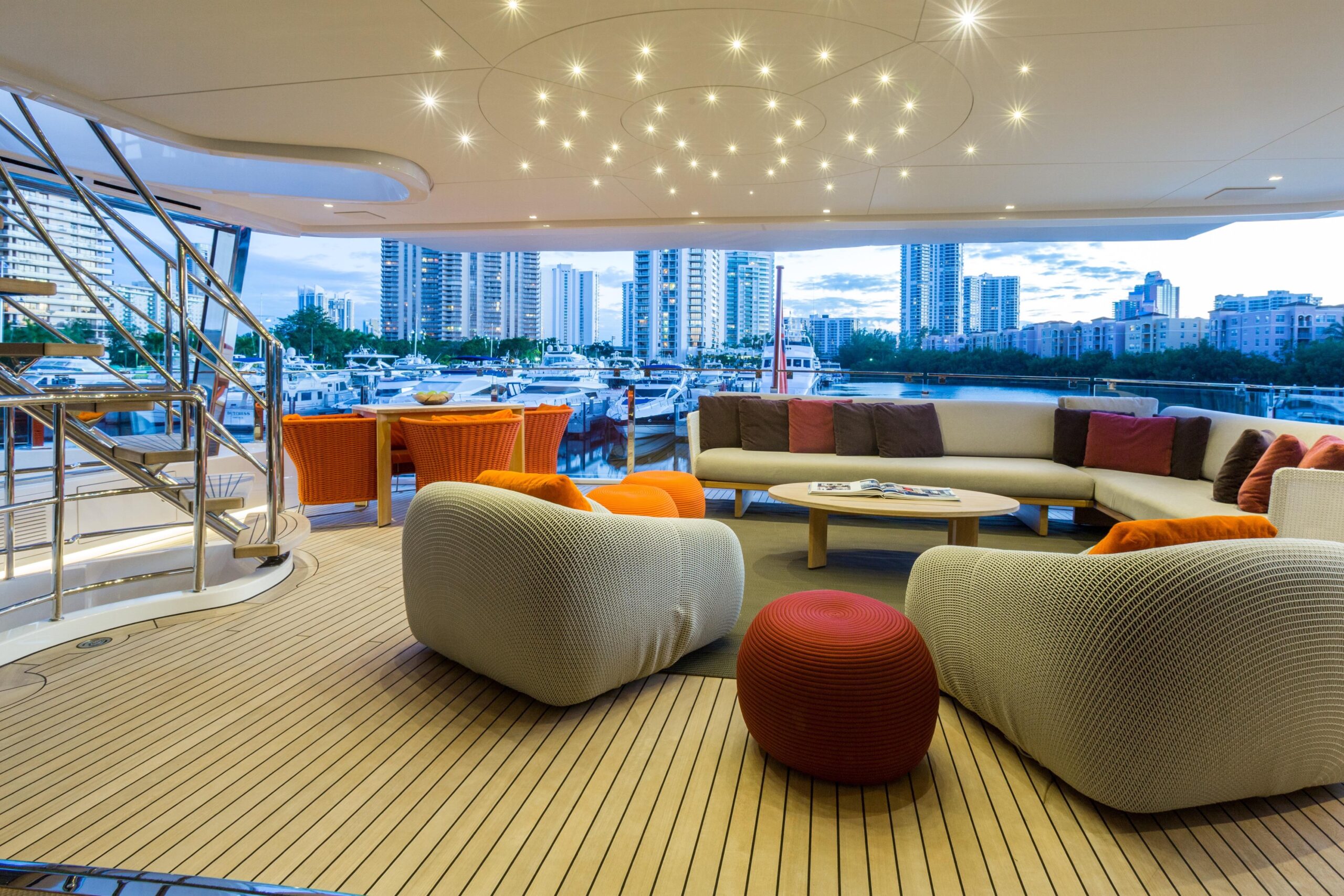 Верхняя палуба полностью посвящена зоне отдыха: в кормовой части расположены два игровых стола, окружённые раздвижными стеклянными дверями, которые при закрытии образуют полукруг с впечатляющим видом на горизонт. Закрыв стеклянные двери, зону можно изолировать от внешней среды и обеспечить климат-контроль. В носовой части находятся рулевая рубка и каюта капитана, а снаружи — просторная зона с диванами под открытым небом.