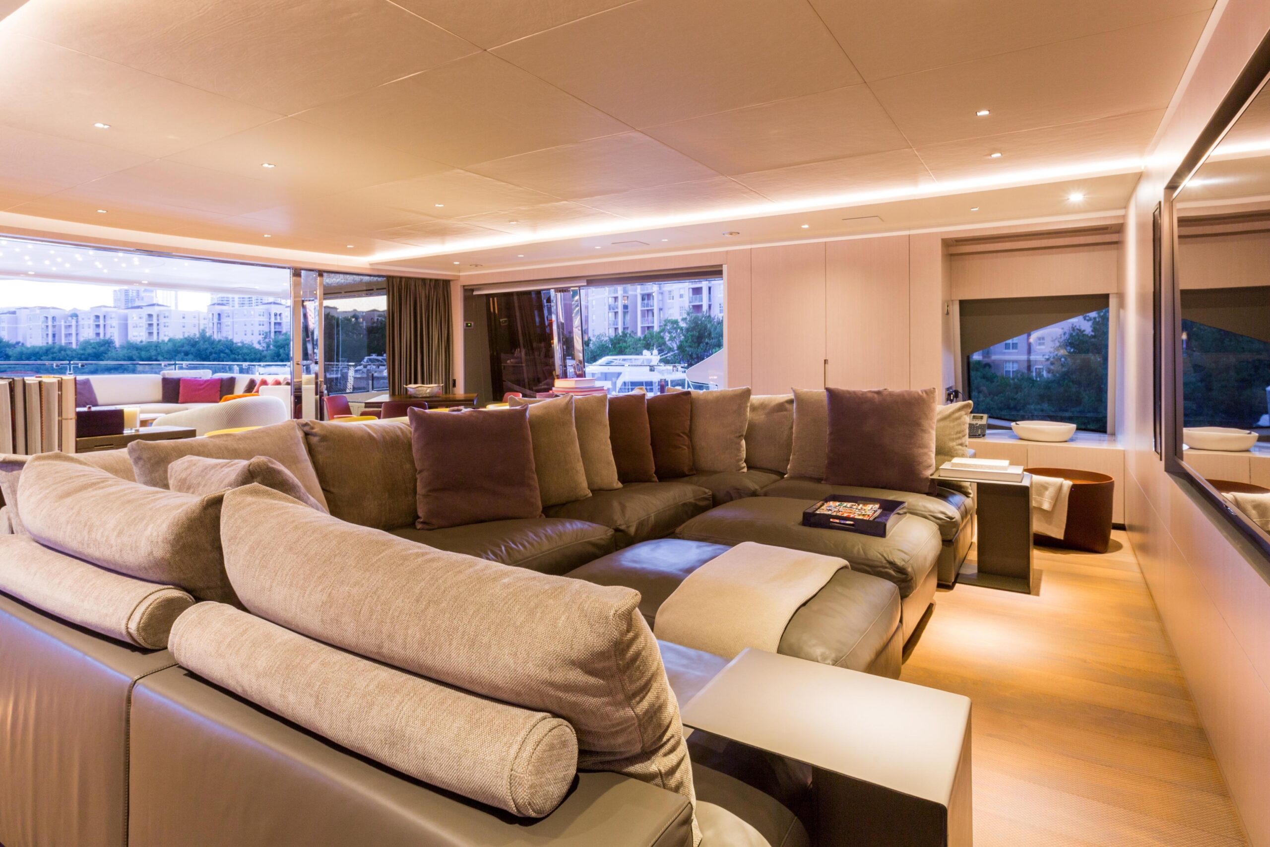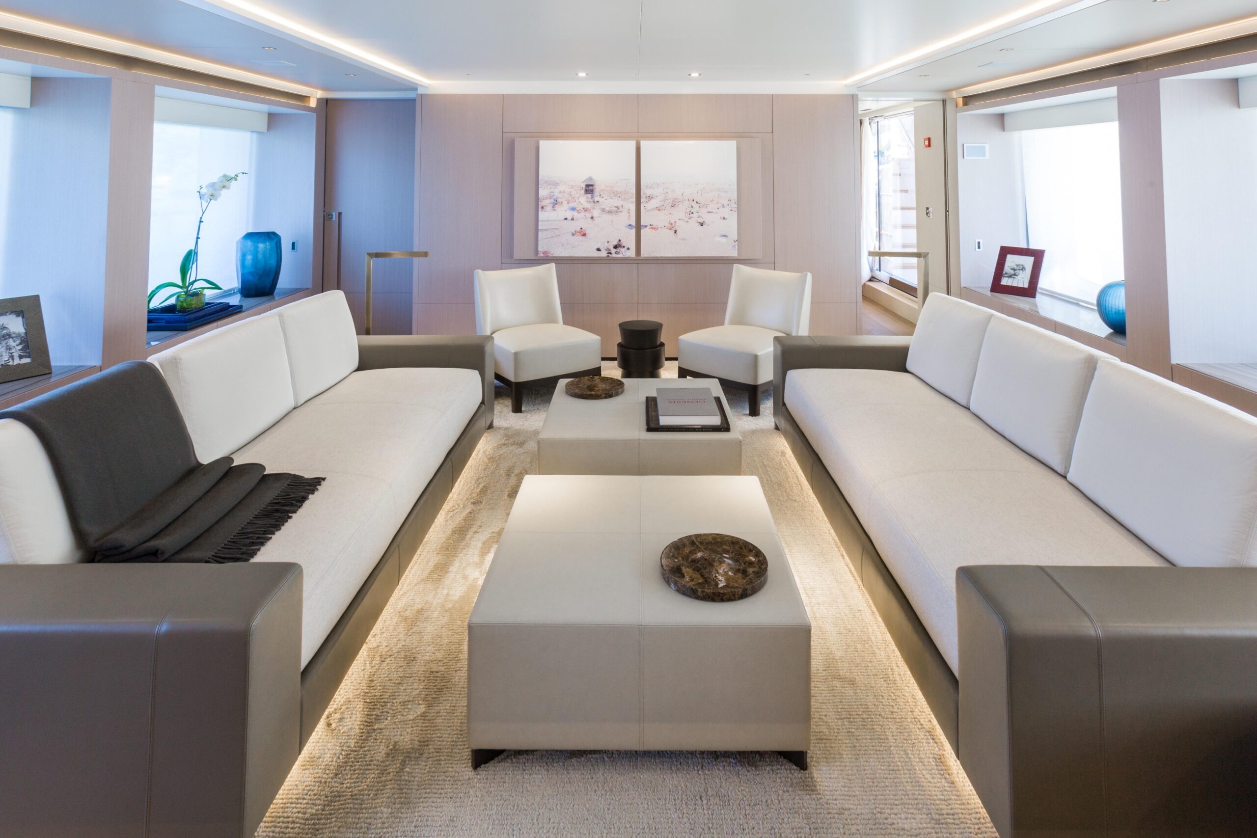 Главная палуба является настоящим сердцем яхты: просторная гостиная с центральным диваном, удобными креслами и барной зоной делает её идеальным местом для отдыха. Главный салон дополняется обеденной зоной с элегантным столом на восемь персон в классическом стиле. Деревянное напольное покрытие отличается особенно привлекательным дизайном.