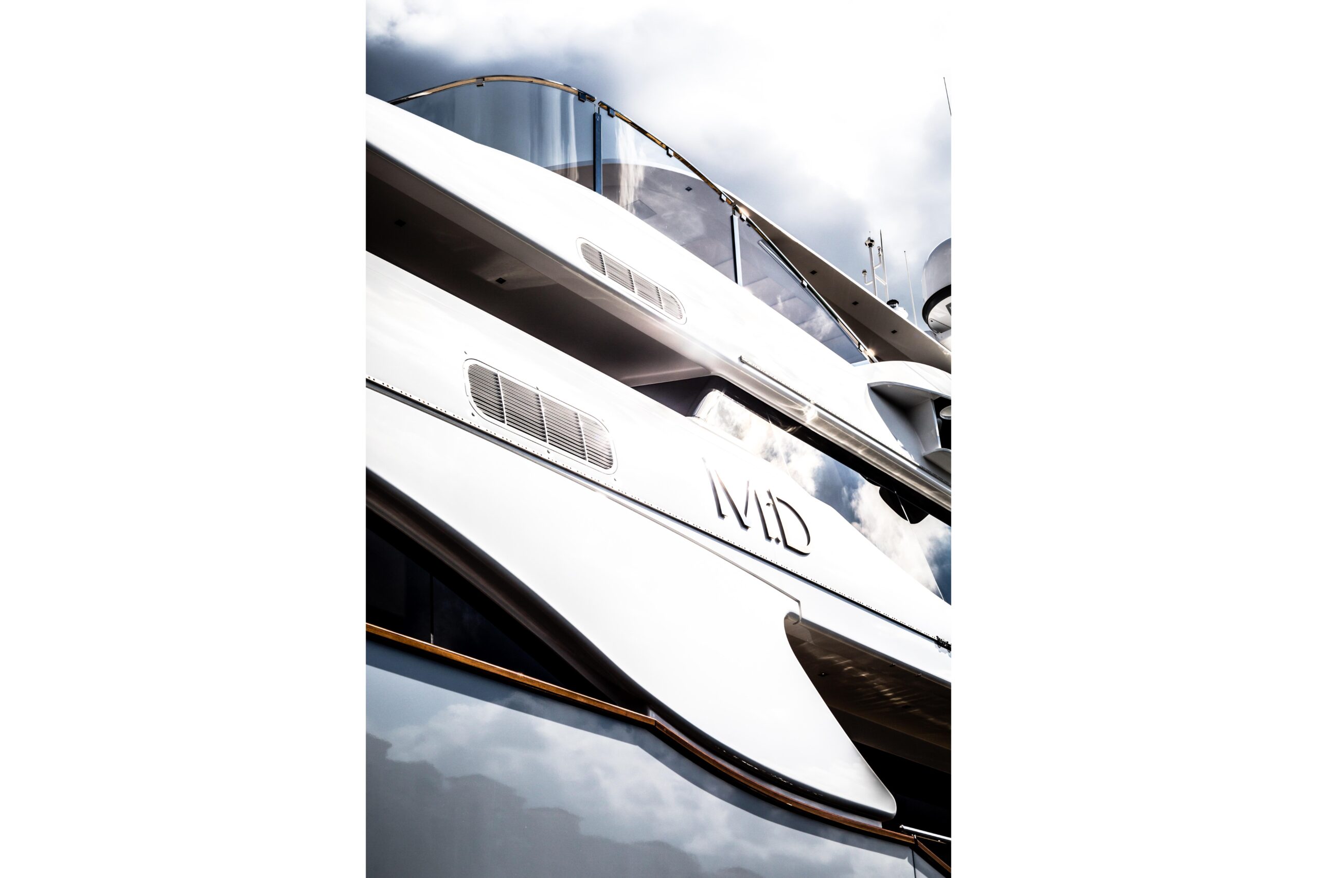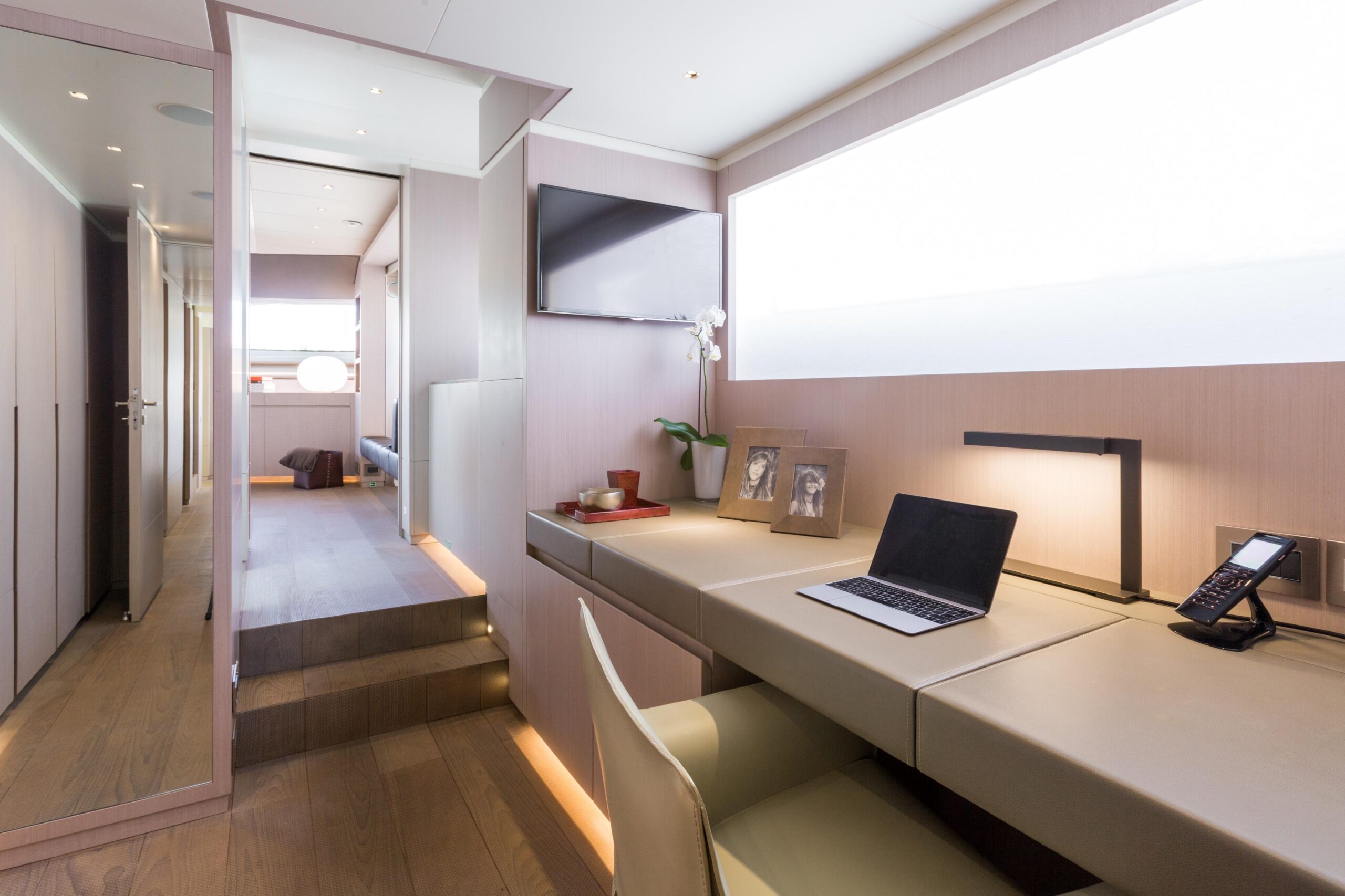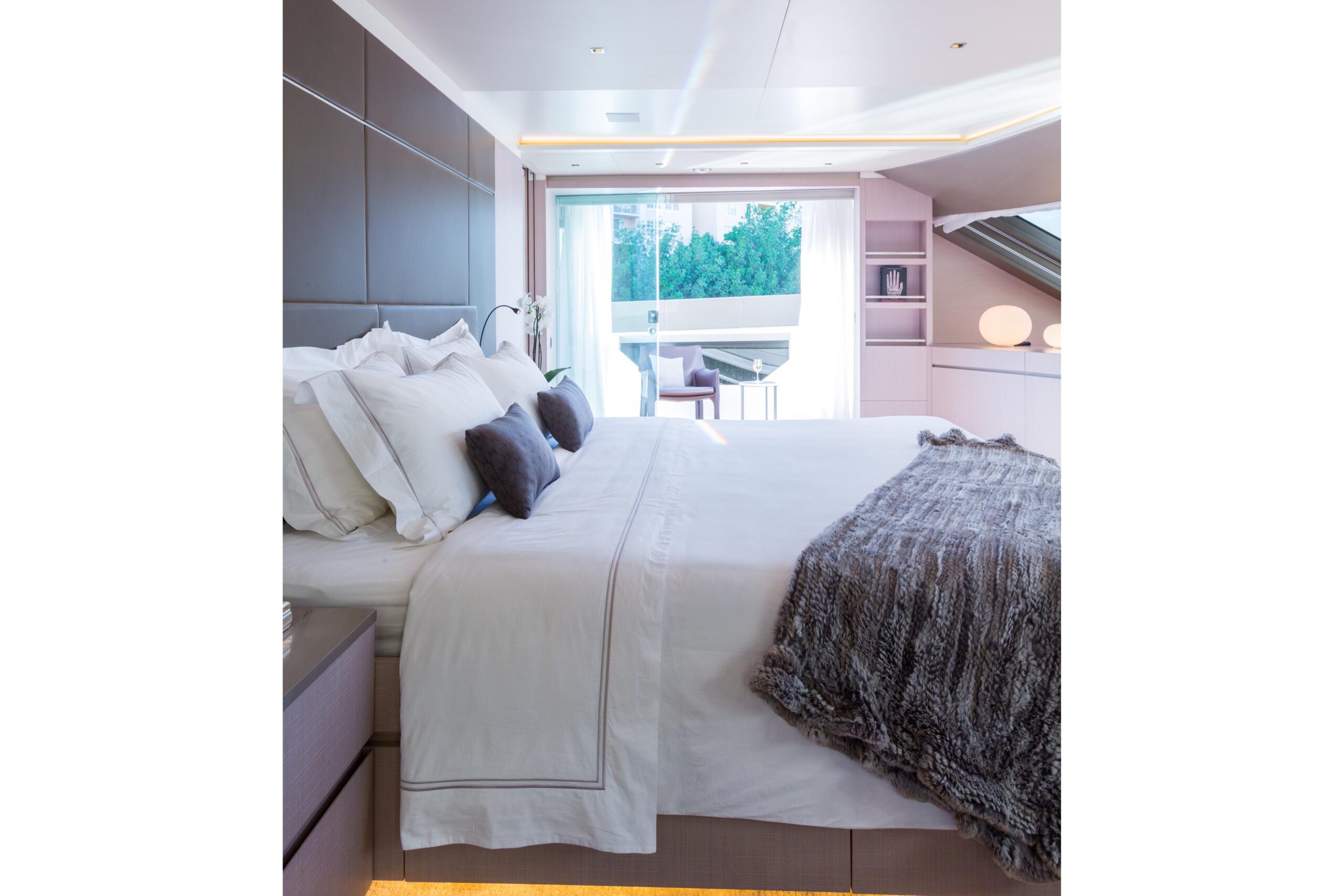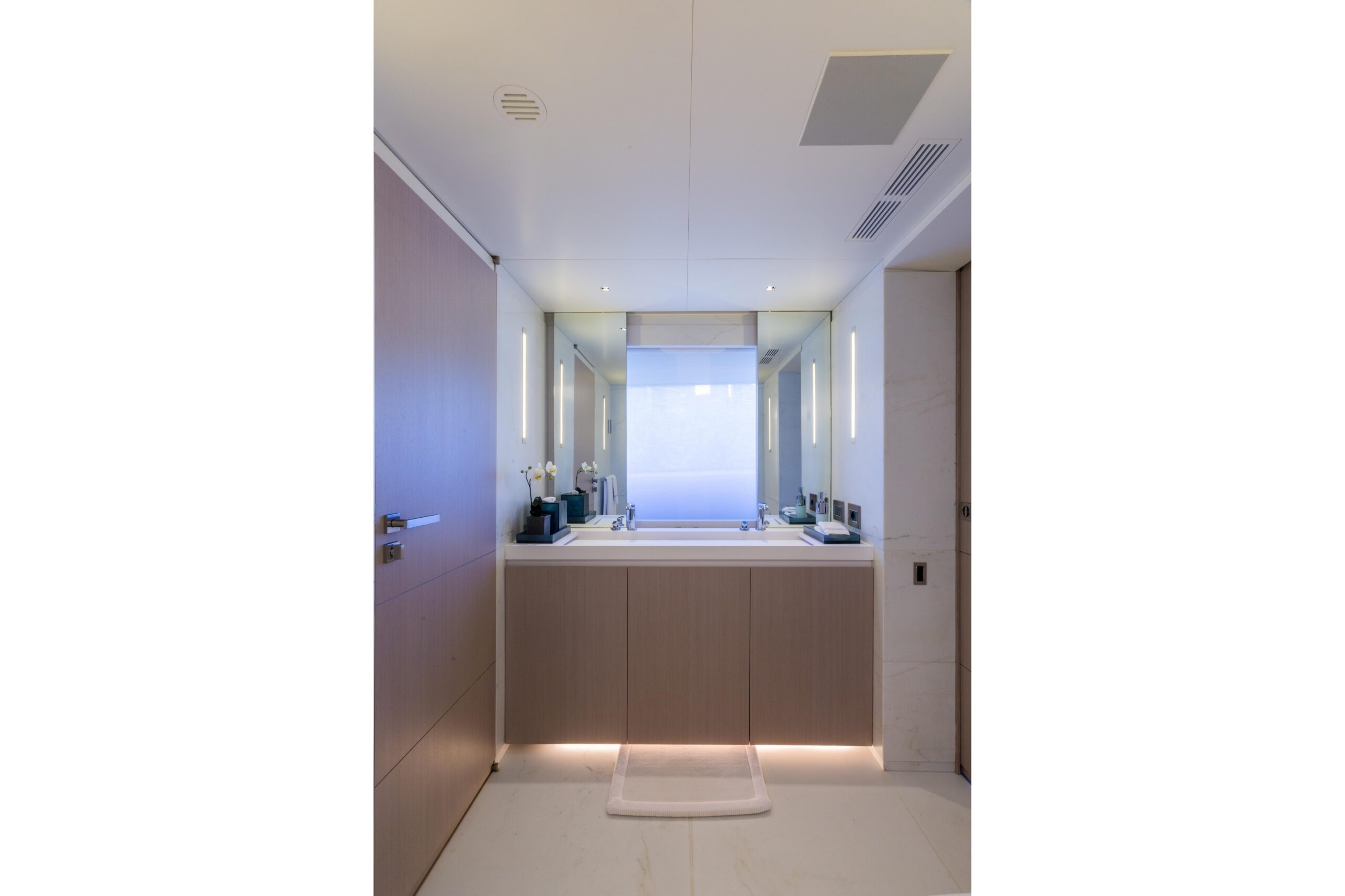 В миделе расположено фойе с лестницей, ведущей на нижние уровни. Стены вдоль лестницы между главной и верхней палубами, а также облицовка лифта выполнены из подсвеченного оникса, создавая выразительный и эффектный визуальный образ. Продвигаясь к носу, вы попадаете в каюту владельца, выделенную панорамными окнами во всю высоту, открывающими захватывающие виды на море как на ходу, так и на якоре — место, где хочет оказаться каждый.