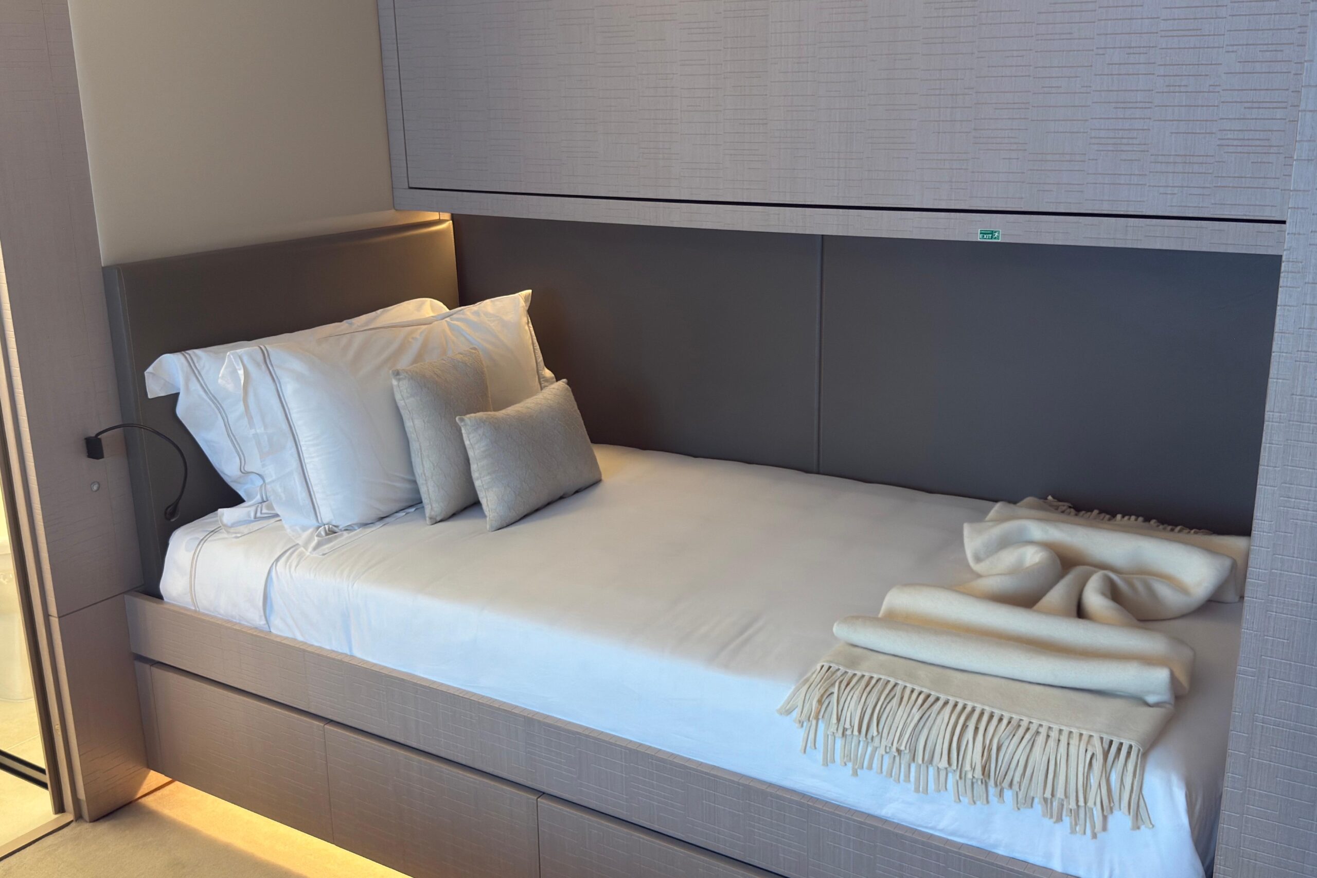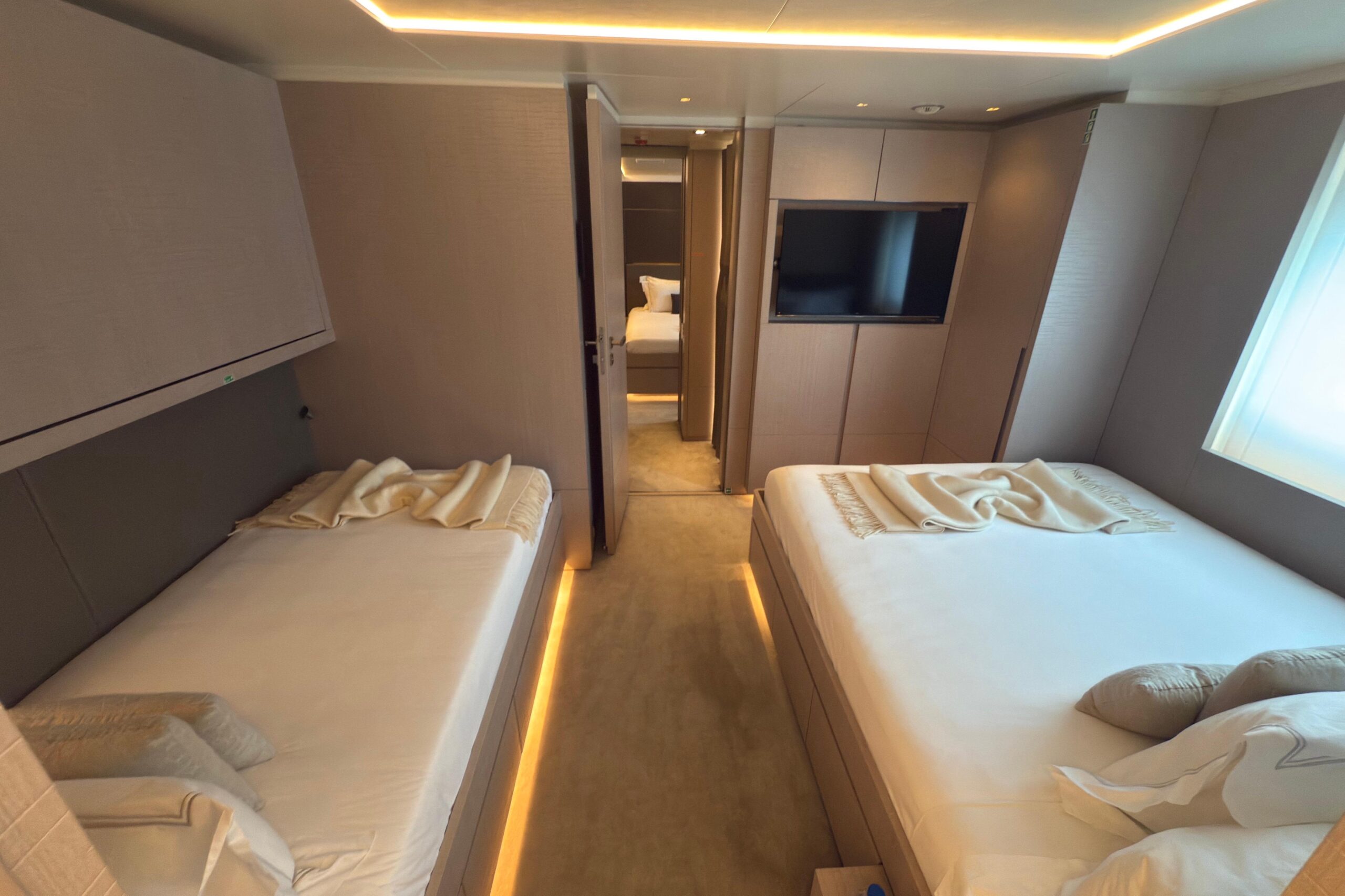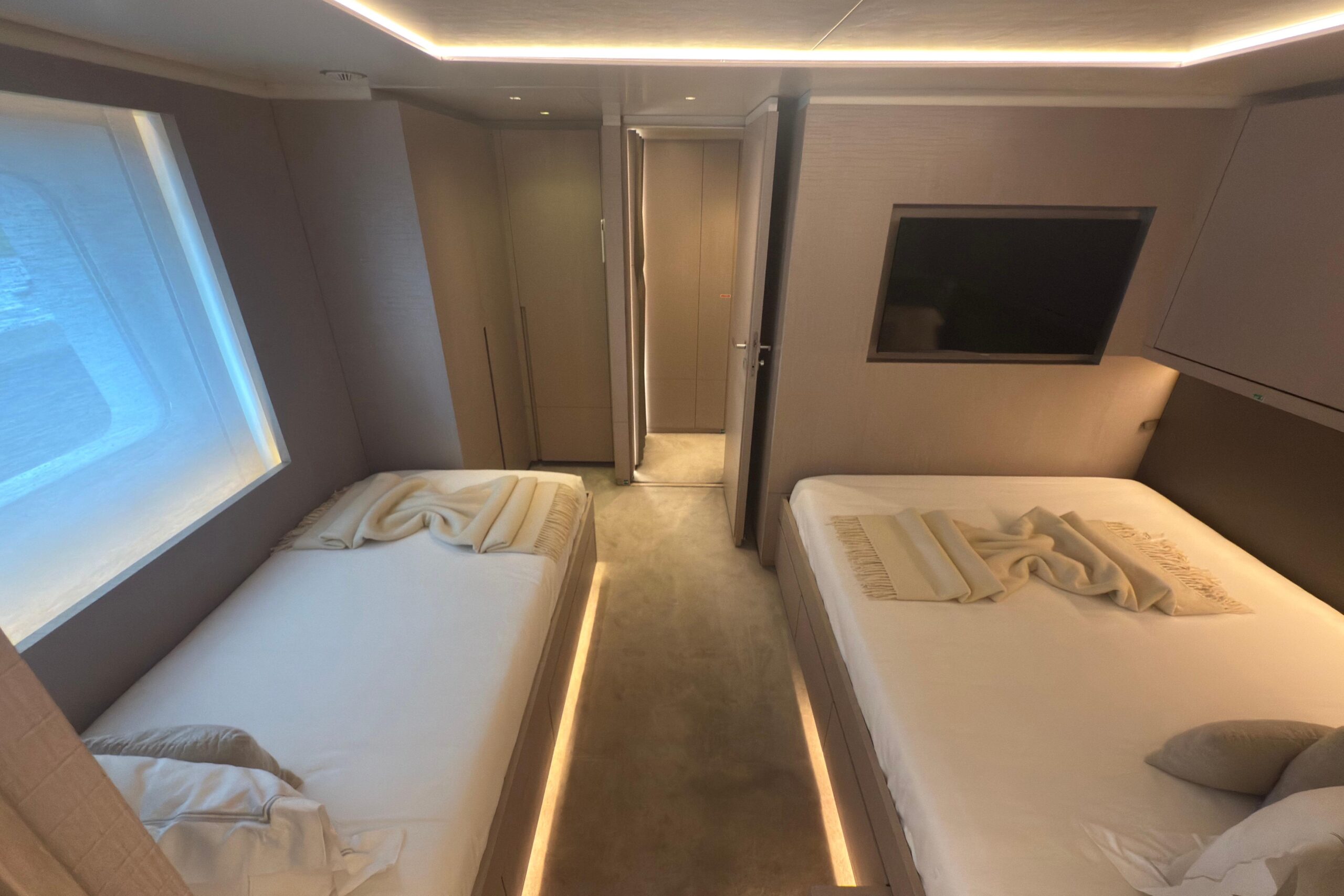 Перепланировка нижней палубы, в сочетании с исключительно функциональным машинным отделением, позволила увеличить пространство гостевых кают — всего их четыре: две с двуспальными кроватями и две с раздельными кроватями, а также создать зону экипажа с отметившимися ранее невиданными объёмами комфорта для персонала на борту.