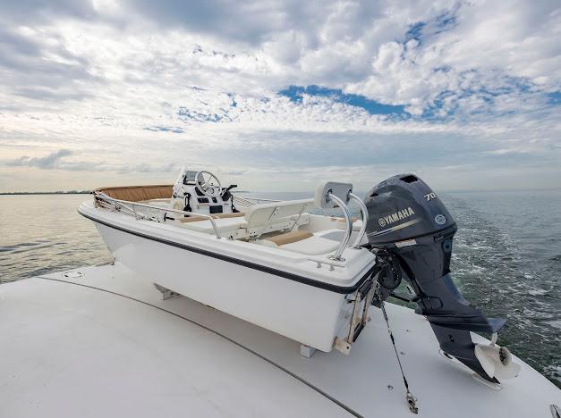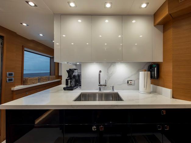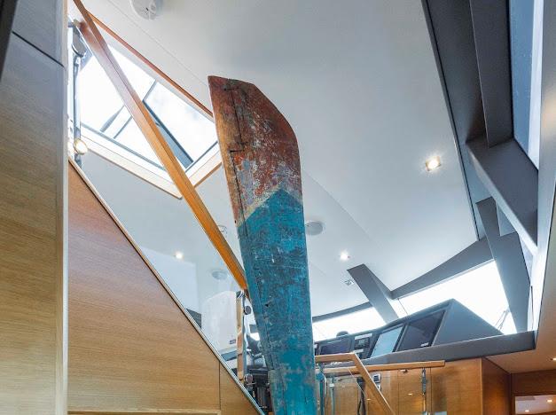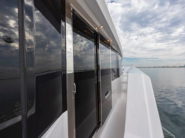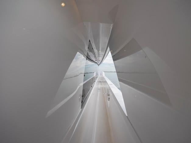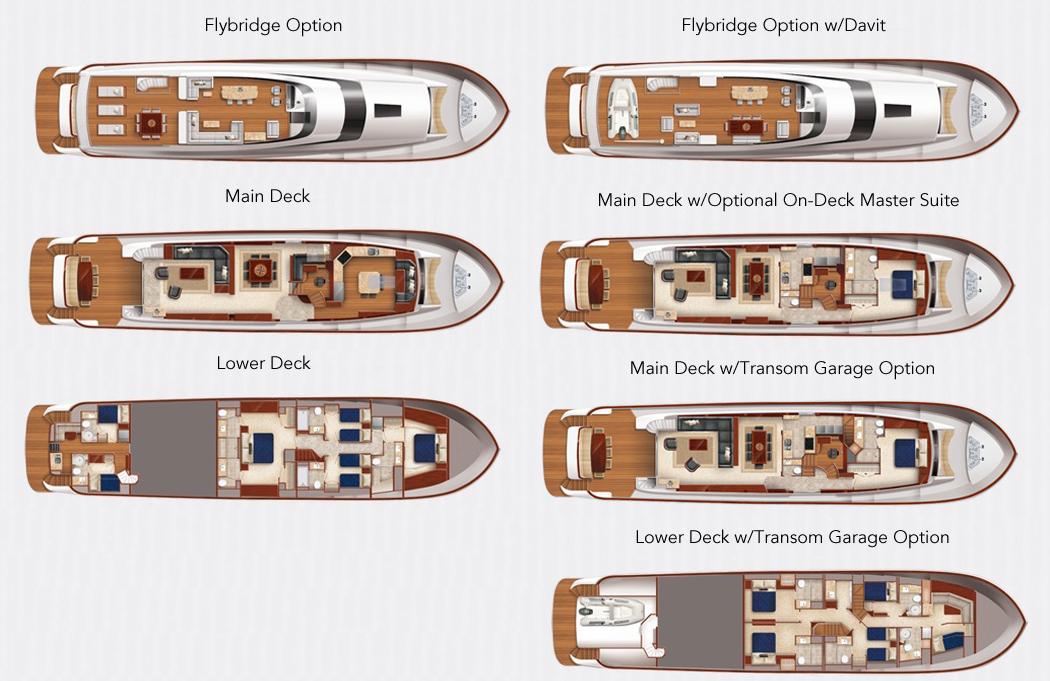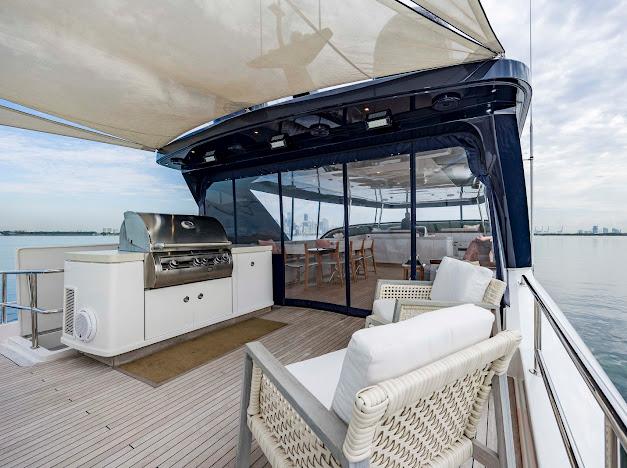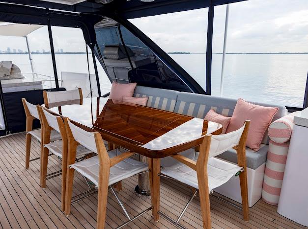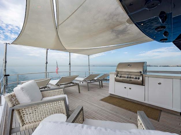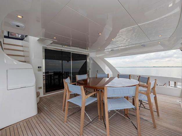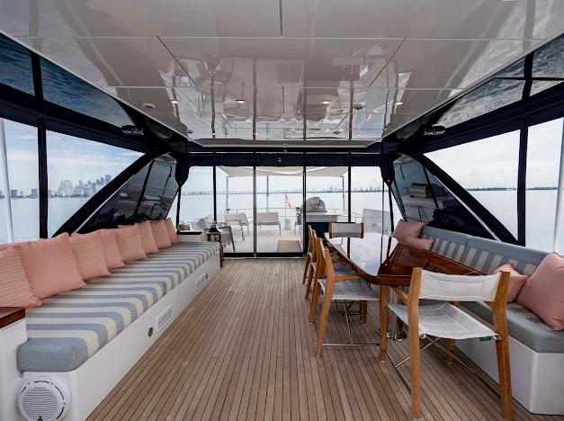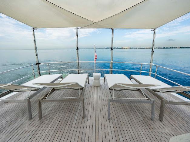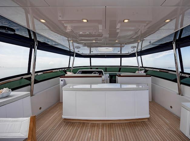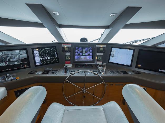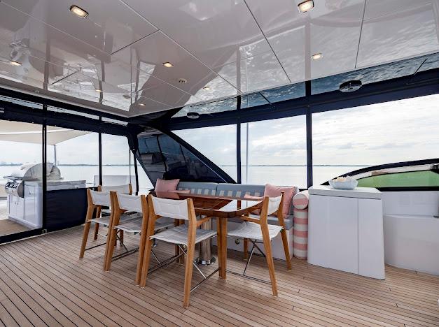 Сверху располагается огромный флайбридж, где можно наслаждаться панорамным обзором 360° любимой гавани, отдыхая на солнце или в тени. Команда дизайнеров разработала инновационную модульную мебель, позволяющую адаптировать флайбридж под конкретные потребности владельца. Роскошная обеденная зона на открытом воздухе, комфортные лаунжи, большой мокрый бар и многое другое — всё доступно для создания по-настоящему уникального пространства. На посту управления флайбриджа установлены два капитанских кресла; предусмотрено место до трёх мониторов и других систем управления, необходимых для эксплуатации яхты. Кормовую часть флайбриджа можно оборудовать кран-балкой для тендера и водных игрушек либо расширенной мебельной компоновкой для развлечений. При выборе второго варианта тендер и водные игрушки размещаются на гидравлическом лифте, закреплённом на купальной платформе.