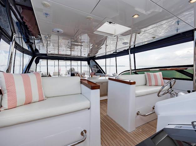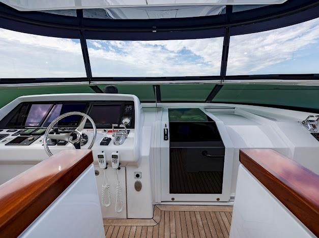 Поднятая рулевая рубка (raised pilothouse), расположенная всего на несколько ступеней выше главного входа рядом с парадной лестницей, действительно впечатляет. Пост управления рассчитан на установку расширенного пакета электроники и многофункциональных дисплеев, чтобы навигация, связь и судовые системы были у капитана под рукой. В центре — система мониторинга Hatteras с сенсорным управлением, которая контролирует все основные системы: обороты, давление масла, диагностику двигателей, уровни топлива и воды, тревоги трюмов и многое другое. Из капитанского кресла весь корабль находится под контролем. В рубке также есть L-образный диван для гостей или экипажа.