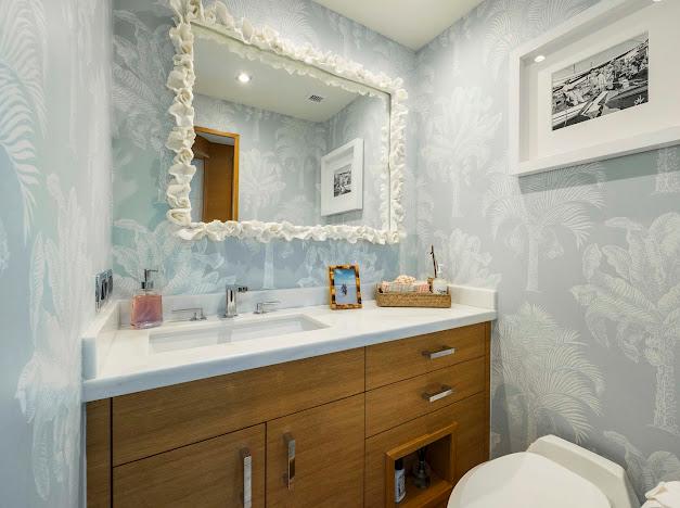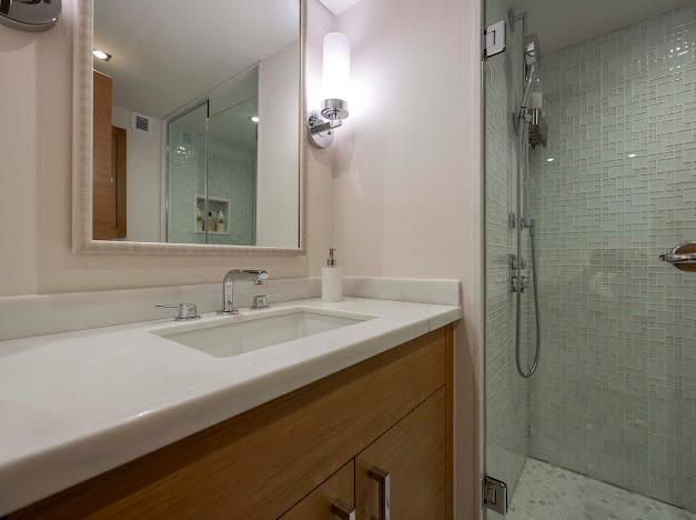 • Каменная столешница/фартук/бортики с врезной фарфоровой раковиной (в носовом гостевом санузле — две раковины)