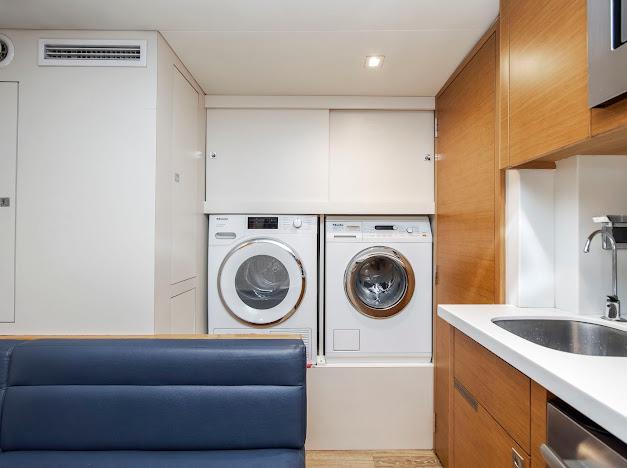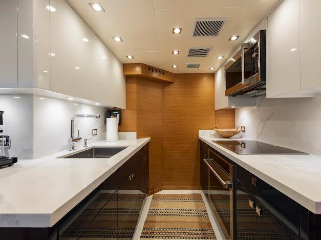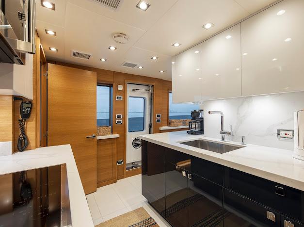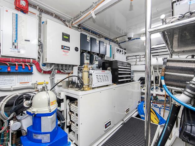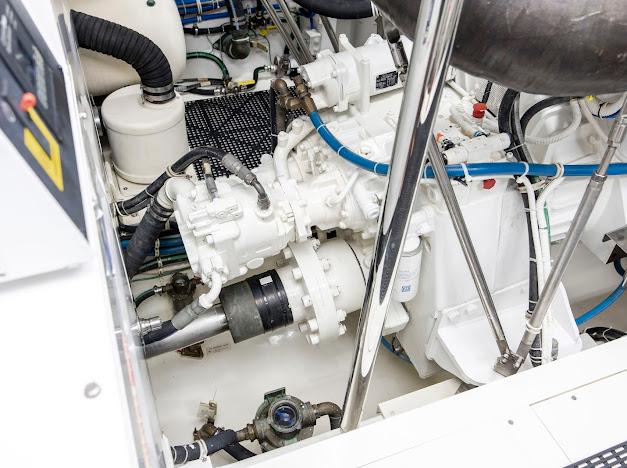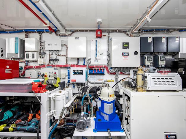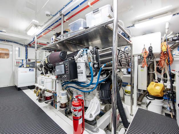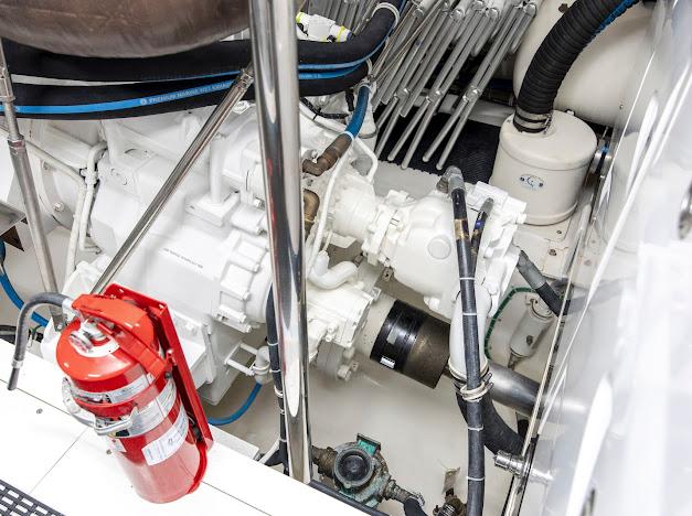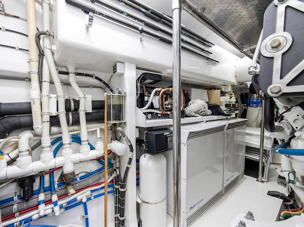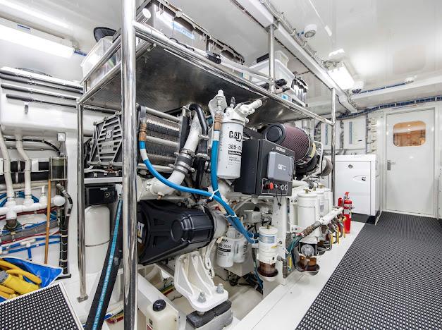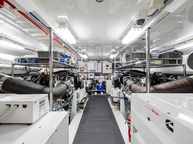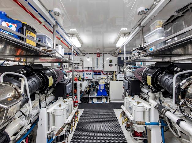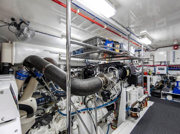 Неприметный трап с кормовой палубы ведёт вниз в помещения экипажа и машинное отделение. Если рулевая рубка — «мозг» судна, то это — его «сердце». Безупречно организованное машинное отделение рассчитано на стандартную установку двух дизелей CAT C32 ACERT мощностью 1 900 л.с. каждый. Для владельцев, ориентированных на более высокую скорость, доступен апгрейд до двух MTU 16V2000 CR мощностью 2 600 л.с. каждый. Системы размещены централизованно, все шланги и электропроводка закреплены и промаркированы для удобства доступа.