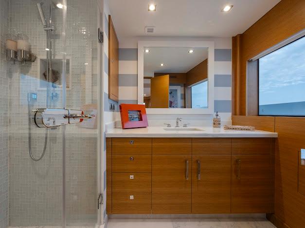 КАЮТА НА ГЛАВНОЙ ПАЛУБЕ С ПОЛНОЙ ВАННОЙ КОМНАТОЙ БЫЛА ПРЕОБРАЗОВАНА В МЕДИА-КОМНАТУ, НО МОЖЕТ БЫТЬ ЛЕГКО ВОССТАНОВЛЕНА В МАСТЕР-КАЮТУ.