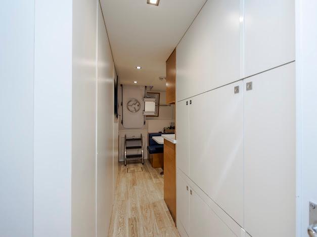 Помещения экипажа находятся сразу за машинным отделением и доступны как с трапа кормовой палубы, так и через дверь в транце, что удобно и у причала, и на ходу. В составе — отдельная каюта капитана и двухъярусная каюта для команды. У каждой — собственный санузел. Общая мини-кухня в коридоре оснащена микроволновой/конвекционной печью, мойкой и холодильником.