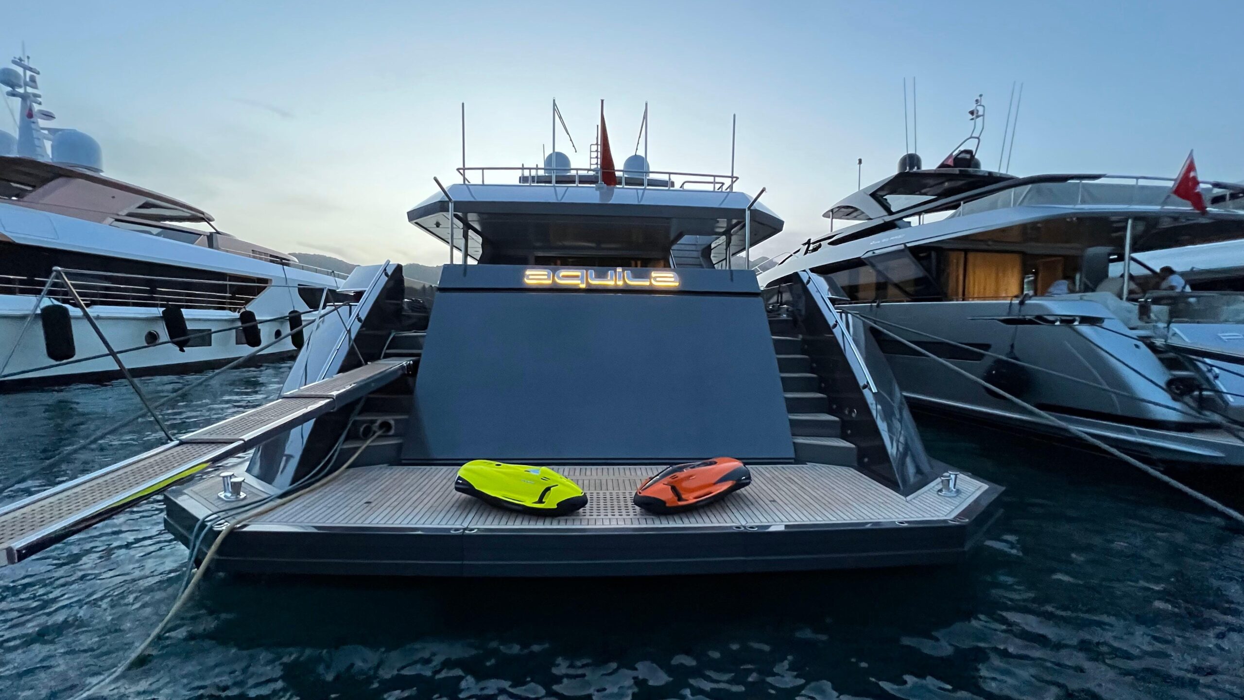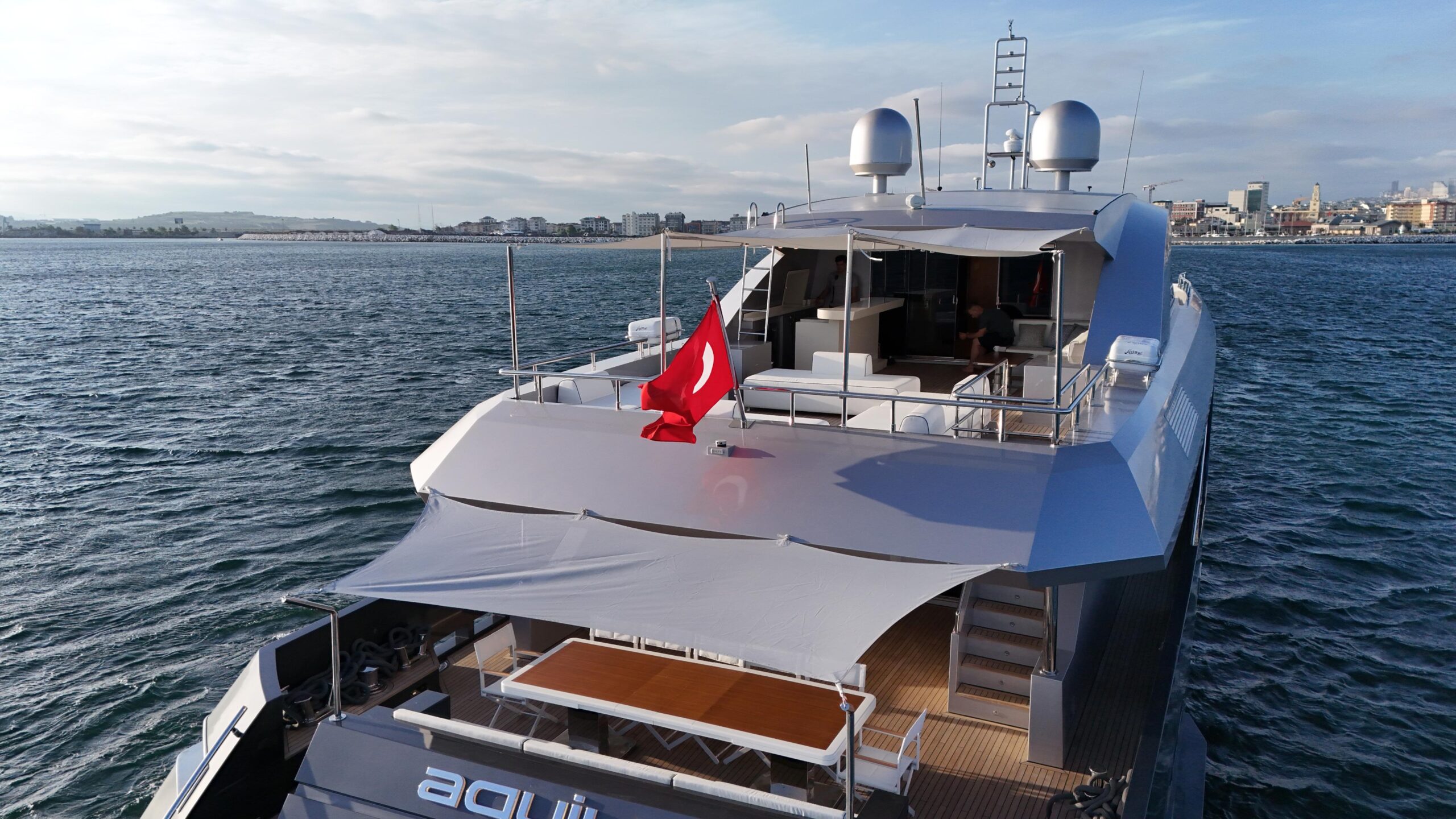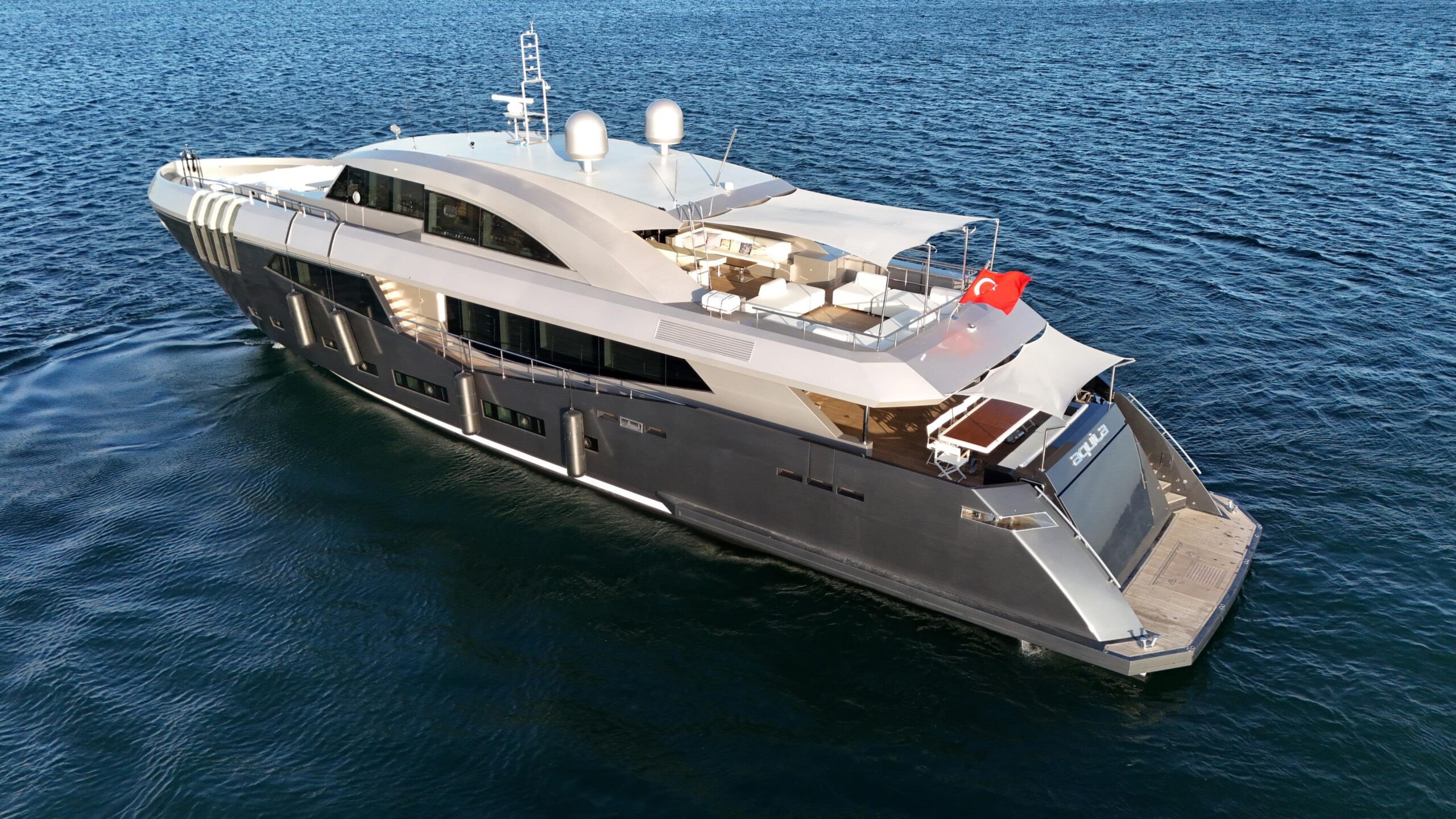 M/Y Aquila изначально была разработана Ginton Naval Architects в 2015 году, отличается характерным «акульим» профилем и была построена верфью Mengi-Yay Yachts. Её ключевые характеристики включают общую длину (LOA) 37 м, ширину 7,7 м, осадку 2,1 м и максимальную скорость 23 узла.