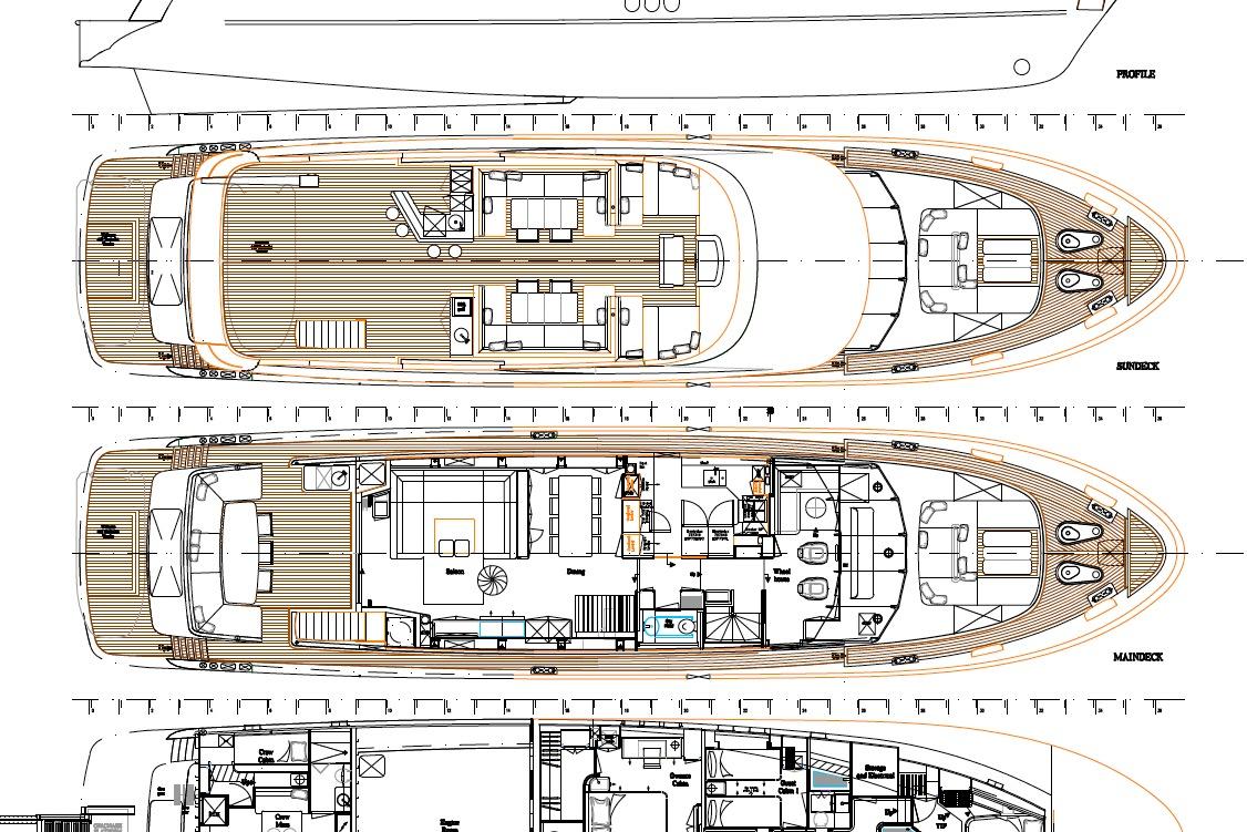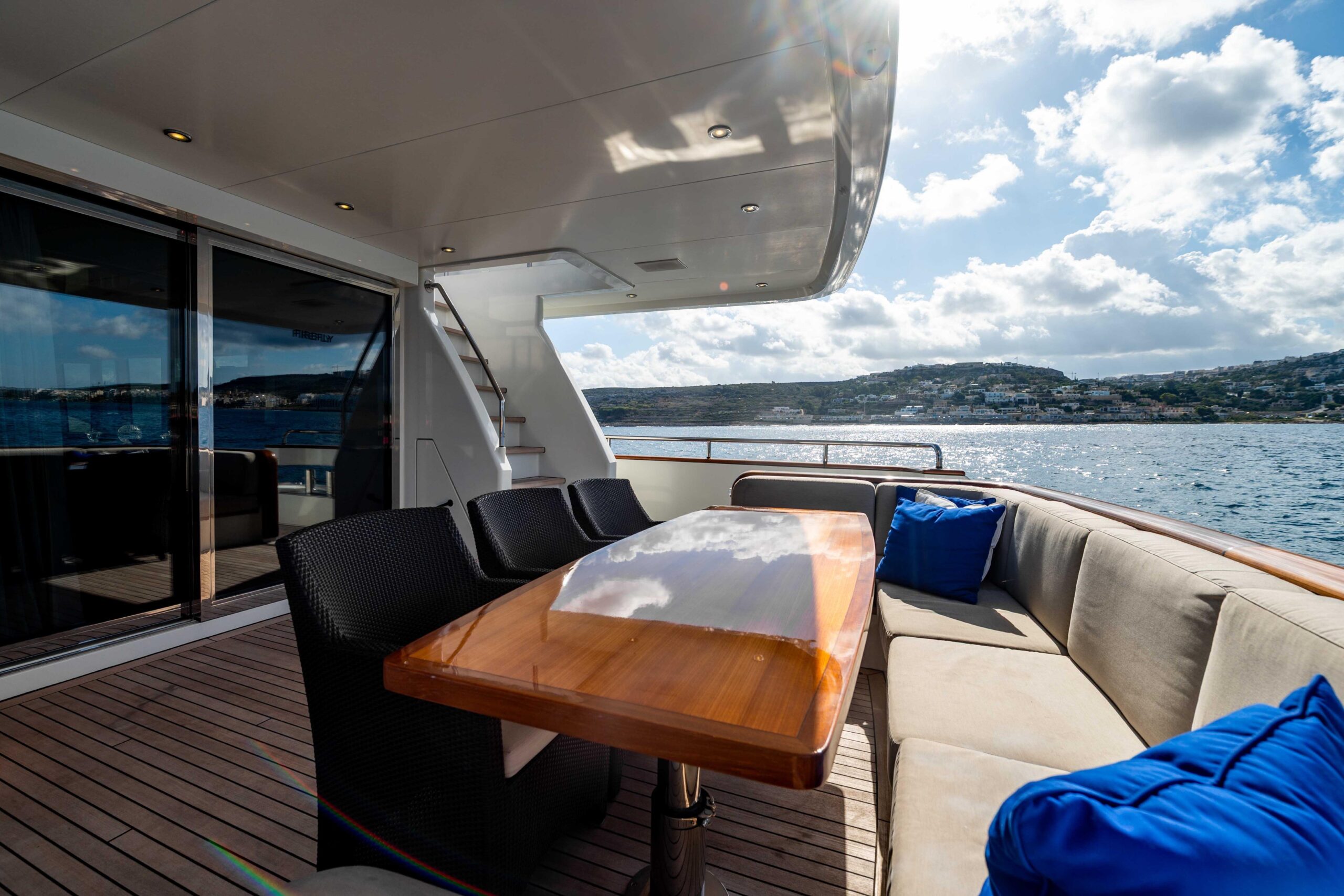Созданная для солнечных дней, чрезвычайно просторная флайбридж-палуба площадью 85 м² предлагает обширные зоны для отдыха со столами и эффектным баром с BBQ. Просторная кормовая палуба идеально подходит для обедов на свежем воздухе, а купальная платформа опускается в воду, превращаясь в удобную лестницу для купания, либо поднимается для комфортного выхода на берег.