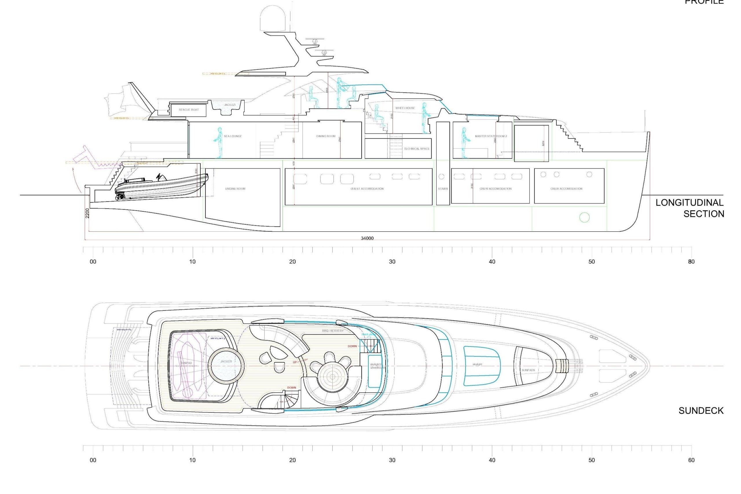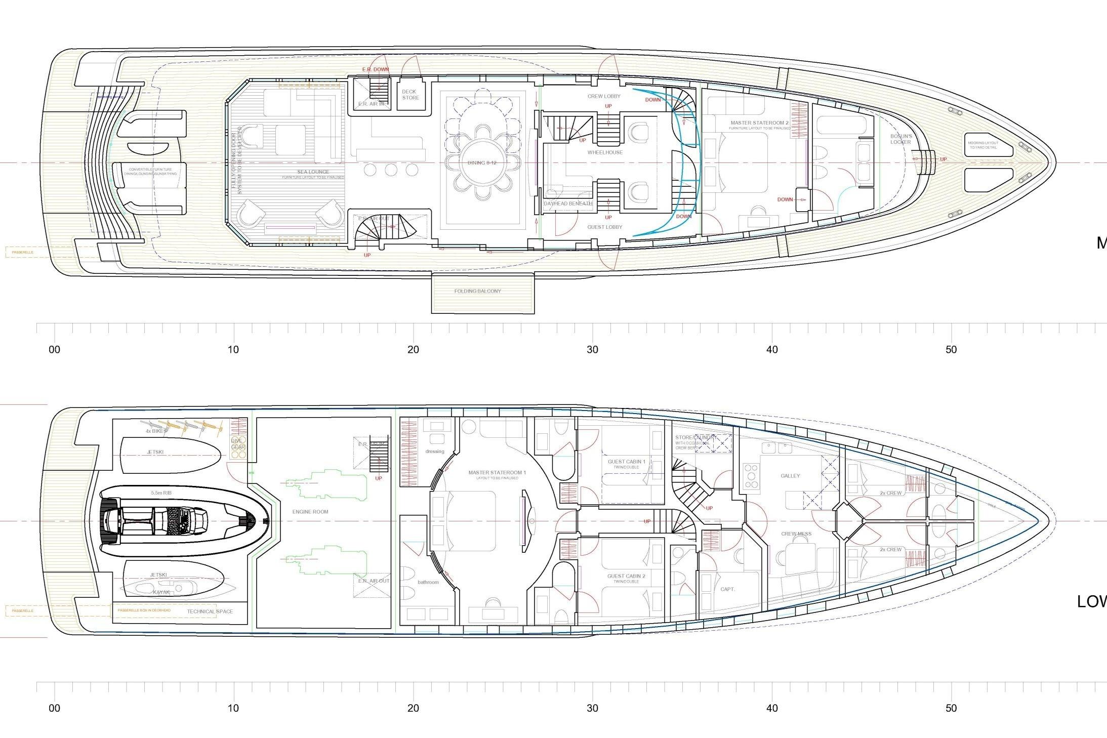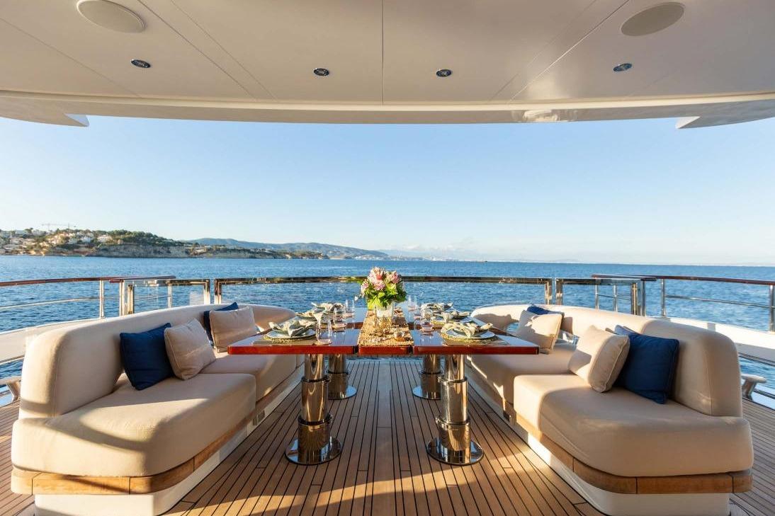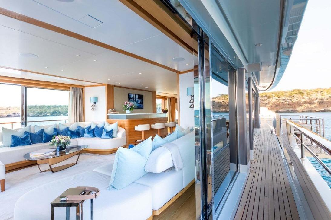 Внешний облик яхты определяется почти вертикальным форштевнем, плавными линиями и элегантными пропорциями, в то время как интерьер наполнен атмосферой спокойствия и естественного света. Салон главной палубы через стеклянные двери во всю высоту открывается на кормовую палубу, где обеденный стол трансформируется в большую зону для загара. В носовой части расположена формальная обеденная зона с балконом по правому борту, создающая плавную связь между интерьером и экстерьером. На солнечной палубе находятся джакузи, бар и просторные зоны отдыха, обеспечивающие комфорт и панорамные виды.
