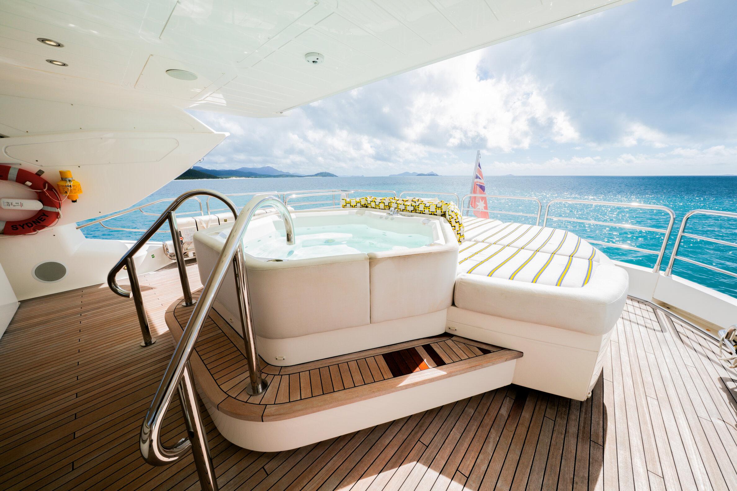 Просторные палубы включают солнечную флайбридж-зону с джакузи, баром и обеденной зоной в тени.