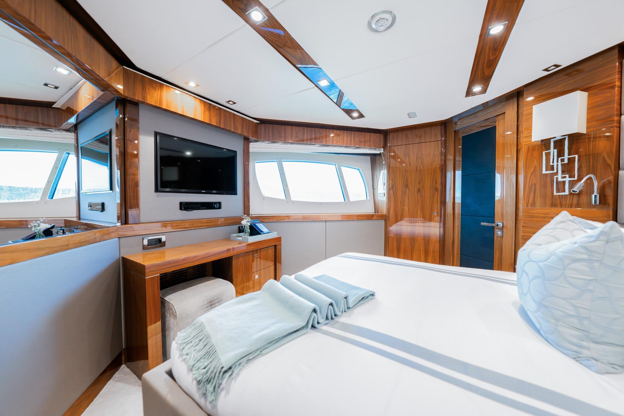 Интерьер яхты светлый и просторный, спроектирован для максимального использования естественного света и панорамных видов на океан. Главный салон и обеденная зона оснащены большими окнами, наполняющими пространство дневным светом. Нейтральная цветовая палитра и сдержанная современная отделка создают уютную и элегантную атмосферу.