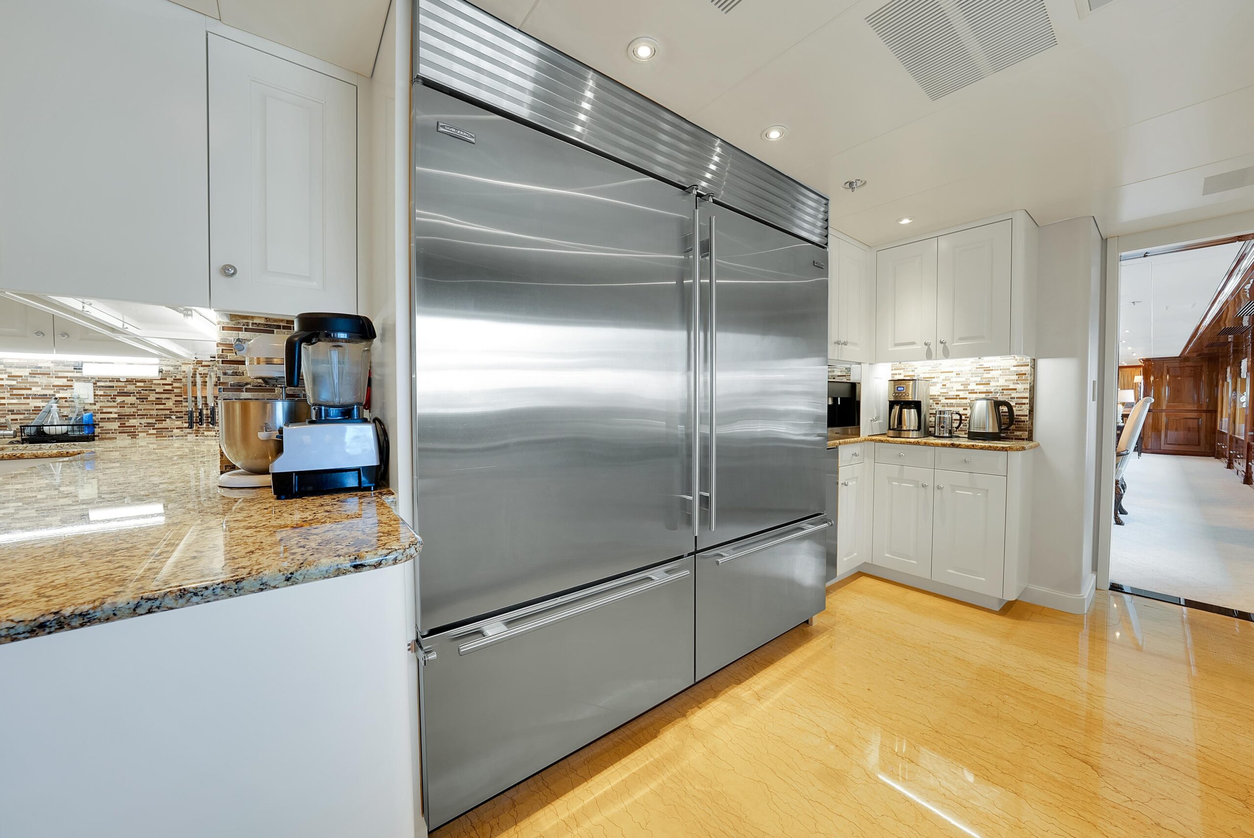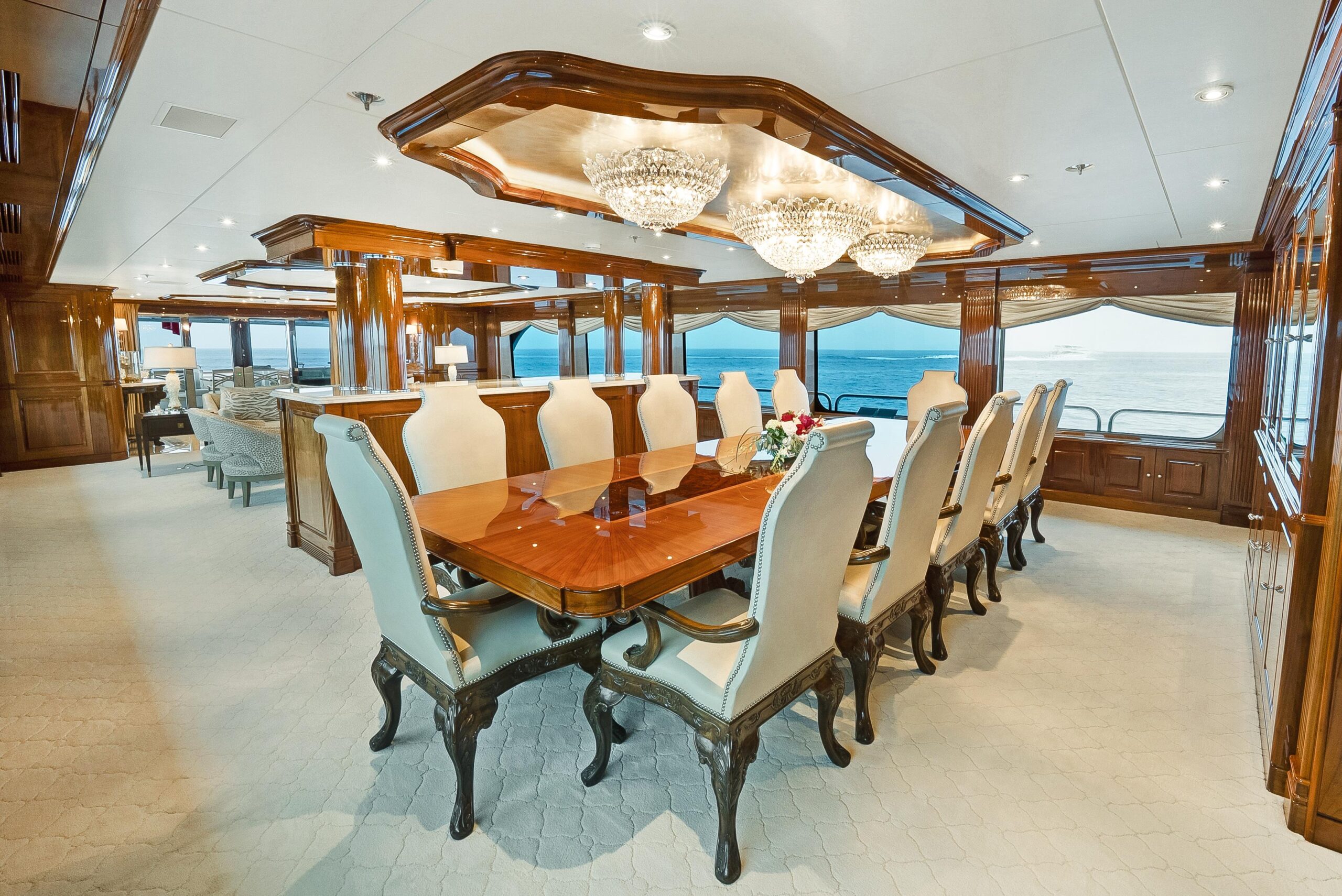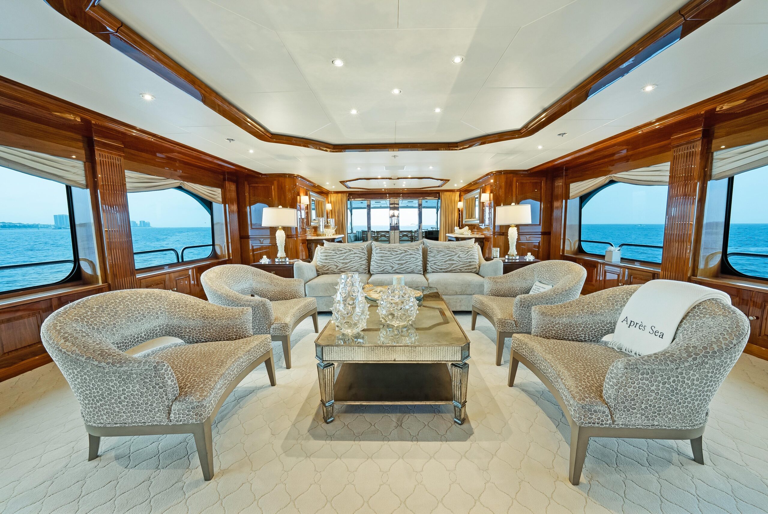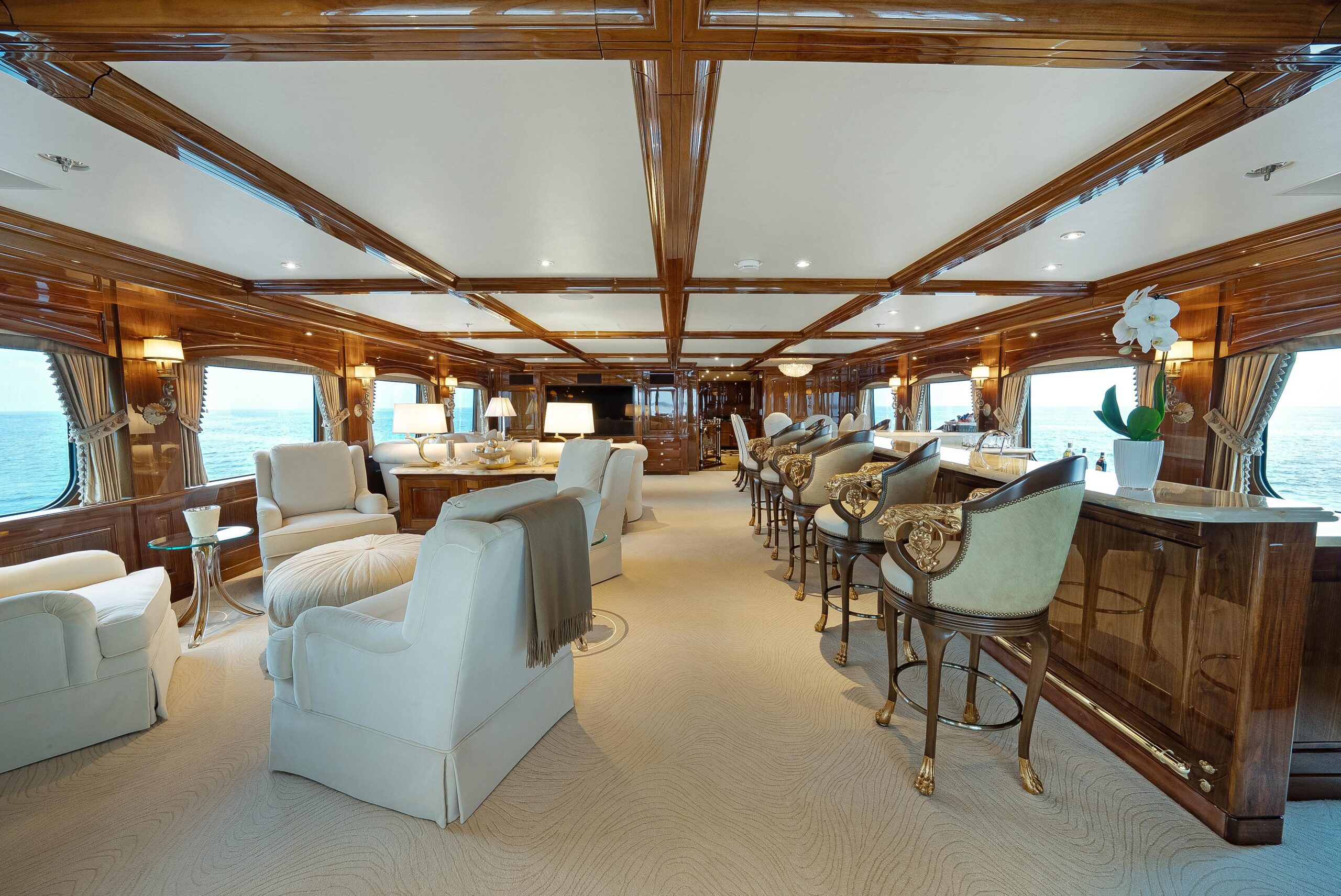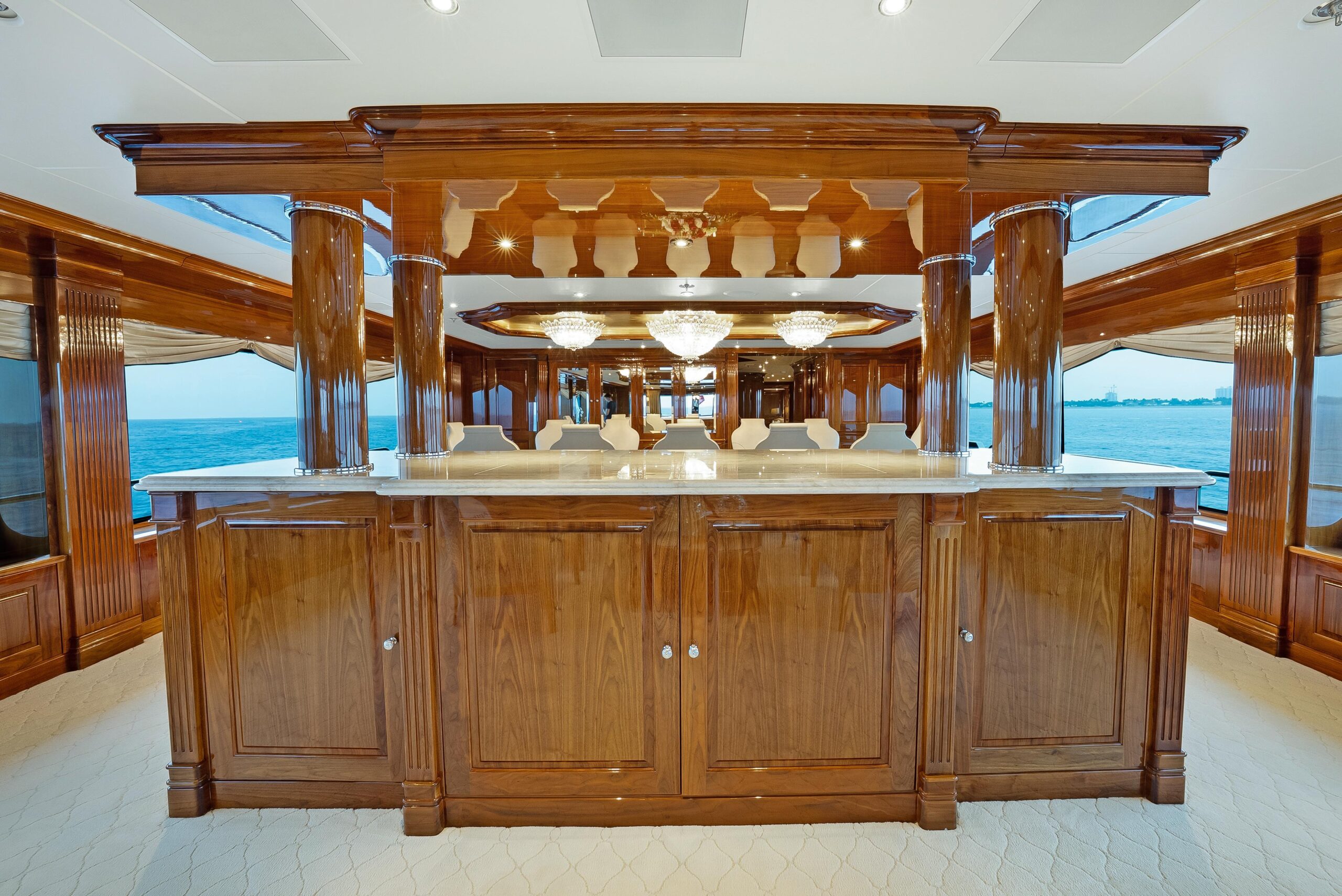 При посадке на яхту через кормовую палубу гостей встречает просторная зона с встроенным диваном-банкеткой и двумя тиковыми столами с четырьмя стульями — отличное место для завтрака или обеда. Здесь же — полноценный бар и три барных стула. С кормовой палубы можно пройти в главный салон через две большие автоматические двери, по бокам которых расположены стеклянные панели от пола до потолка. Главный салон — большой, светлый и «воздушный», с крупными окнами по обоим бортам и видом на воду практически с любого места. Отделка интерьера выполнена из высокоглянцевого чёрного ореха (Black Walnut). Мрамор по всей яхте подбирался вручную с акцентом на высочайшее качество. Войдя в главный салон, вы попадаете в красивый мраморный вестибюль. Далее по курсу — трёхместный диван, четыре кресла и кофейный столик в светлой нейтральной гамме. Ещё дальше — полу-перегородка со встроенным хранением и выдвижным ТВ. В носовой части — формальная обеденная зона с большим кастомным столом на 12 гостей. Слева впереди от обеденной зоны — массивная автоматическая дверь, отделяющая сервировочную кладовую (панtry) и камбуз от обеденной зоны; кладовая полностью оборудована для сервиса, как и большой профессиональный камбуз.
