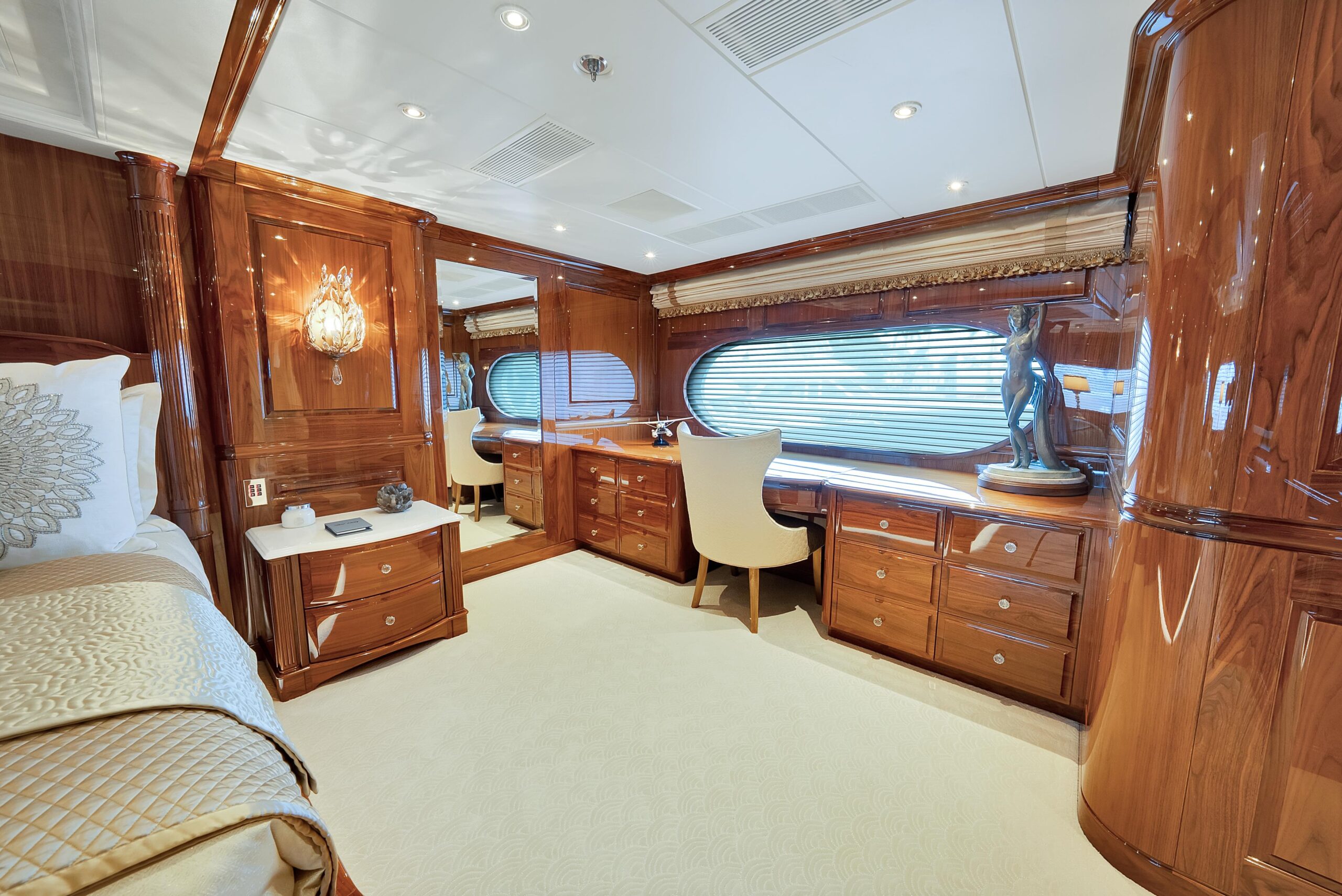 Полноширинная каюта владельца расположена на главной палубе. Кабинет владельца находится по правому борту при входе в коридор, ведущий к мастер-каюте, далее по курсу — сама мастер-каюта. Это очень просторная каюта, включающая (2) большие гардеробные, туалетный столик/зону vanity и раздельные ванные комнаты his/her. По левому борту расположена большая джакузи-ванна. В отделке сочетаются тканевые панели и сатиновая отделка стеновых панелей.