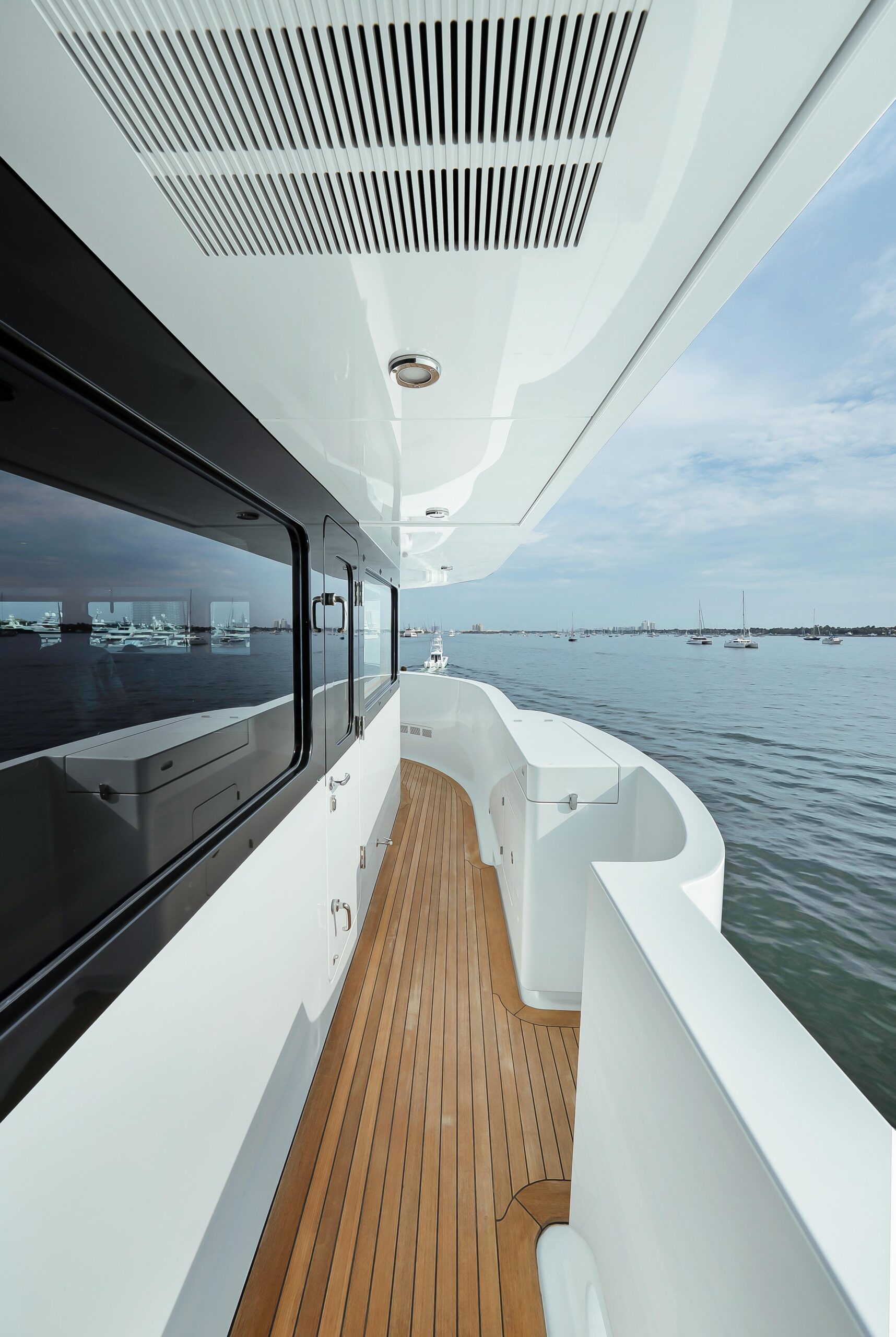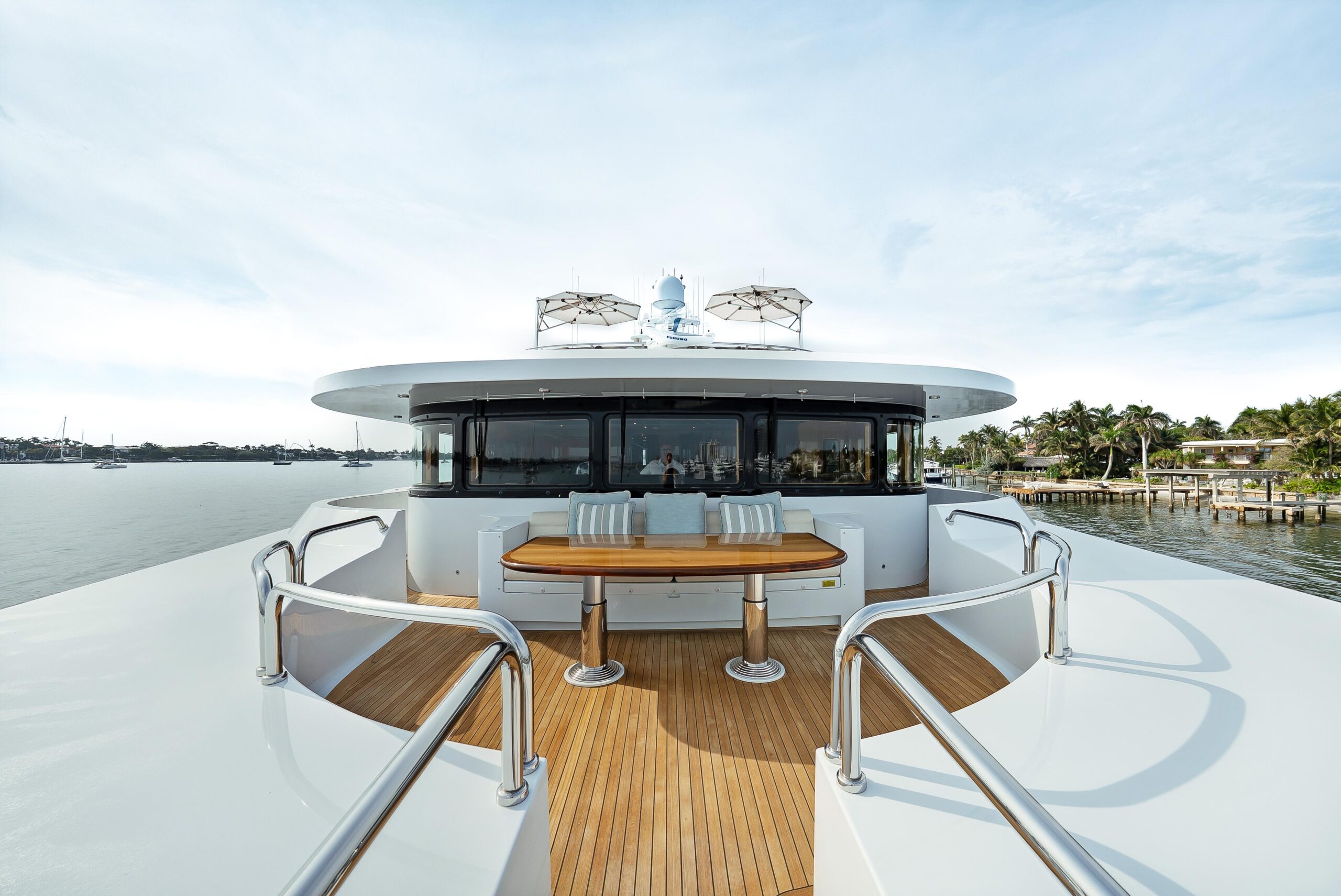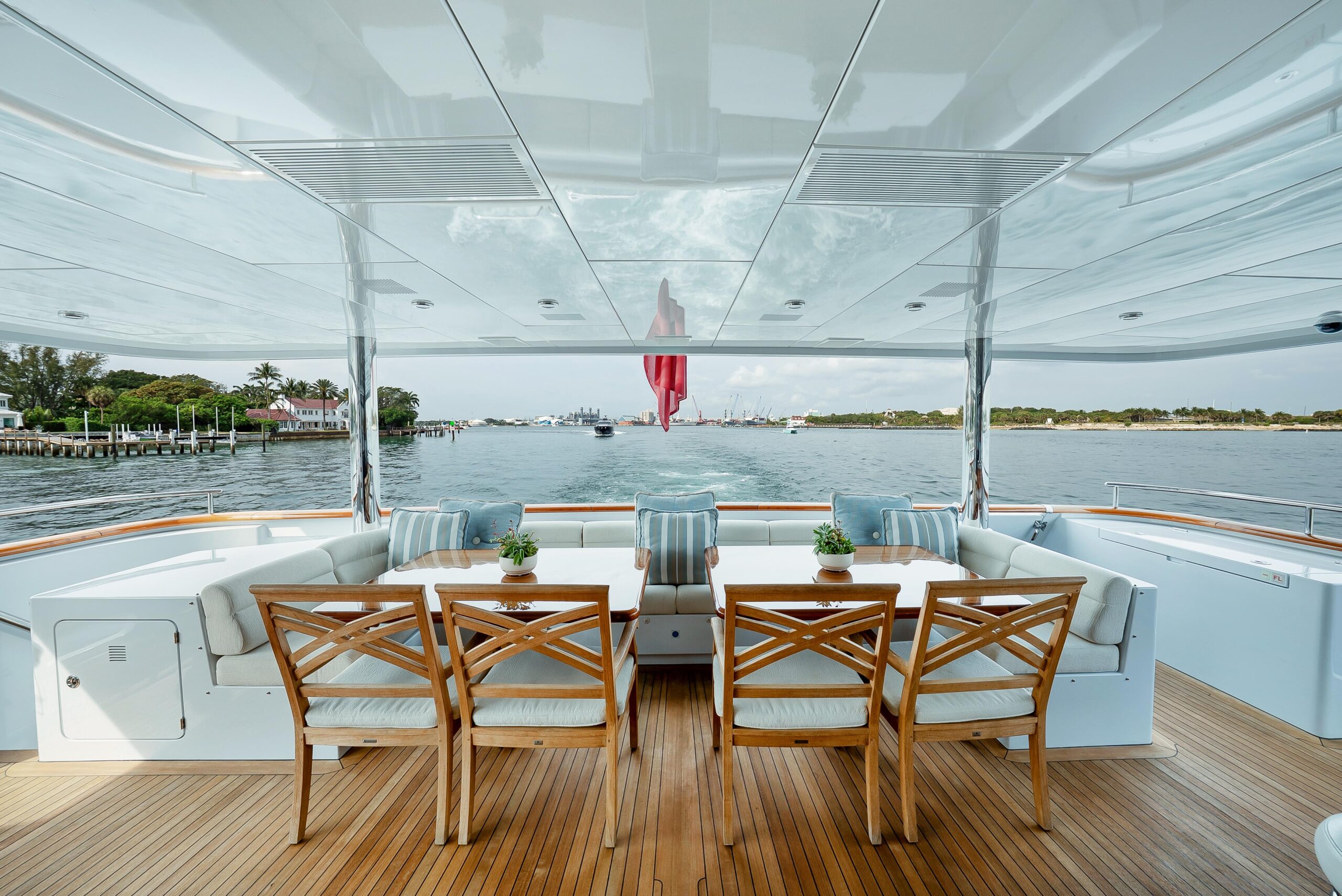 По левому борту находится большой L-образный диван с кофейным столиком — отличное место для просмотра ТВ или фильма на большом экране на передней переборке скайлаунжа. В кормовой части слева — игровой стол на 4 места. Окна в скайлаунже большие и расположены низко, обеспечивая хороший обзор с любого места. Двигаясь дальше в корму, вы выходите на мостиковую кормовую палубу (bridge deck aft) через две большие автоматические двери со стеклянными панелями от пола до потолка по бокам. Здесь расположен тиковый стол с посадкой на 12 человек — идеальная зона для вечерних ужинов с температурным контролем: охлаждение или подогрев сверху над обеденной зоной. В кормовой части — дополнительная зона неформального отдыха; впереди слева предусмотрен сервис-бар. По бортам обеденной зоны мостиковой кормовой палубы установлены раздвижные открывающиеся стеклянные окна, позволяющие при необходимости защитить гостей от ветра.