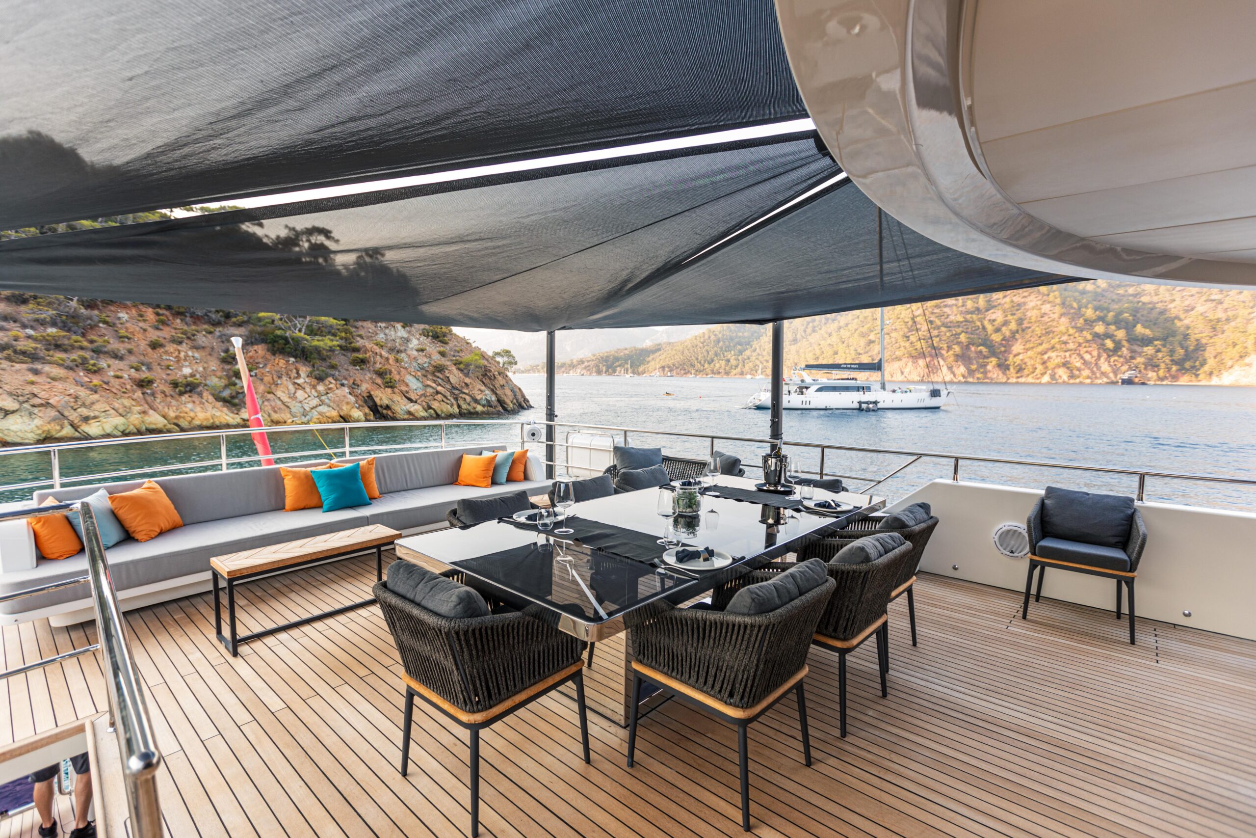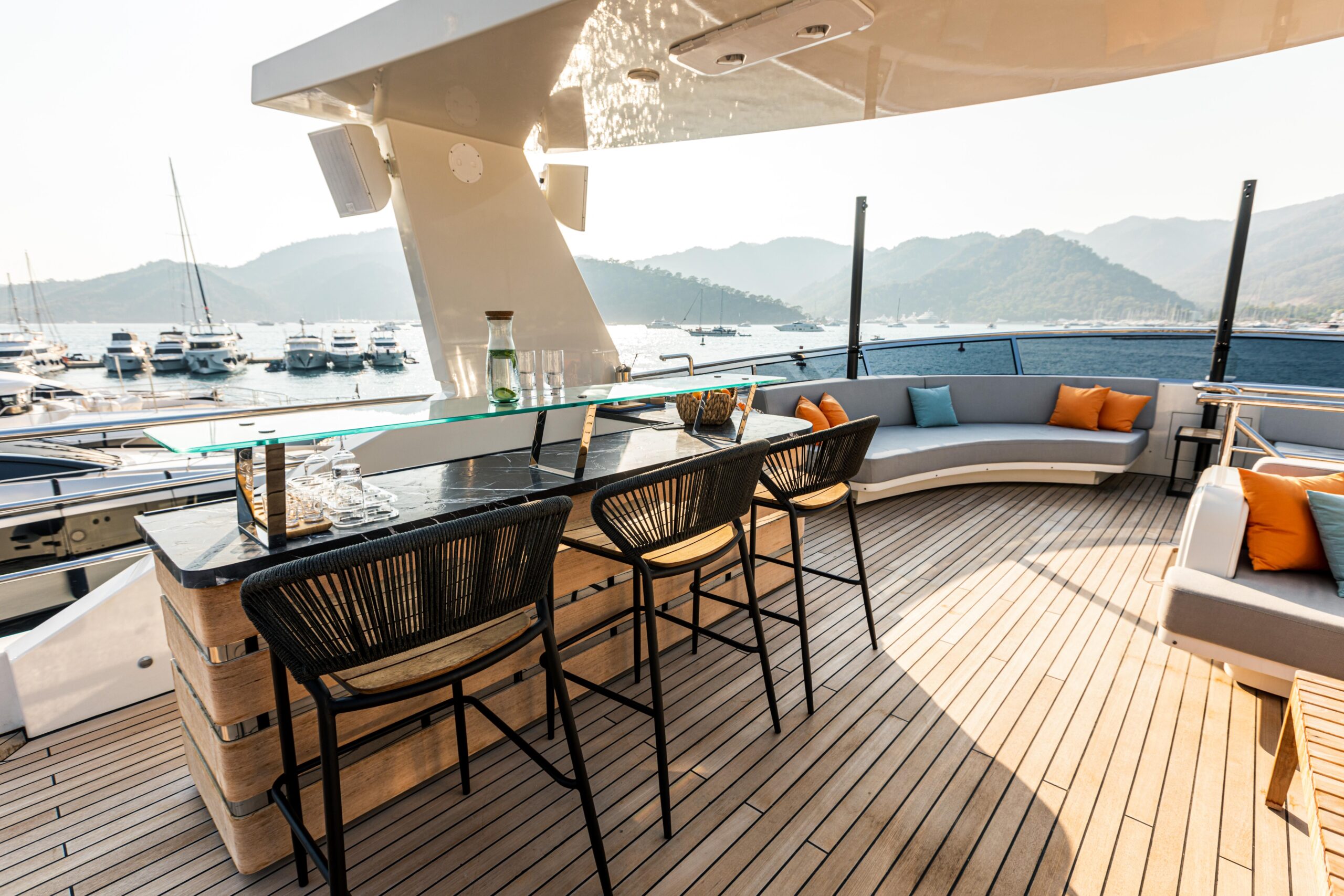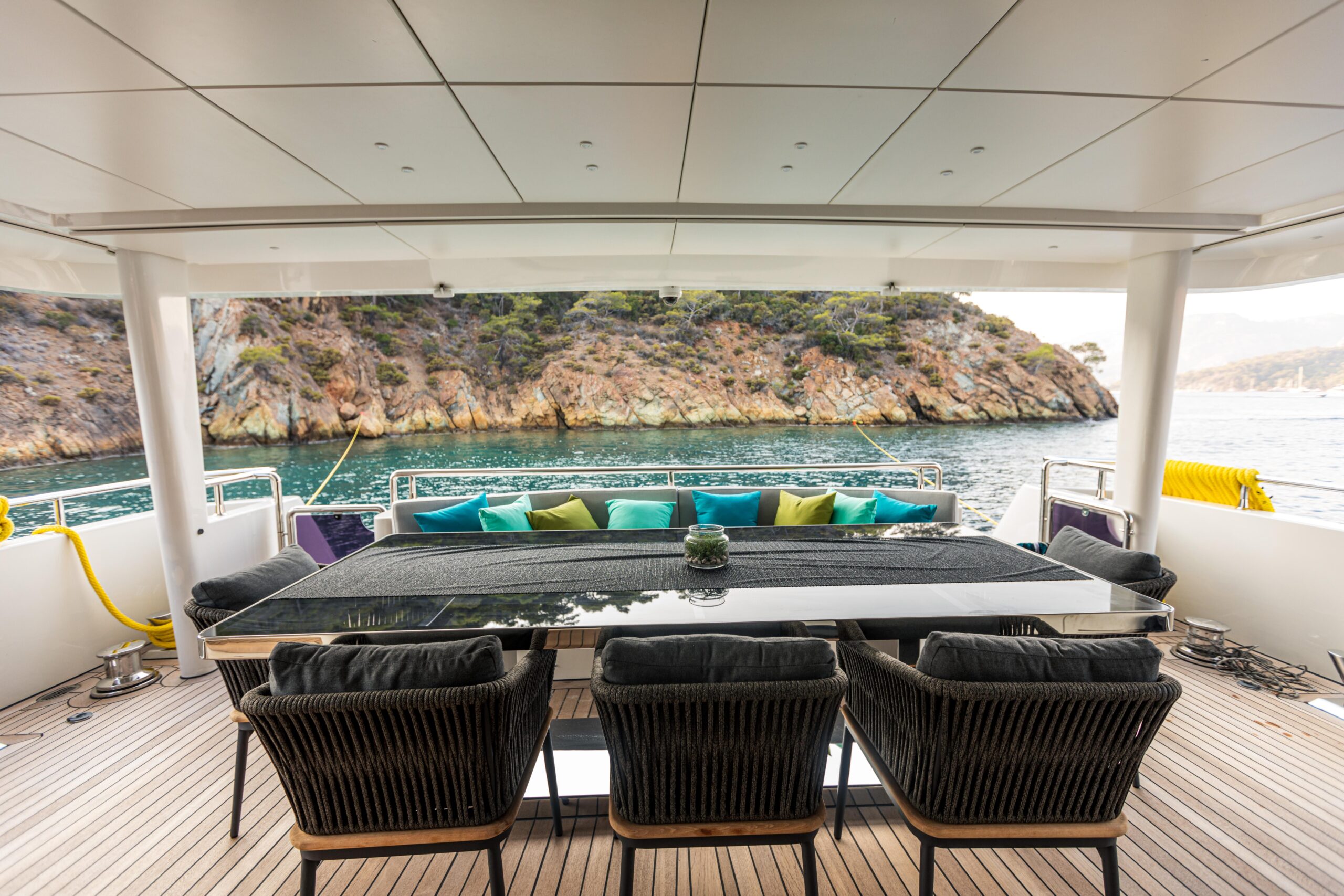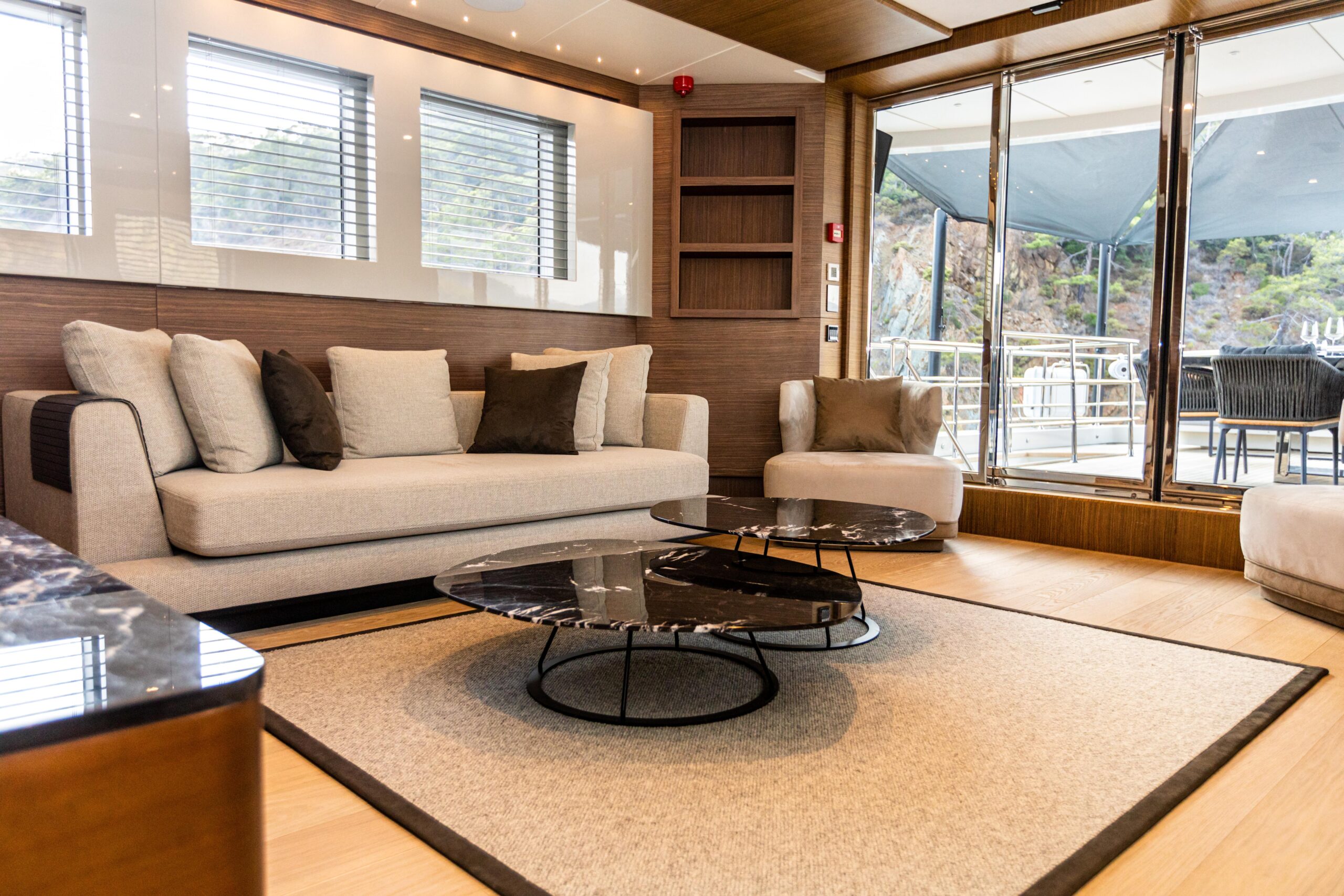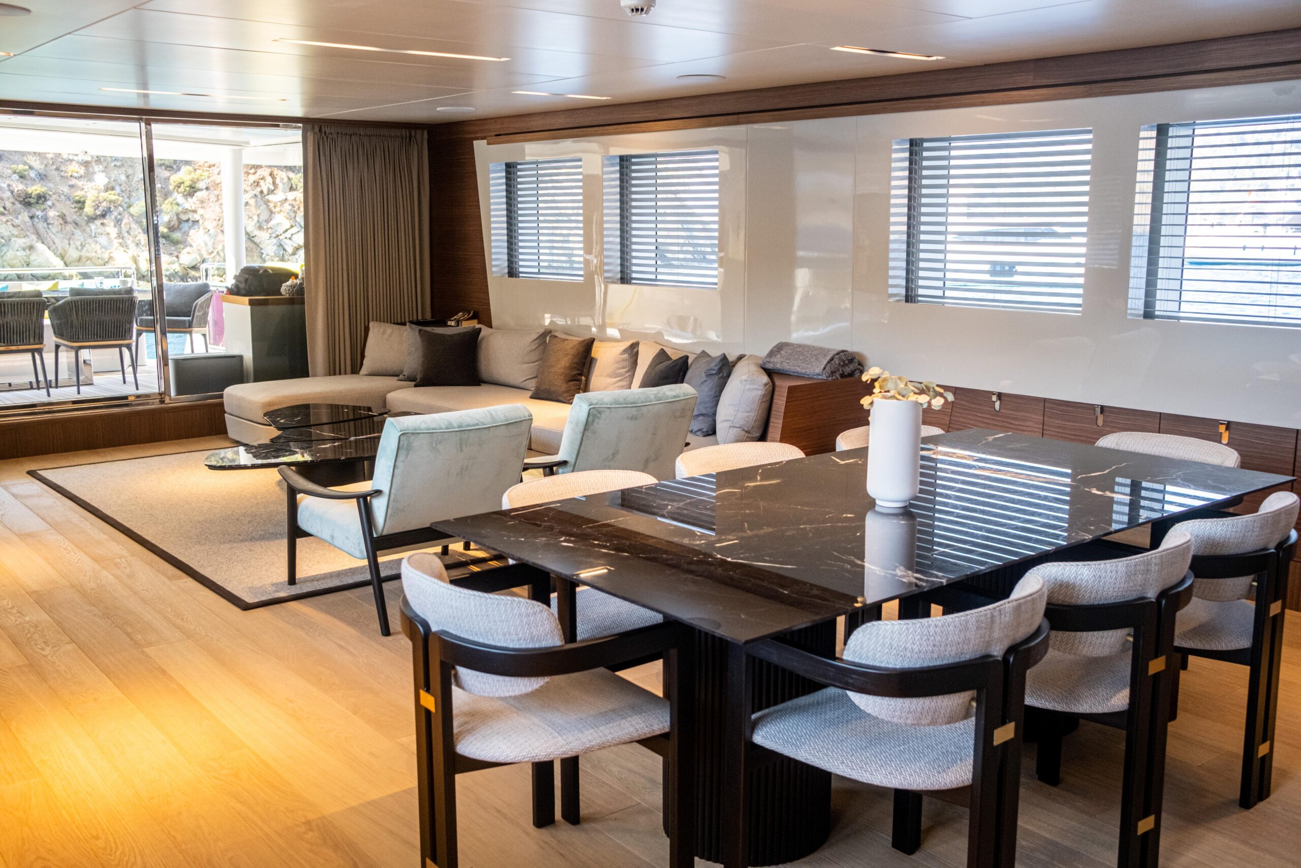При входе из кокпита через просторную раздвижную стеклянную дверь гостей встречает уютный главный салон. Индивидуально изготовленная Г-образная зона отдыха с журнальным столиком с мраморной столешницей и креслами мятно-зеленого цвета создает атмосферу уюта и стиля. Телевизор 55", встроенный в стеклянный шкаф, обеспечивает комфортный просмотр с любой точки салона, а большие окна наполняют пространство естественным светом. Автоматические эстетичные жалюзи обеспечивают приватность в вечернее время. В носовой части расположен обеденный салон с большим мраморным столом и посадочными местами до восьми гостей.