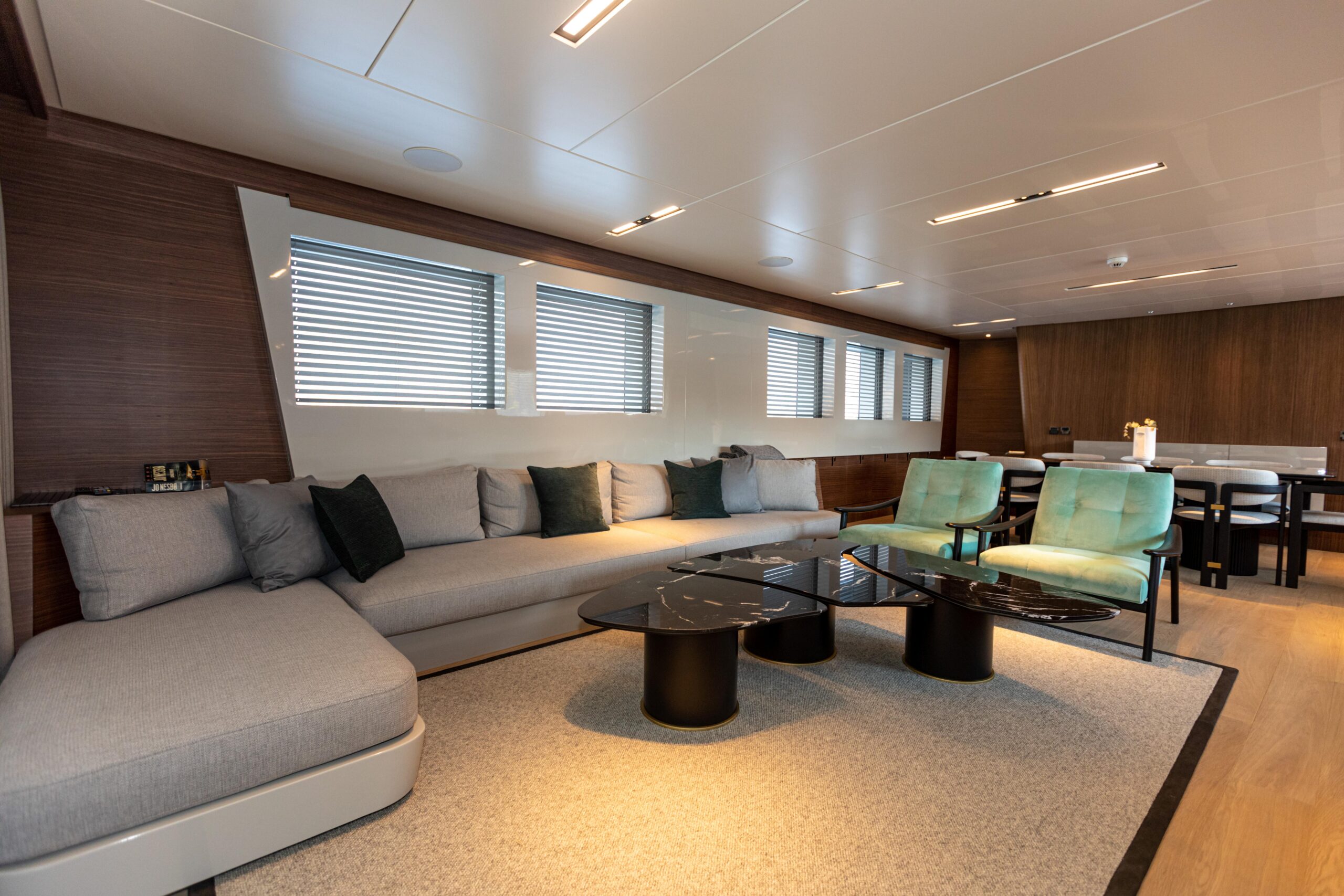 При входе из кокпита через просторную раздвижную стеклянную дверь вы попадаете в главный салон. Индивидуально изготовленная L-образная зона отдыха с журнальным столиком с мраморной столешницей и мятно-зелёными креслами создаёт атмосферу уюта и стиля. Телевизор 55" в стеклянном шкафу обеспечивает просмотр из любой точки, а большие окна наполняют пространство естественным светом. Автоматические жалюзи обеспечивают приватность в вечернее время. В носовой части расположена обеденная зона с большим мраморным столом и посадкой до восьми гостей.