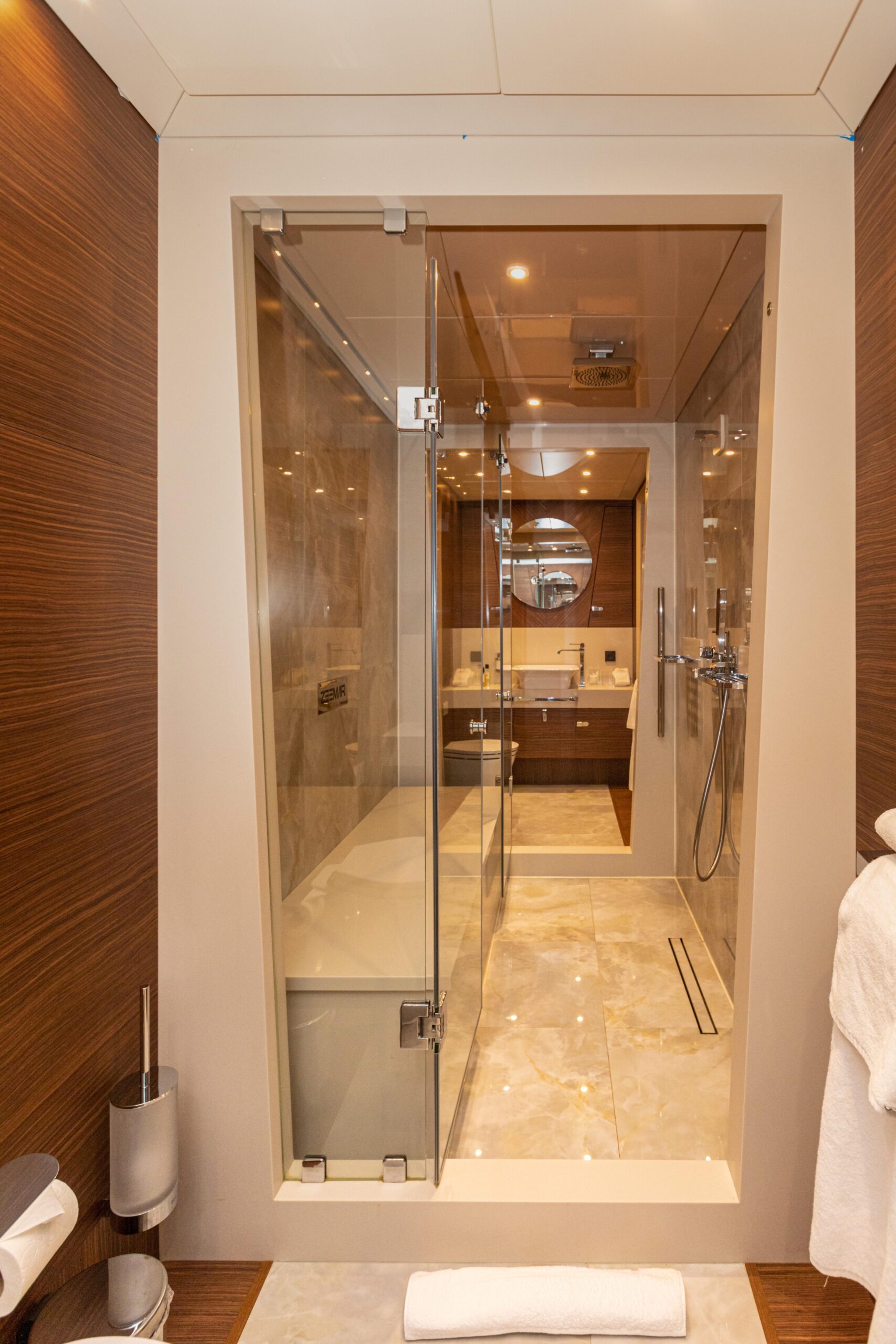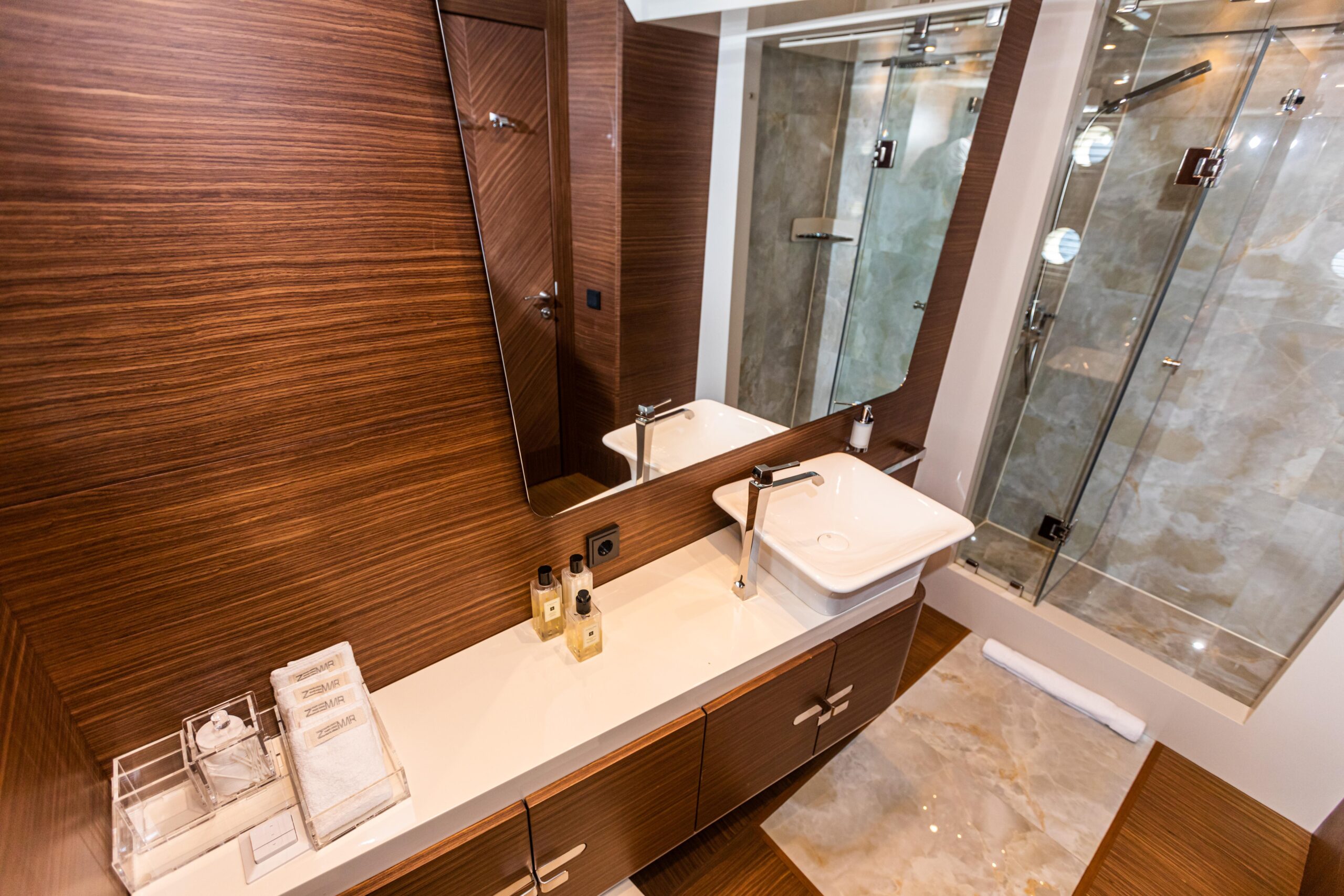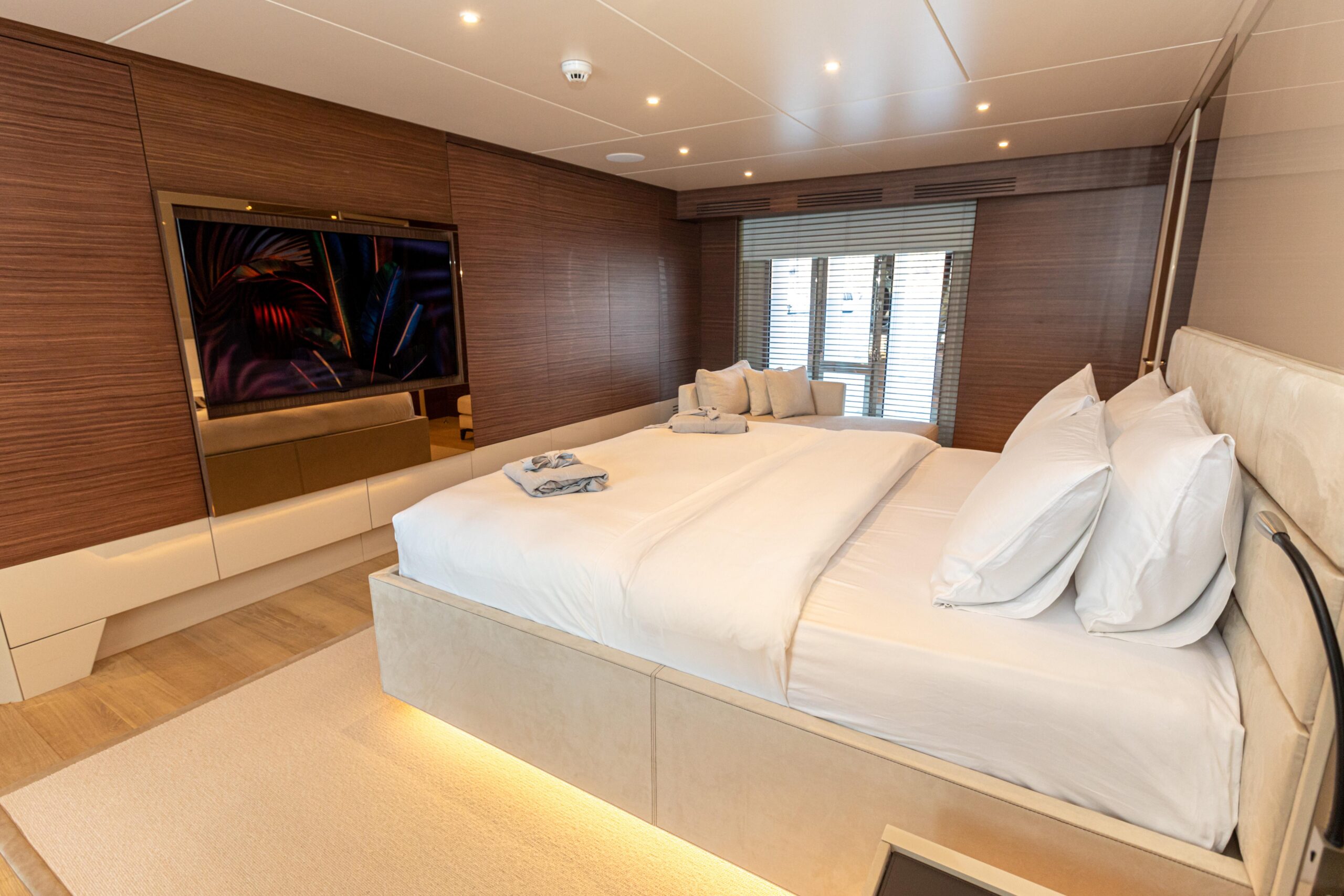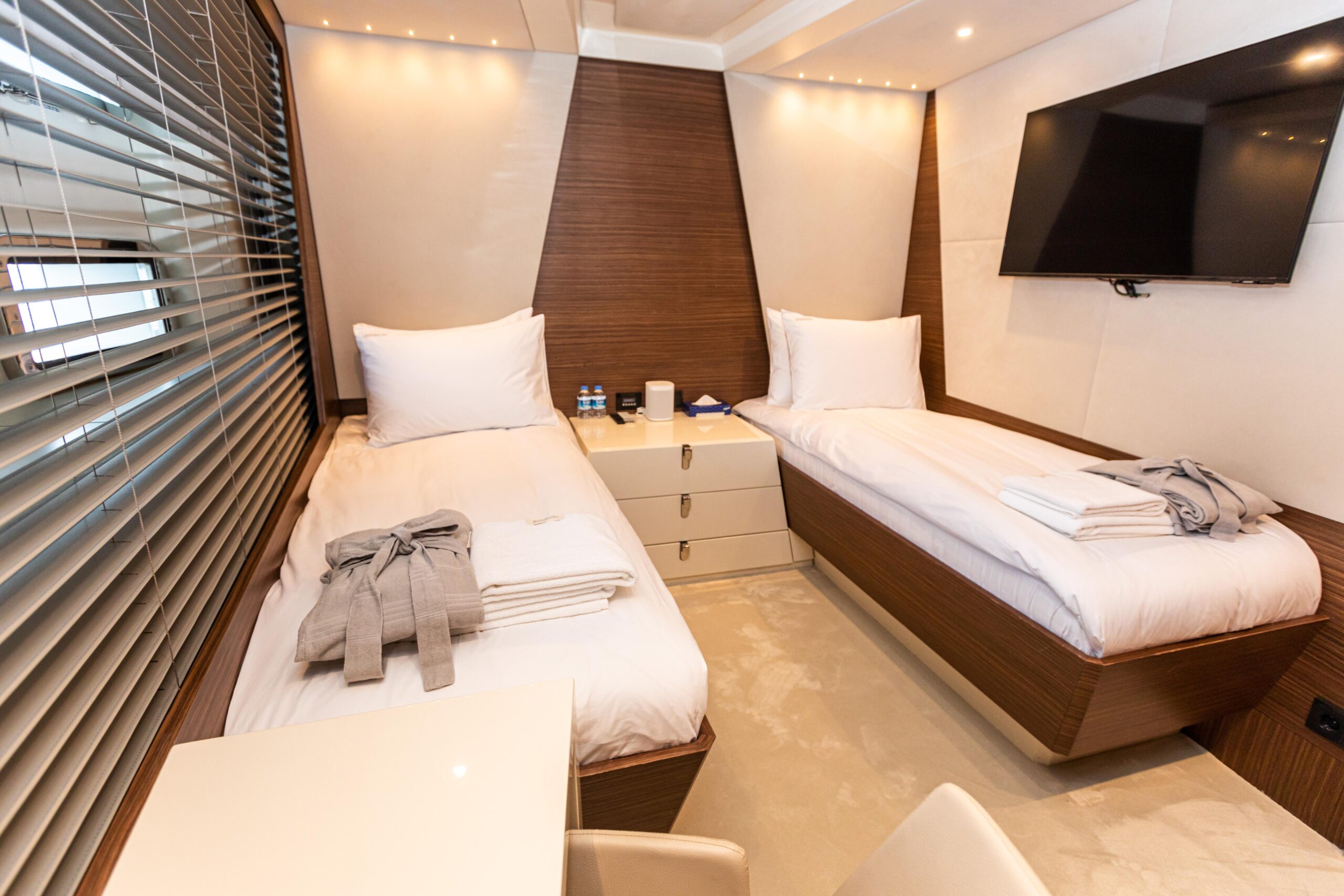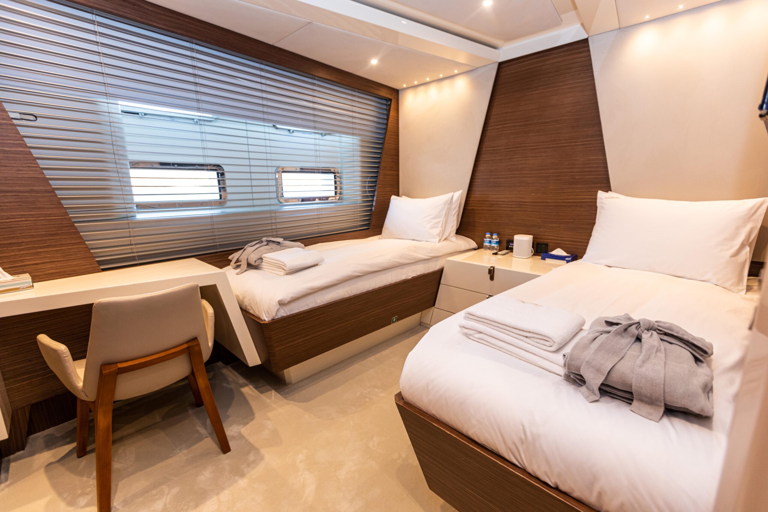 ZEEMAR предлагает размещение до 10 гостей в роскошных каютах. На главной палубе находится мастер-каюта во всю ширину корпуса с кроватью queen-size у кормовой переборки. Панорамные окна во всю высоту наполняют каюту светом. На нижней палубе расположены две зеркальные VIP-каюты и две зеркальные каюты с раздельными кроватями, каждая — с кроватями queen-size или twin.