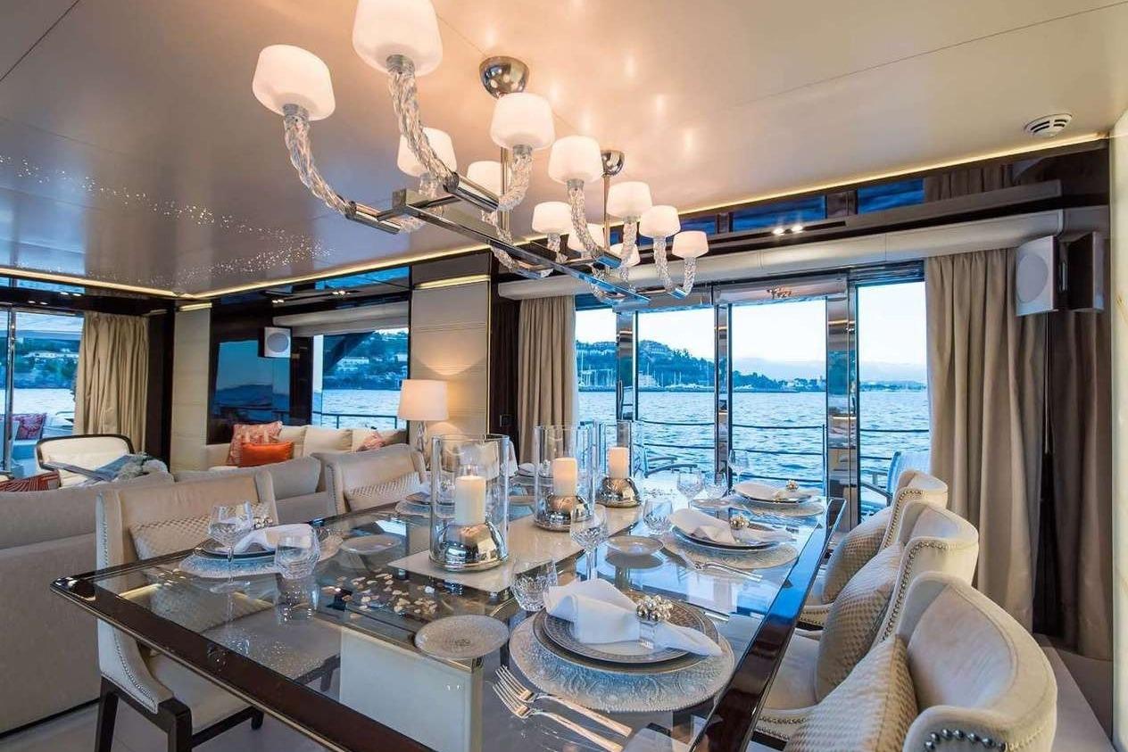 Яхта богата уникальными решениями, включая откидной балкон в обеденной зоне главного салона, панорамные виды из мастер-каюты, приватную лаунж-зону в носовой части перед мастер-каютой, джакузи на сандеке, подсвеченную стену из оникса и выполненные вручную мозаики.