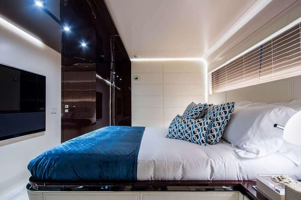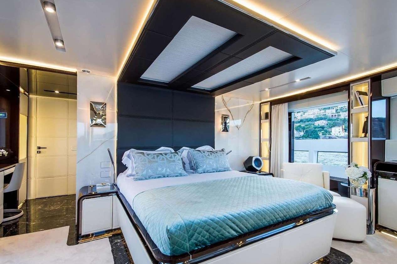 С кормовой части главной палубы с открытой обеденной зоной вы попадаете напрямую в главный салон, далее — во внутреннюю столовую, затем в камбуз, холл и дневной санузел, после чего — в мастер-каюту. Мастер-каюта включает гардеробную, ванную комнату с просторным душем и двойной раковиной, а также полноразмерную каюту во всю ширину корпуса с панорамными видами вперёд и прямым выходом в уединённую зону для загара.