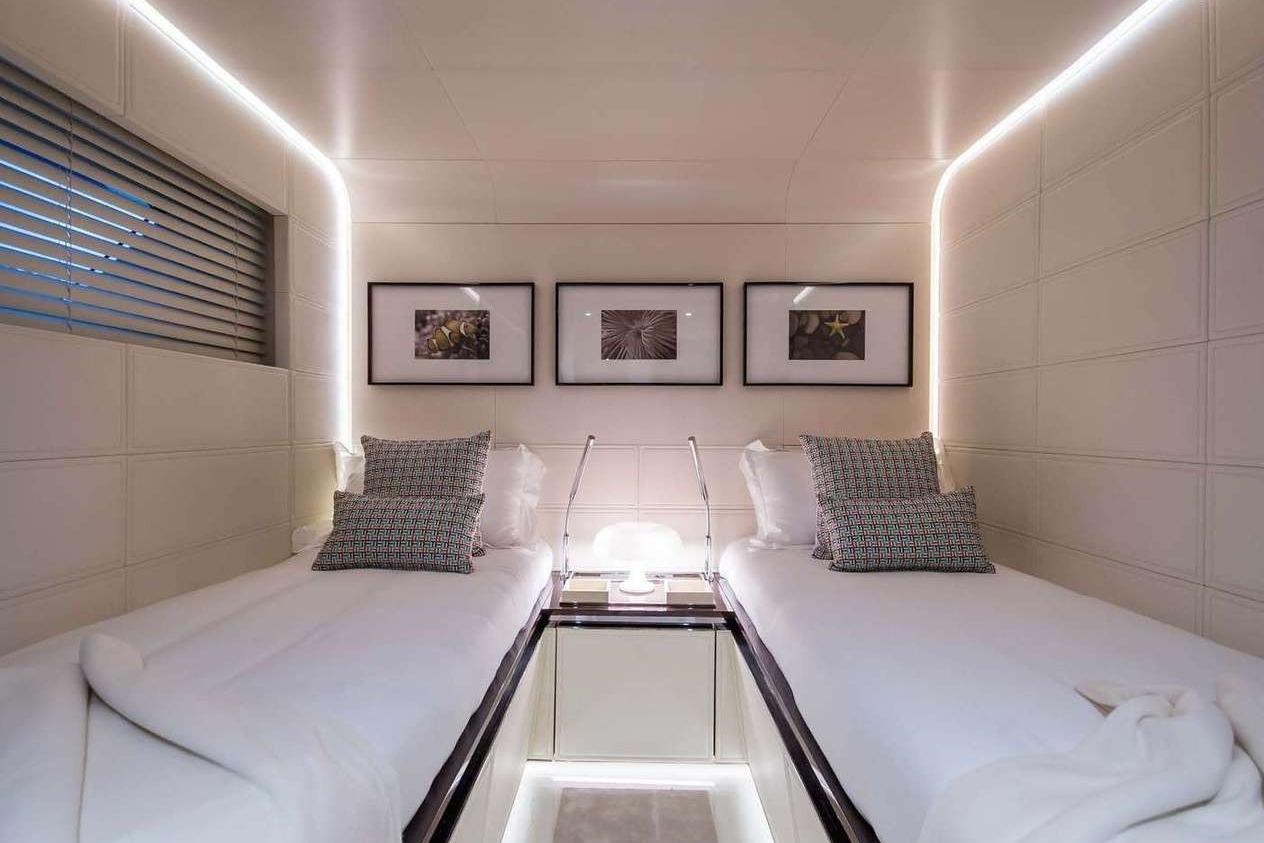 На нижней палубе расположены четыре гостевые каюты: две VIP-каюты с двуспальными кроватями, одна двухместная каюта и одна каюта с раздельными кроватями, все с собственными ванными комнатами.