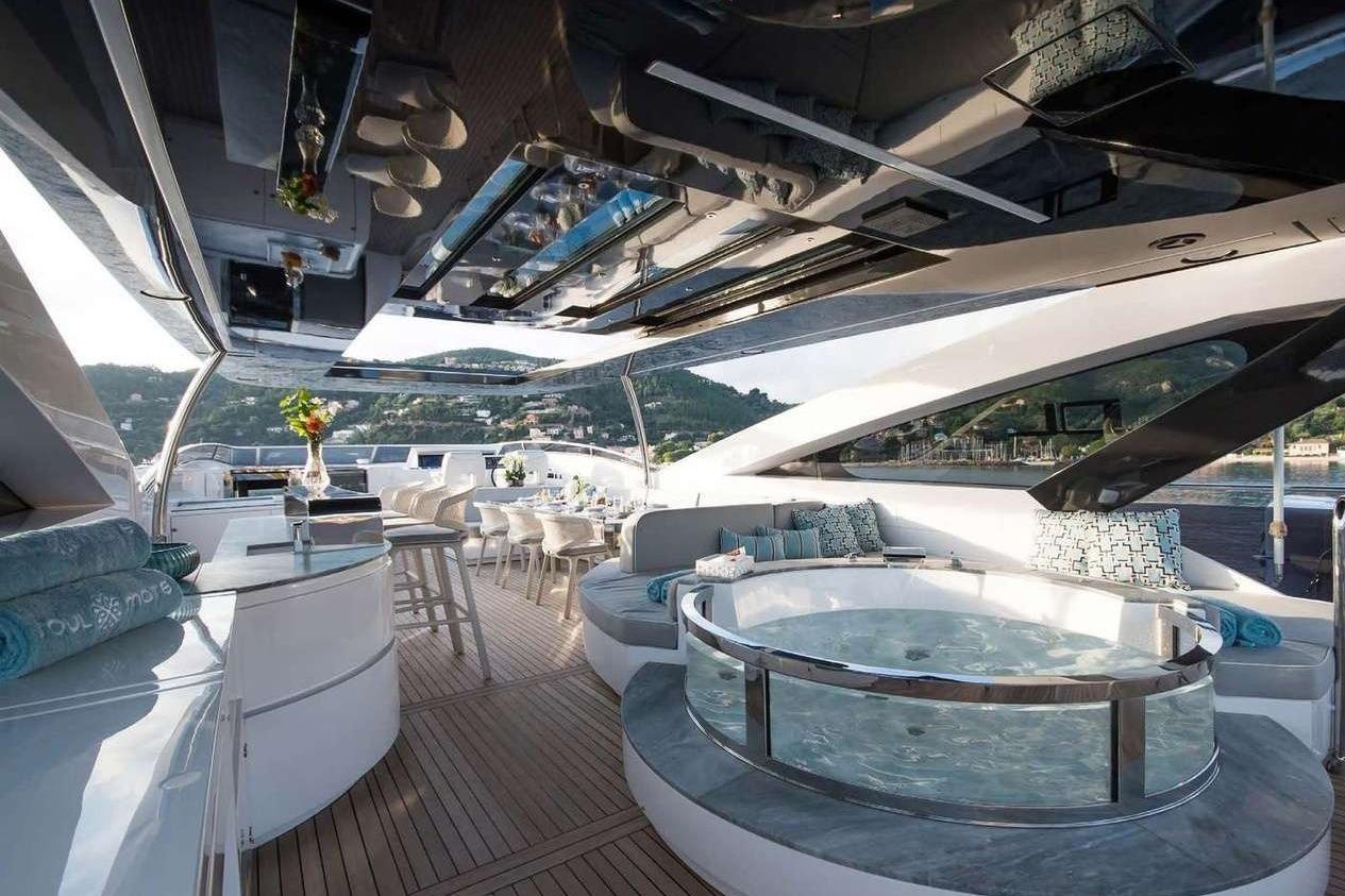 Верхняя палуба представляет собой великолепный сандек с большим обеденным столом, баром, джакузи, зоной для загара, флайбриджем и прямым доступом к капитанскому мостика.