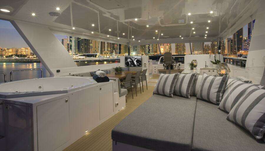 Просторный флайбридж: обеденная зона на 18 персон, бар, BBQ-гриль и джакузи на 6 человек
