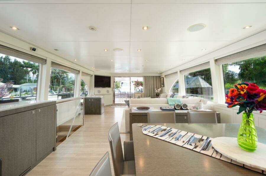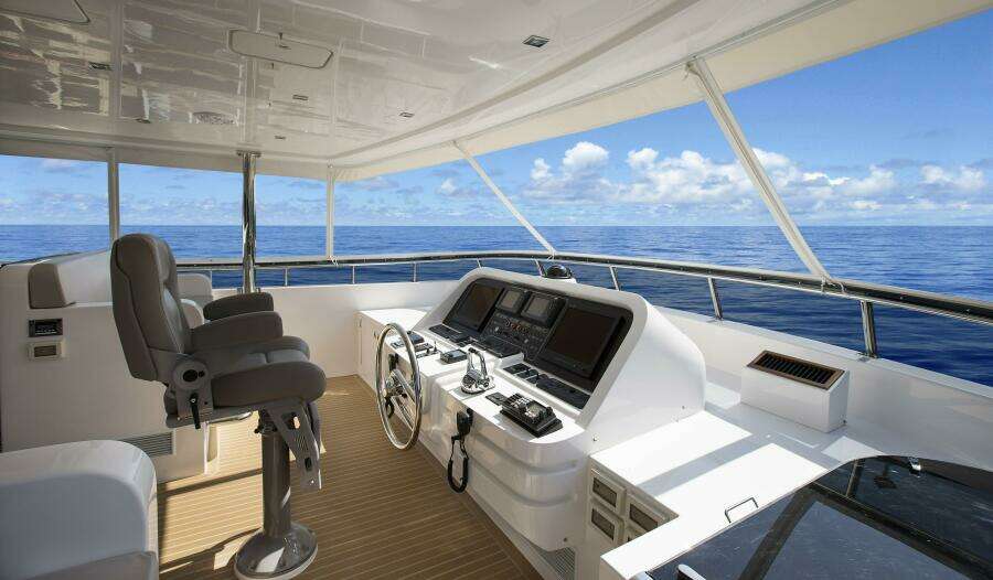Сверху — впечатляющий флайбридж для развлечений. Приподнятый пост управления обеспечивает отличную обзорность; рядом — диваны, ориентированные по ходу. Несколько ступеней вниз — тикованная зона с полноценным баром с гранитными столешницами, большим столом на 18 персон и джакузи на 6 человек в корме. На палубе тендера размещён AB tender, при этом остаётся место для водных игрушек.