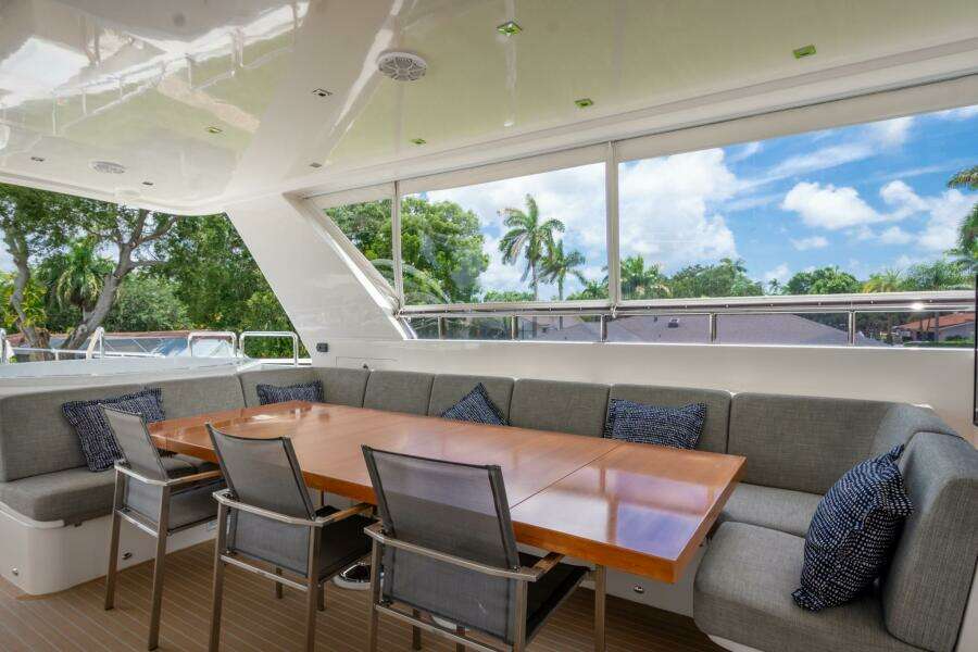 Обзор (Walk-through)Посадка с кормовой палубы — вас встречает просторная зона отдыха, идеально подходящая для лёгкого обеда или коктейлей на якоре. Тиковые стулья и кастомный стол из твёрдых пород дерева добавляют тепла и фактуры этому гостеприимному пространству.
