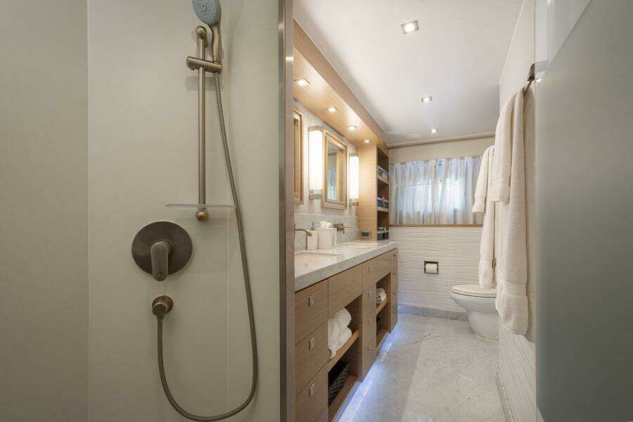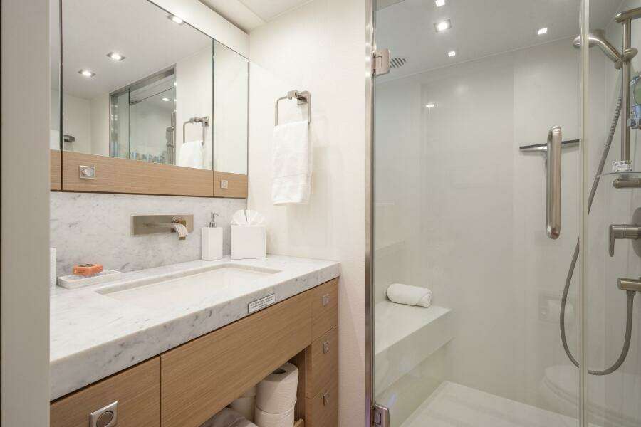 По правому борту кастомная лестница в ограждении из нержавеющей стали и стекла ведёт вниз в мастер-каюту во всю ширину корпуса. Это тихое приватное пространство с бортовыми окнами, встроенной банкеткой и просторным санузлом с двумя раковинами Kohler и большой душевой walk-in, облицованной плиткой Porcelanosa.