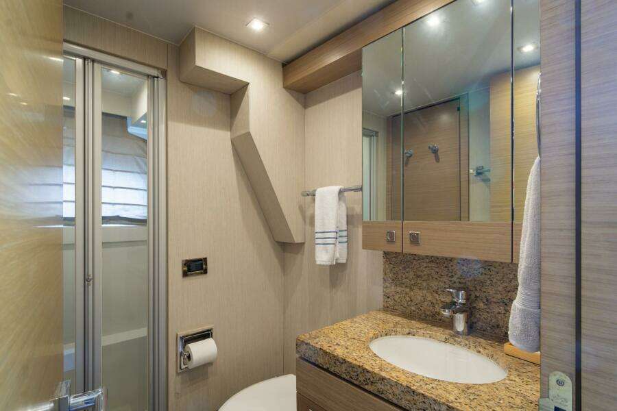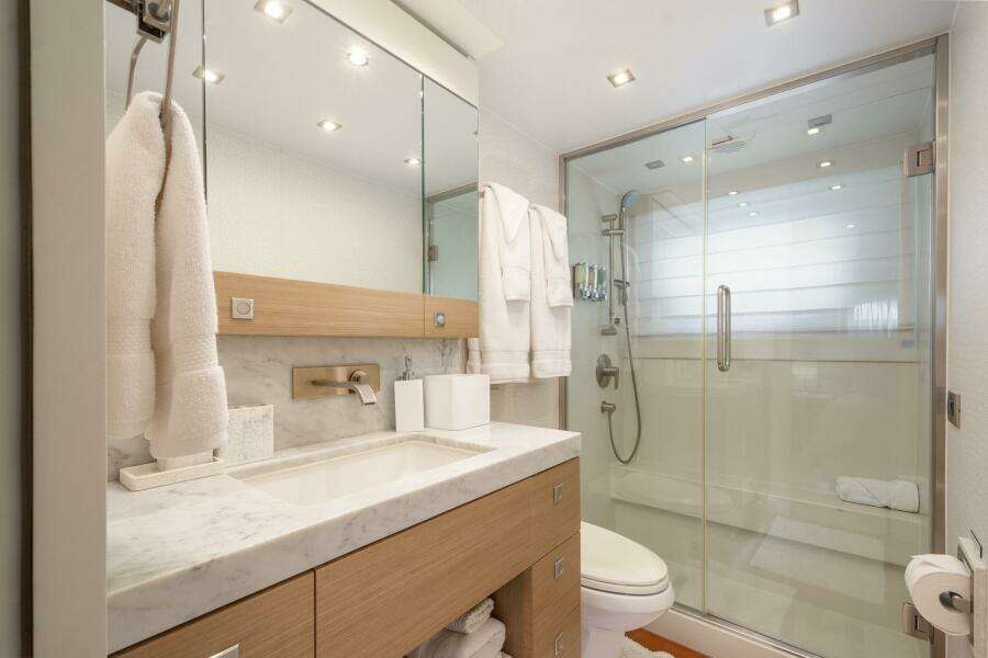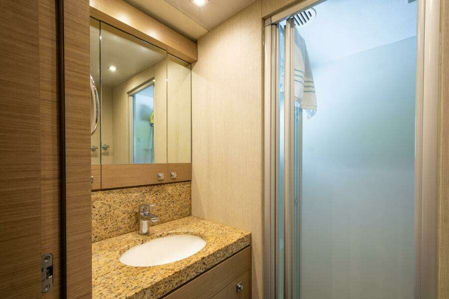 ОсобенностиМастер-каюта во всю ширину корпуса: две раковины и большая душевая walk-in
