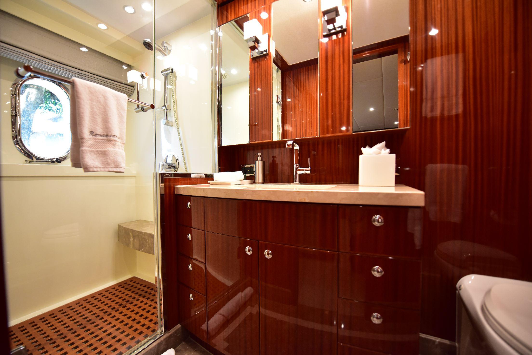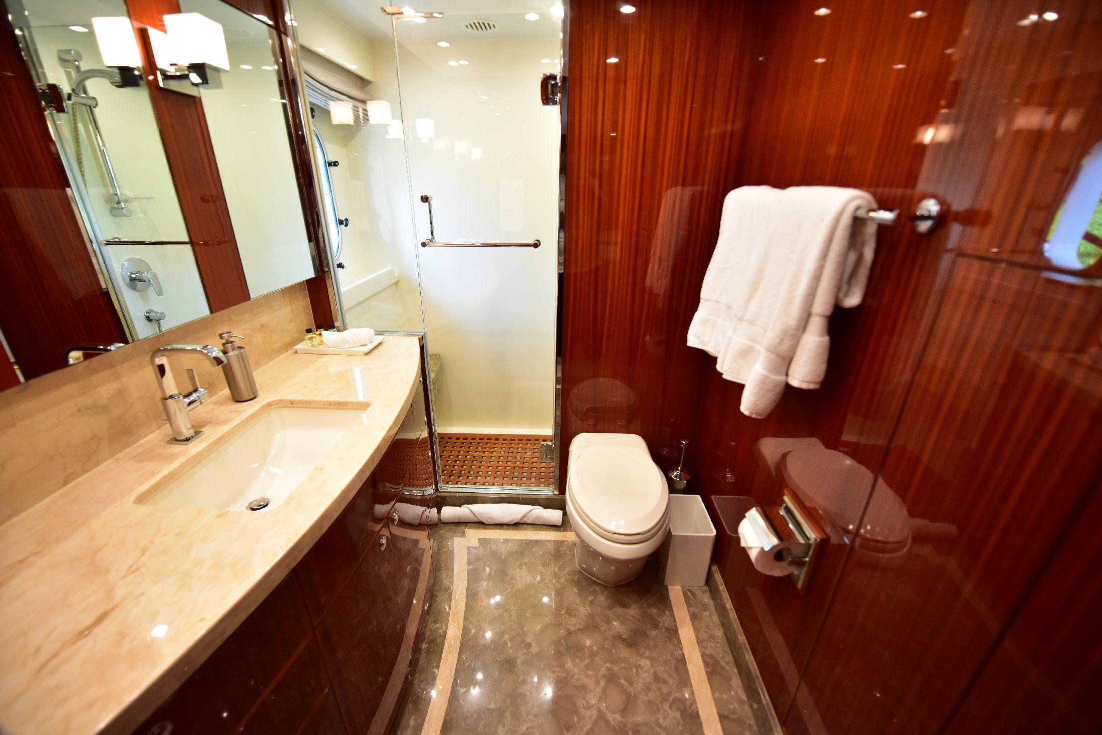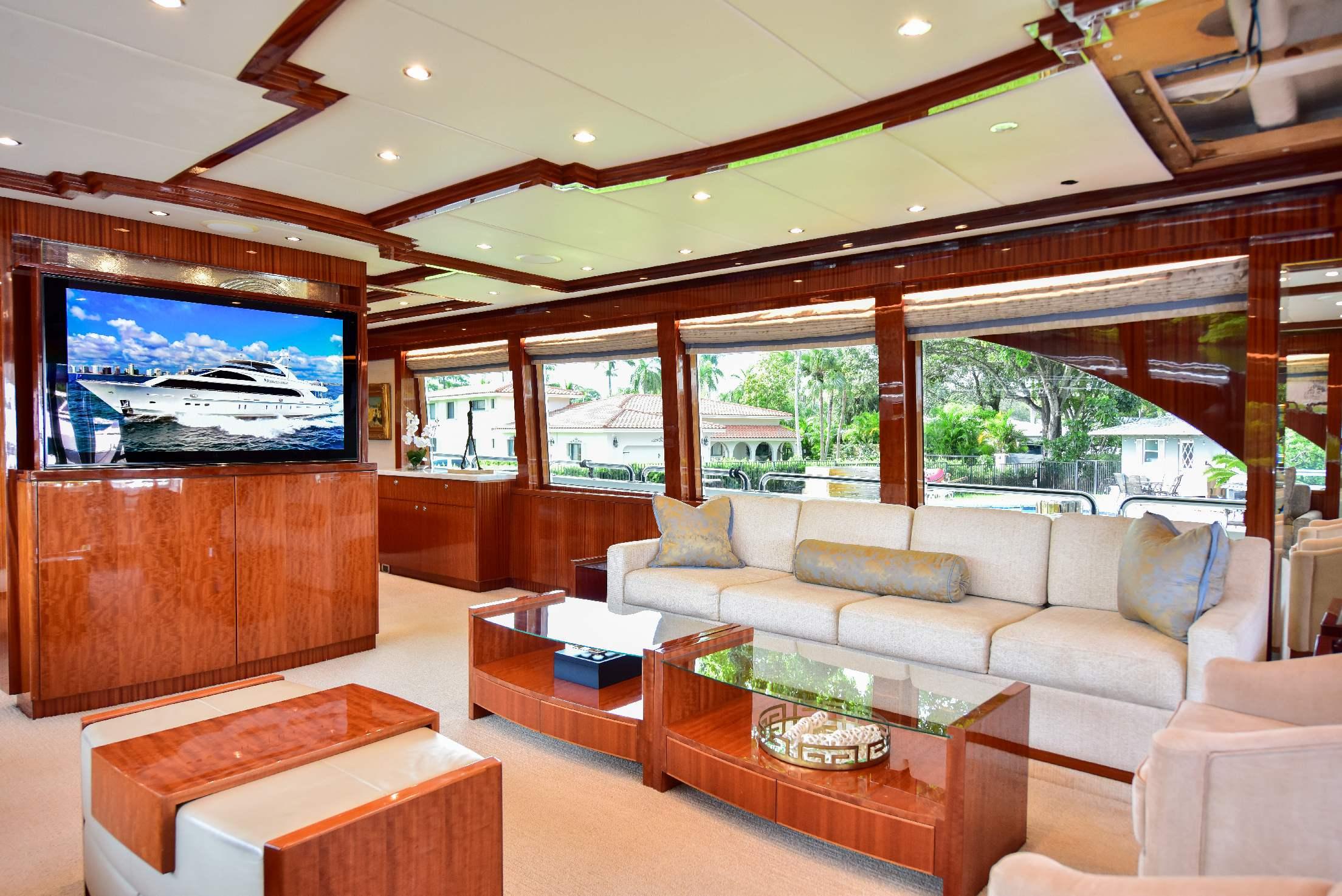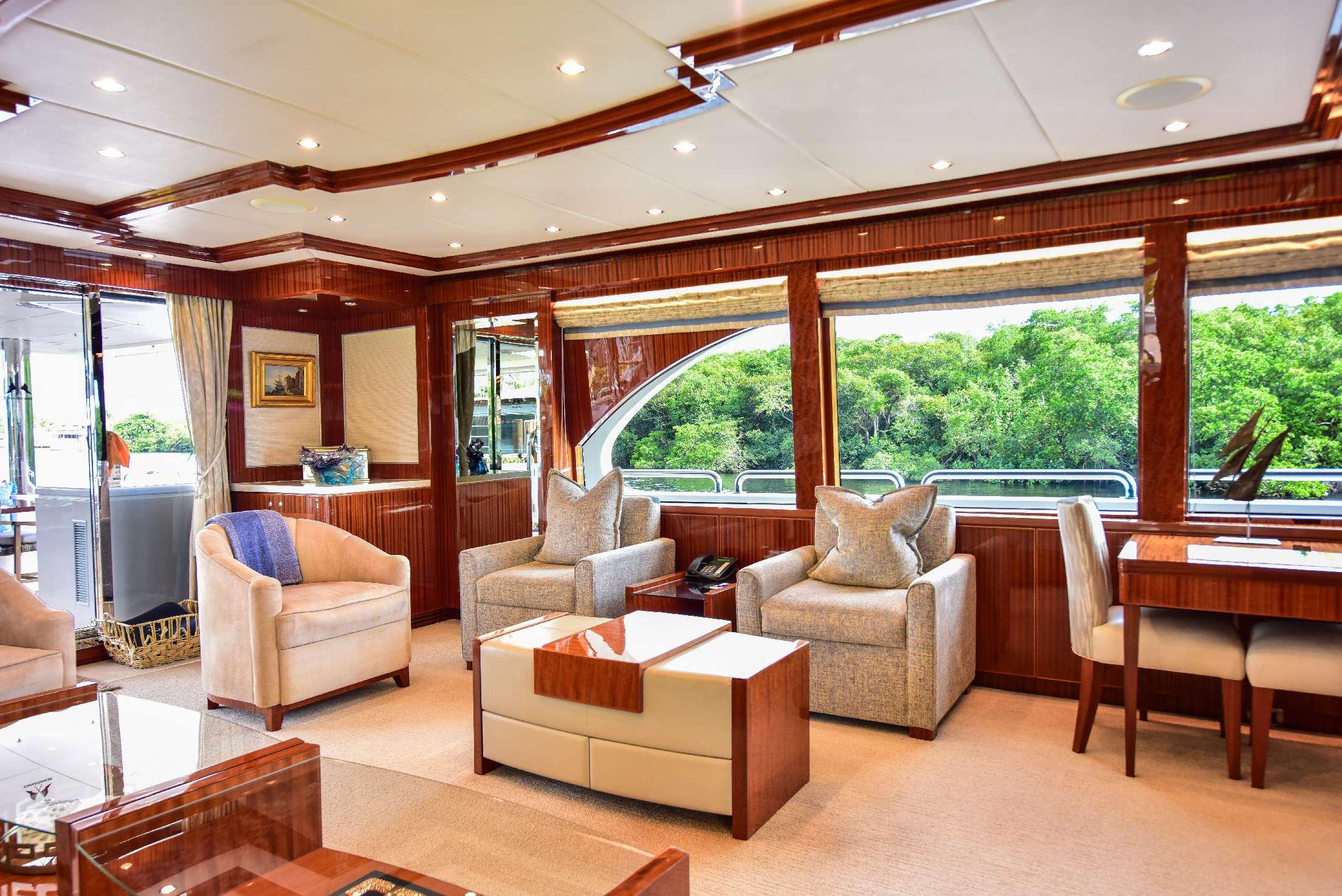 На борту расположены пять кают, включая мастер-каюту на главной палубе. Салон предлагает просторную зону отдыха с диваном, креслами, журнальными столиками и мультимедийной системой. В носовой части салона находится формальная обеденная зона, отделённая от лаунджа частичной перегородкой с декоративным стеклянным рисунком. Большие окна по периметру наполняют пространство естественным светом, а ближе к проходу расположена элегантная дневная туалетная комната.