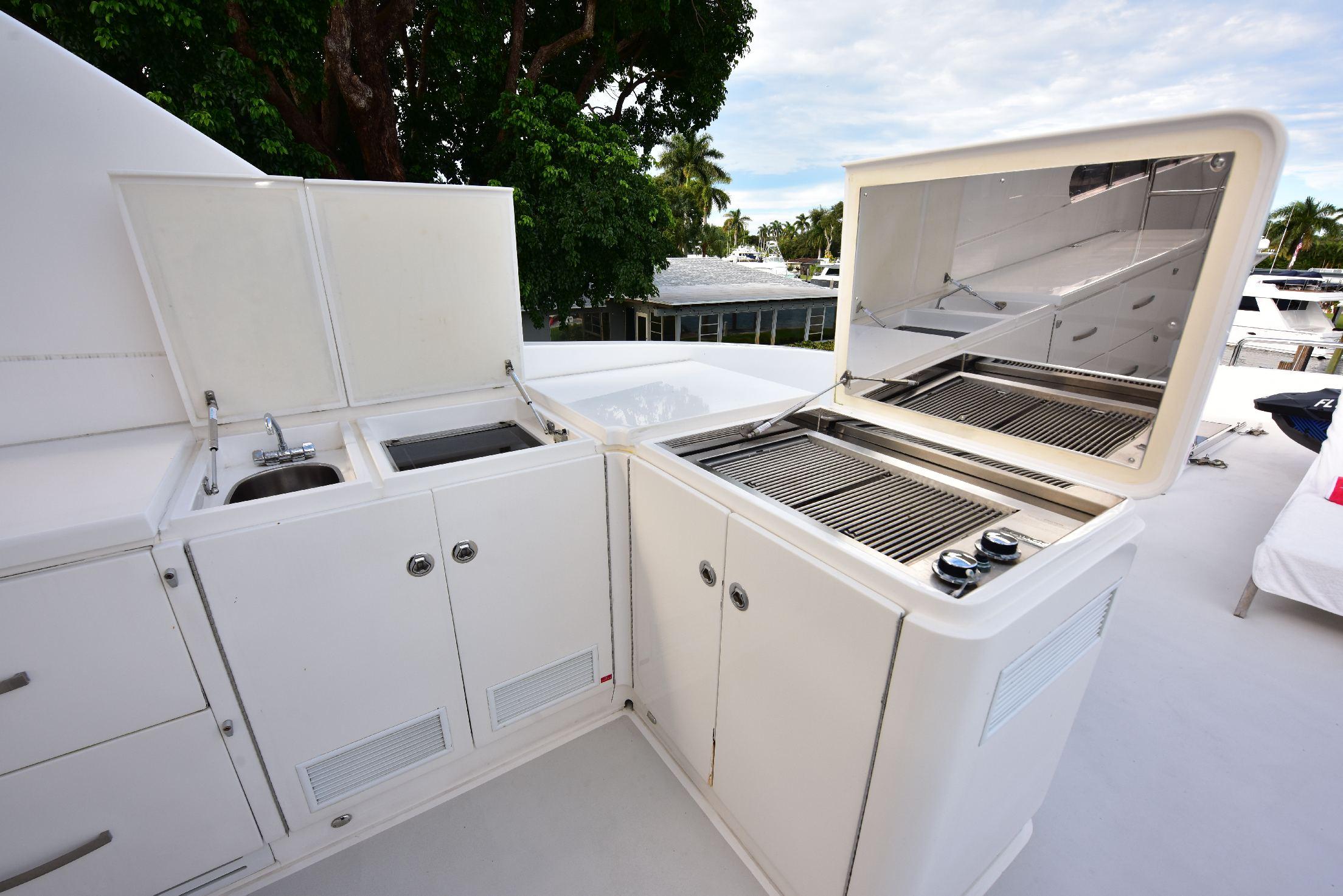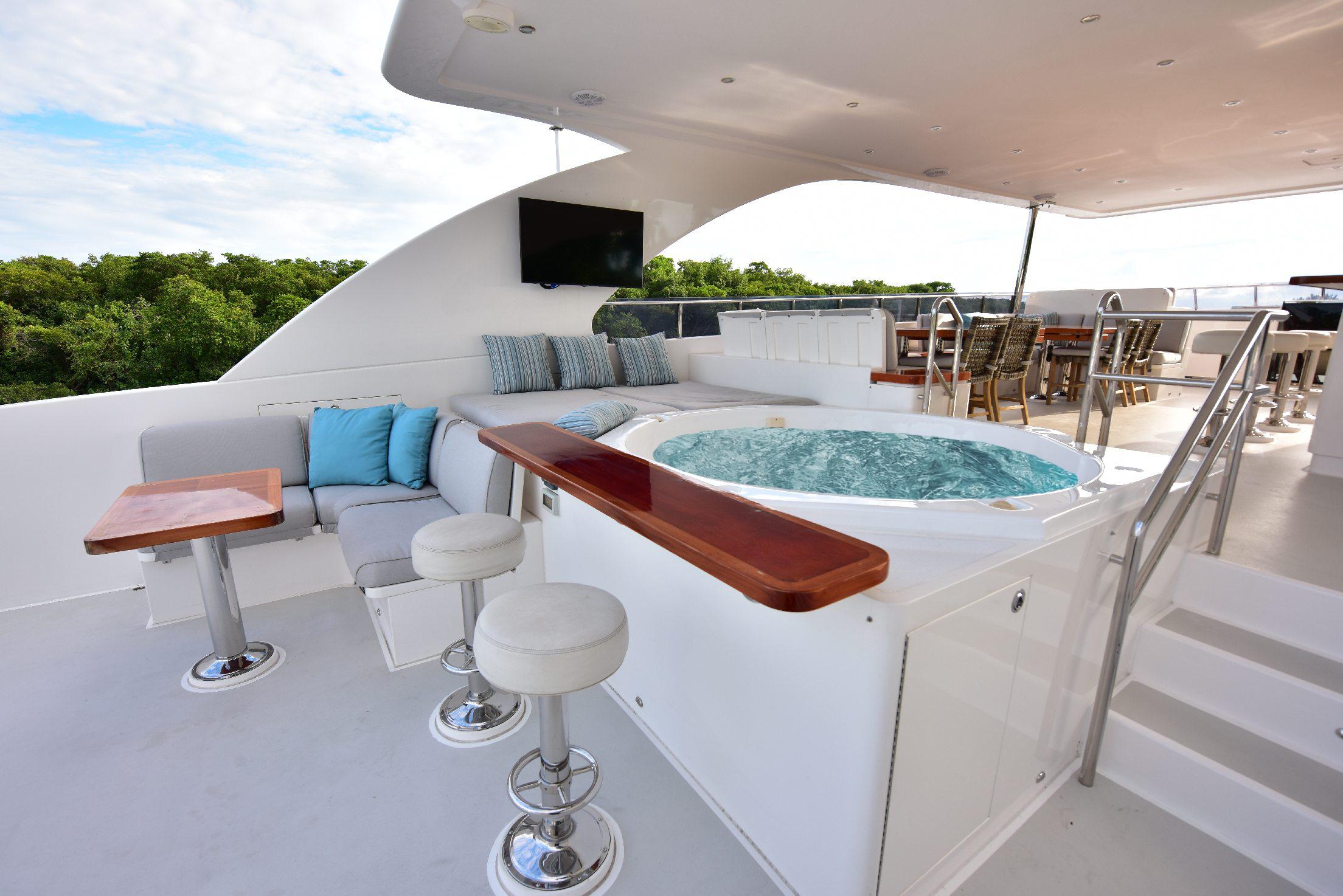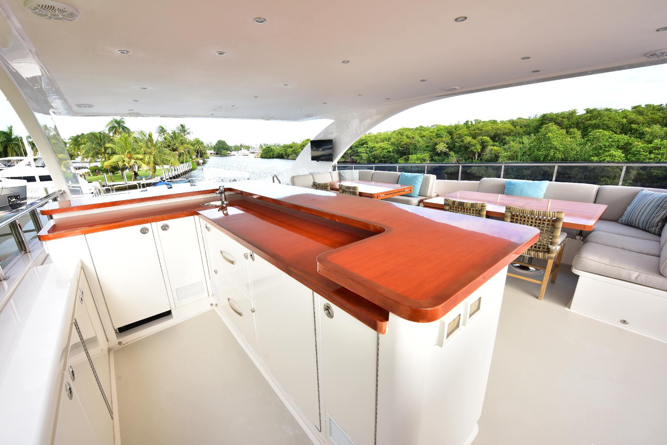 Сан-дек — превосходное пространство для приёма гостей и общения. Здесь расположены обеденная зона на открытом воздухе, большой мокрый бар с барными стульями, роскошное джакузи, большая солнечная лежанка, коктейльный столик, шезлонги и жёсткая крыша для защиты от солнца. По правому борту находится «вторая кухня» яхты — современная газовая зона барбекю с двумя грилями и двойными холодильниками/морозильниками Sub-Zero.