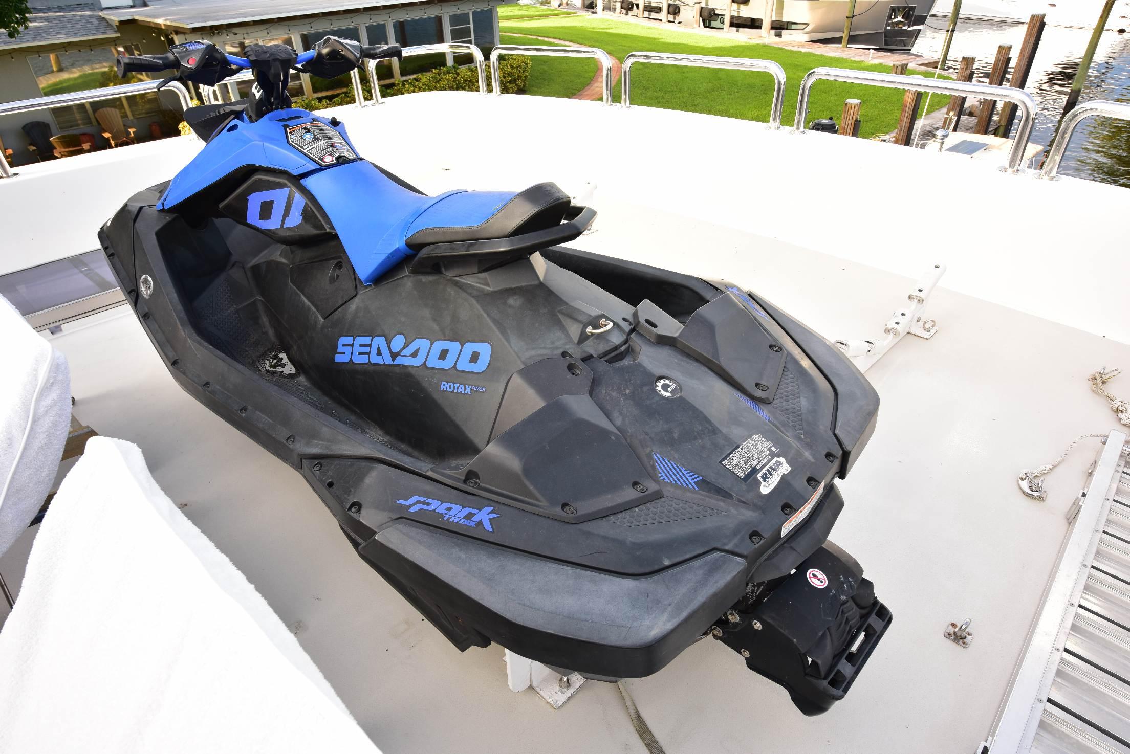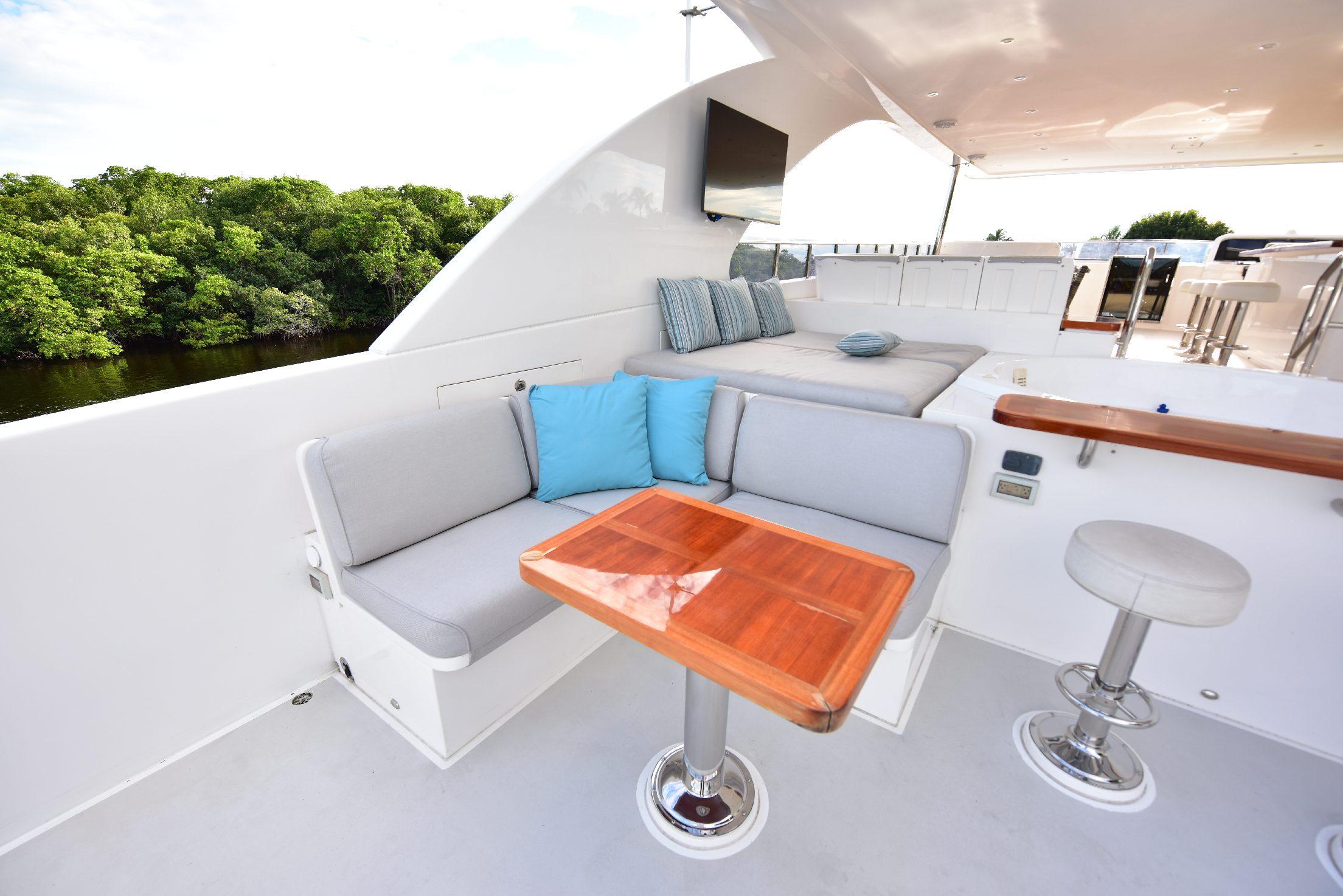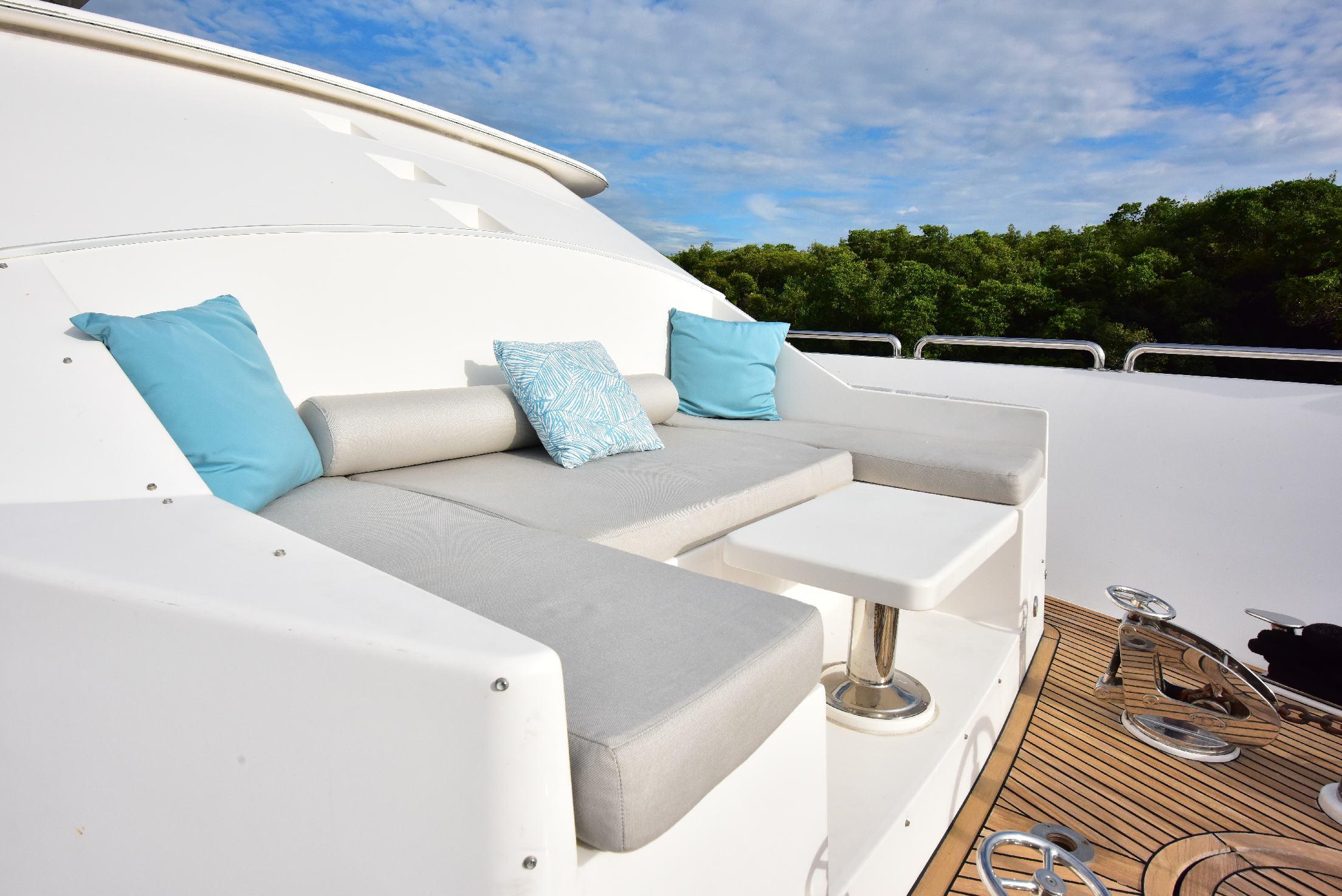 Сан-дек — превосходное пространство для приёма гостей и общения. Здесь расположены обеденная зона на открытом воздухе, большой мокрый бар с барными стульями, роскошное джакузи, большая солнечная лежанка, коктейльный столик, шезлонги и жёсткая крыша для защиты от солнца. По правому борту находится «вторая кухня» яхты — современная газовая зона барбекю с двумя грилями и двойными холодильниками/морозильниками Sub-Zero.