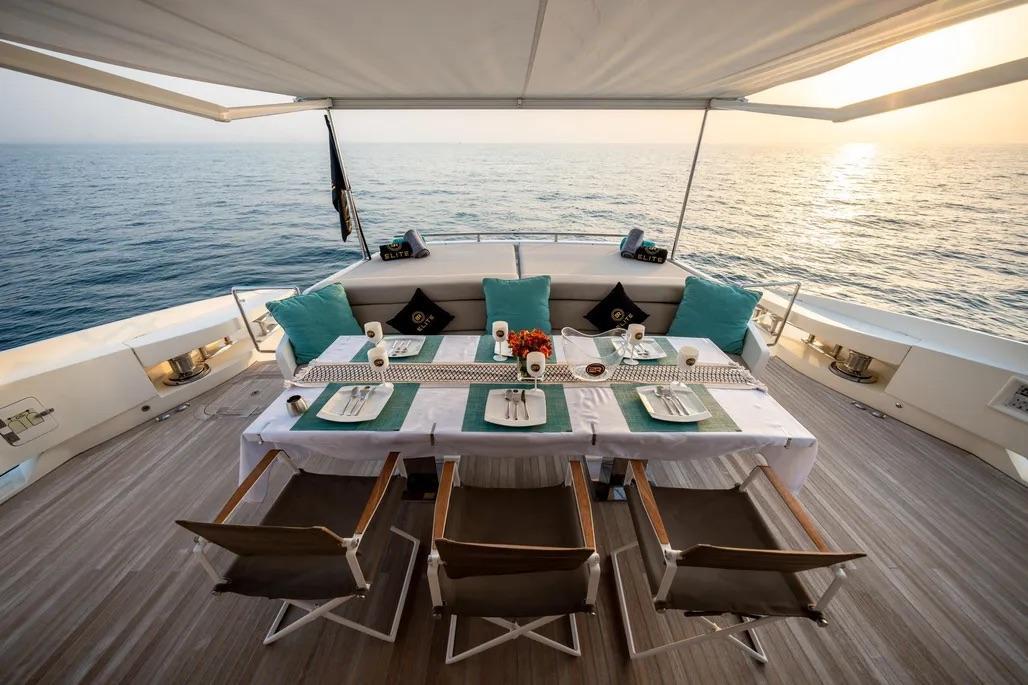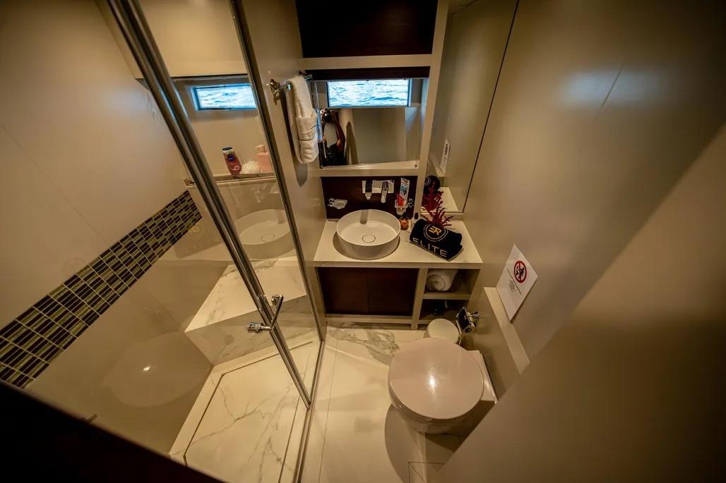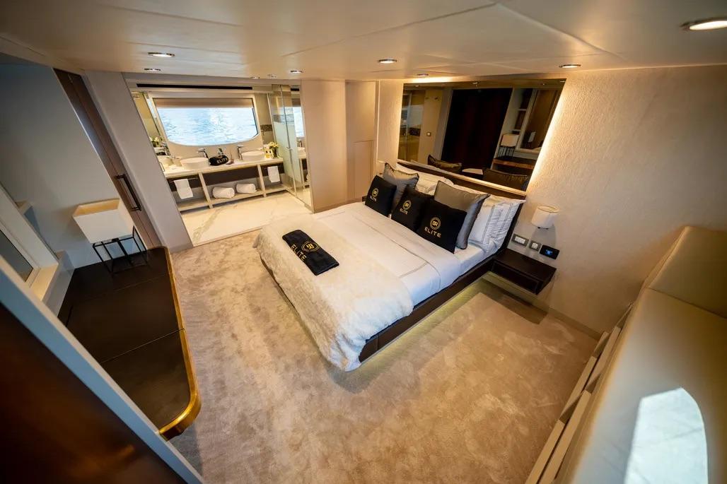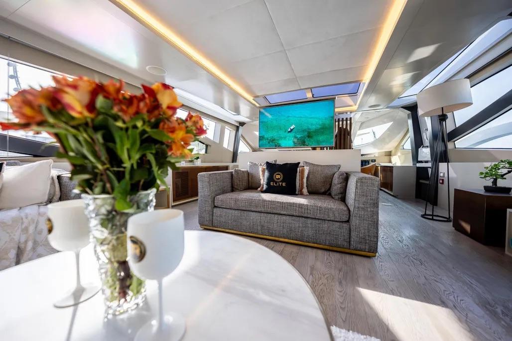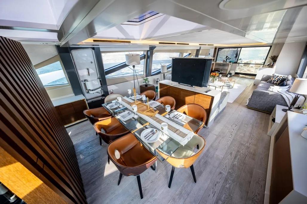Салон с панорамным остеклением плавно переходит в просторную мастер-каюту во всю ширину корпуса и три гостевые каюты с ванными комнатами. Камбуз, расположенный на нижней палубе, остаётся вне поля зрения гостей, а отдельные каюты экипажа обеспечивают безупречный сервис. Кондиционирование, горячая вода и автономное водоснабжение от опреснителя гарантируют комфорт даже во время продолжительных переходов.