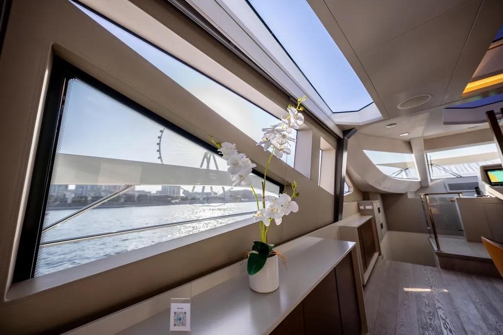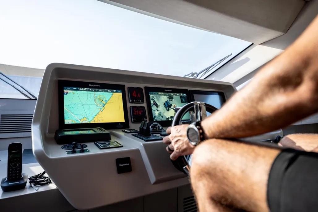 Все посты управления интуитивно понятны. Электроника класса Garmin передаёт данные на повторители у обоих рулевых постов. Носовое и кормовое подруливающие устройства, а также джойстиковое управление обеспечивают точный контроль на малых скоростях. Тиковые палубы и мягкие зоны отдыха в кокпите располагают к долгим часам релаксации, а гидравлический трап и купальная лестница позволяют легко освежиться в воде.