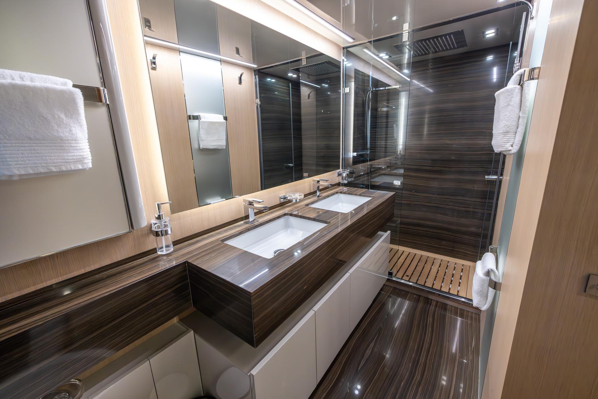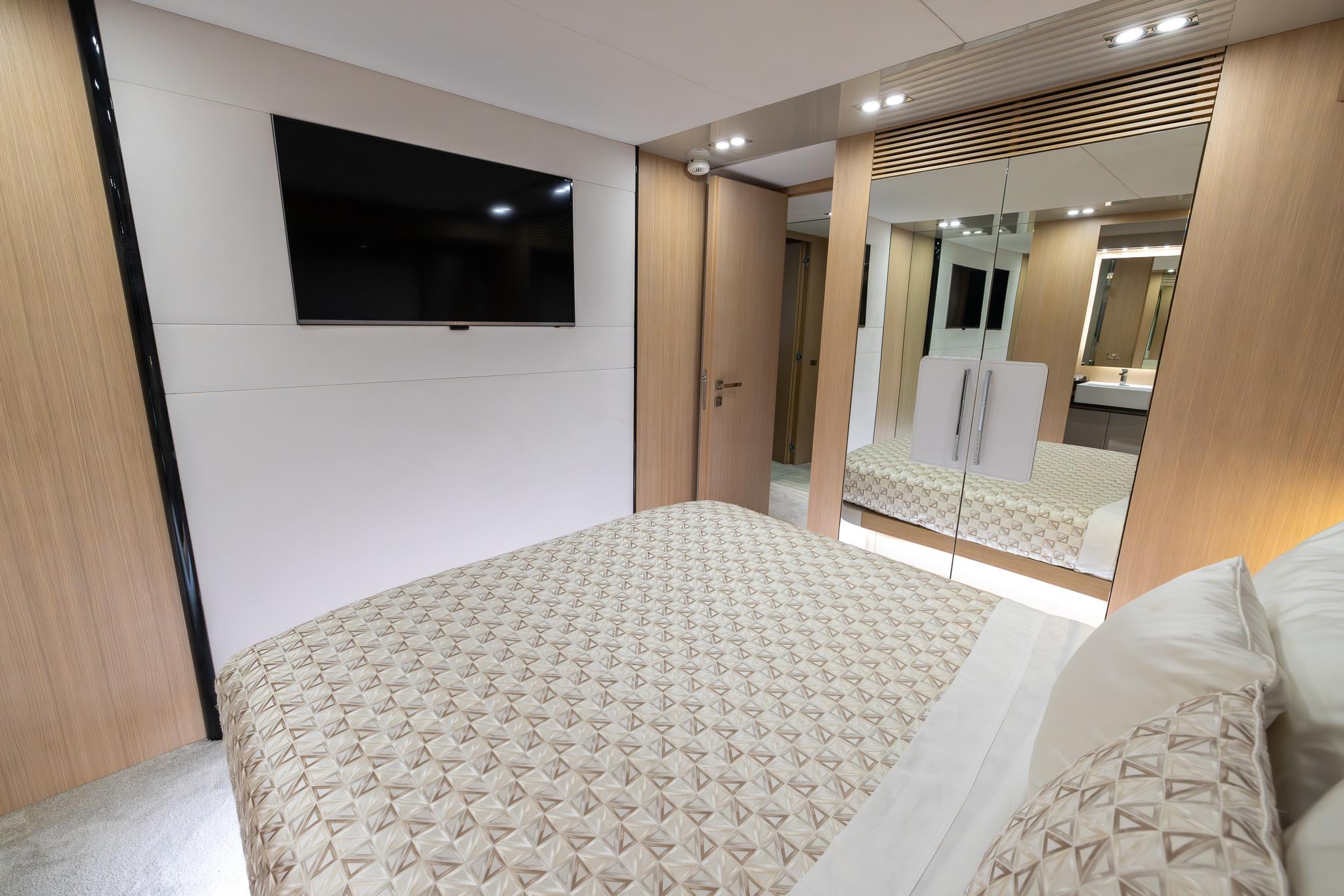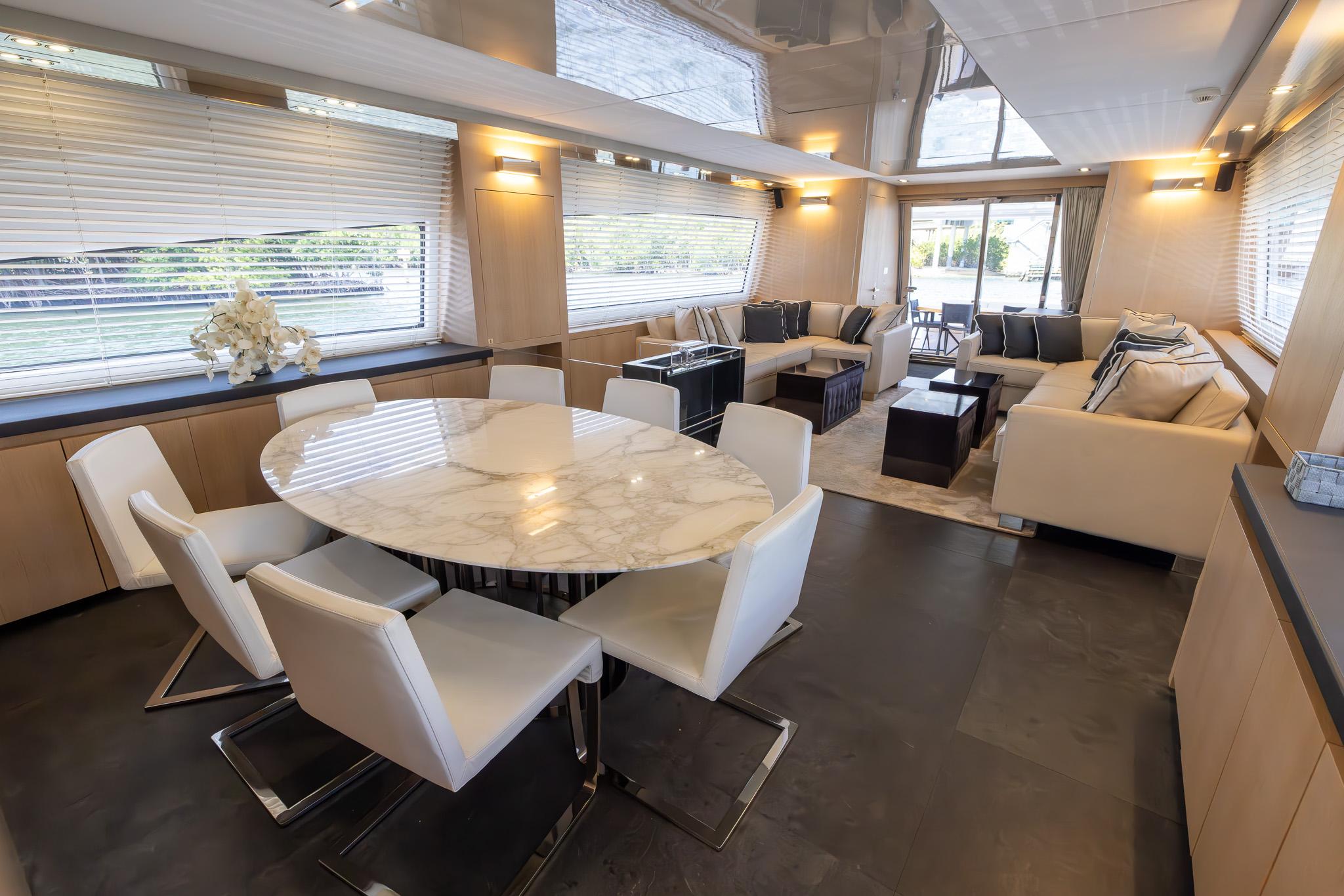При входе в салон по правому борту расположен дневной санузел. По левому борту — холодильник и льдогенератор. Далее по курсу находятся два противоположных дивана L-образной формы с журнальными столиками. По правому борту — лестница, ведущая к двум гостевым каютам и мастер-каюте на всю ширину корпуса. В носовой части размещена обеденная зона на 8 гостей и телевизор Samsung диагональю 55 дюймов.