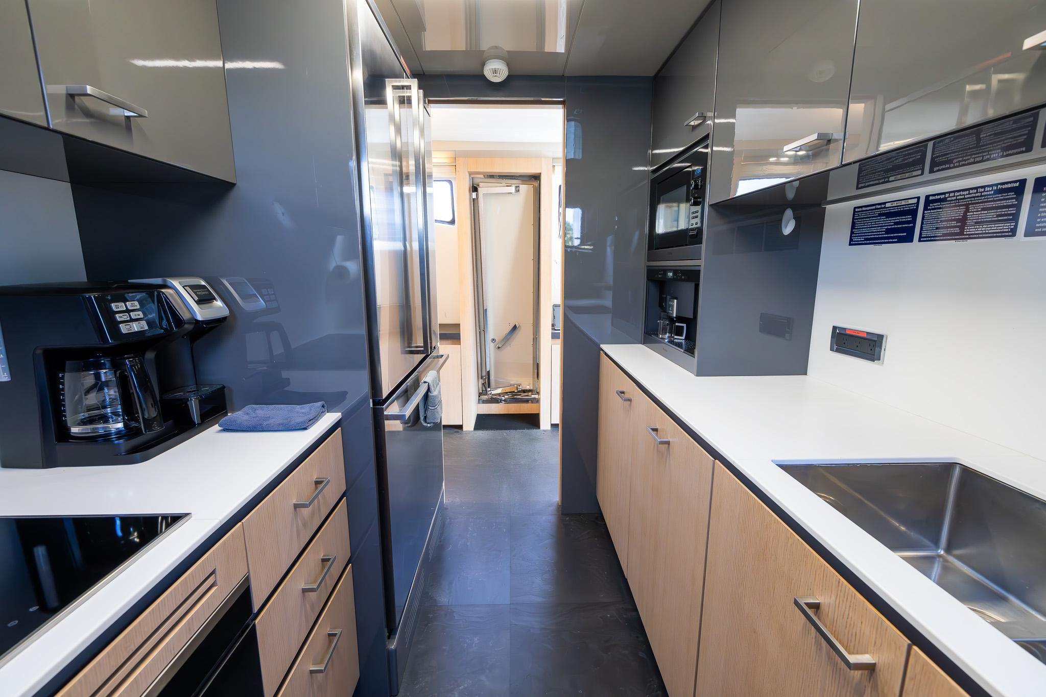 Перед обеденной зоной по правому борту расположен камбуз, оснащённый техникой Miele. Перед камбузом находится рулевая рубка с постом управления по левому борту, а также диванеткой и телевизором Samsung по правому борту.