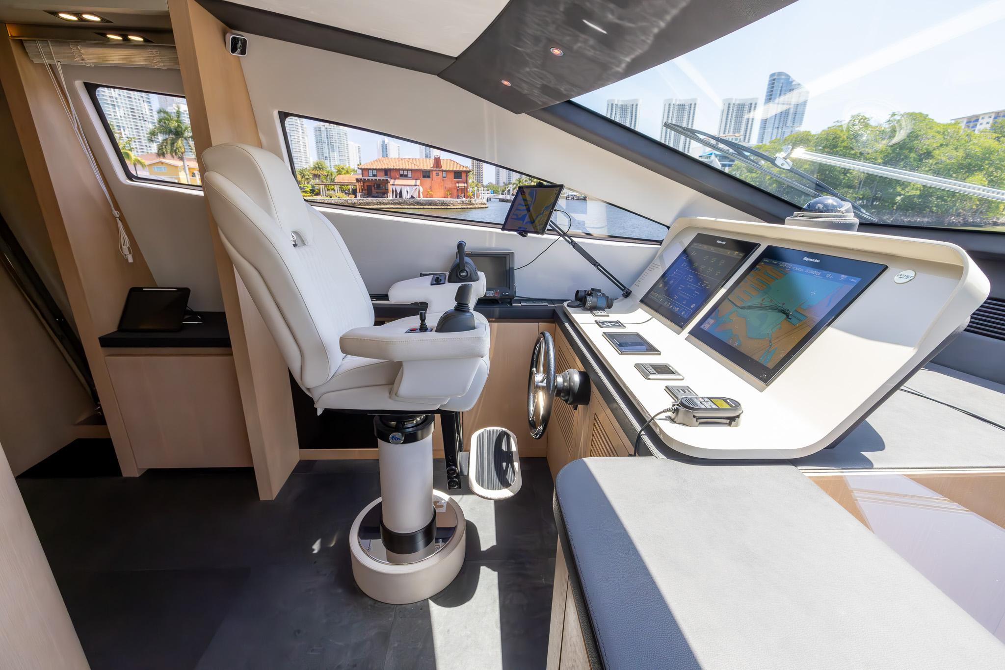 Флайбридж оснащён жёсткой крышей в стиле радарной арки с раздвижным люком из чёрной ткани. В центральной и носовой части расположен пост управления с посадочными местами по левому и правому борту. Позади поста управления по левому борту установлен шкаф с грилем и индукционной плитой, местами для хранения и холодильником снизу. По правому борту расположен шкаф с разделочной доской, раковиной и постом управления Volvo. Ниже размещены льдогенератор, посудомоечная машина и места для хранения. Далее к корме находится обеденная зона по левому борту и зона отдыха. Небольшой лежак для загара расположен по правому борту. Вся зона флайбриджа окружена стеклянным ограждением с поручнями из нержавеющей стали.